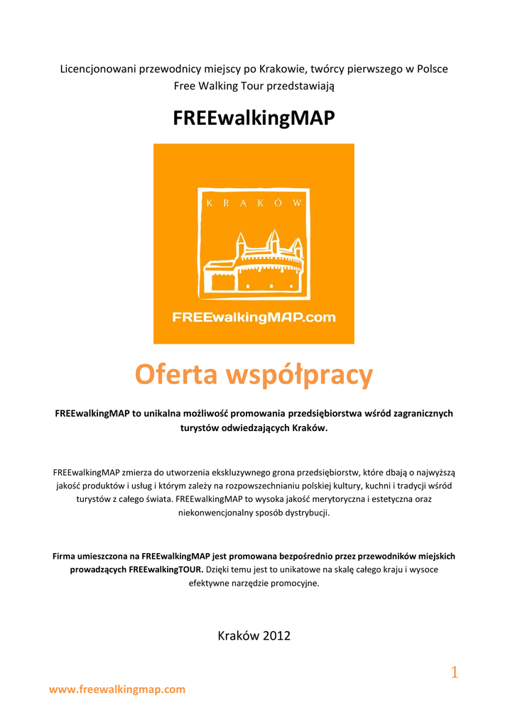 Licencjonowani przewodnicy miejscy po Krakowie, twórcy pierwszego w Polsce Free Walking Tour przedstawiają FREEwalkingMAP Oferta współpracy FREEwalkingMAP to unikalna możliwość promowania przedsiębiorstwa wśród zagranicznych turystów odwiedzających Kraków. FREEwalkingMAP zmierza do utworzenia ekskluzywnego grona przedsiębiorstw, które dbają o najwyższą jakość produktów i usług i którym zależy na rozpowszechnianiu polskiej kultury, kuchni i tradycji wśród turystów z całego świata. FREEwalkingMAP to wysoka jakość merytoryczna i estetyczna oraz niekonwencjonalny sposób dystrybucji. Firma umieszczona na FREEwalkingMAP jest promowana bezpośrednio przez przewodników miejskich prowadzących FREEwalkingTOUR. Dzięki temu jest to unikatowe na skalę całego kraju i wysoce efektywne narzędzie promocyjne. Kraków 2012 1 www.freewalkingmap.com Co to jest FREEwalkingMAP? FREEwalkingMAP to nowy projekt przewodników FREEwalkingTOUR. Jest on wynikiem kilkuletniego doświadczenia w pracy z zagranicznymi turystami przyjeżdżającymi do Krakowa. Pomysł narodził się jako naturalna odpowiedź na potrzebę uczestników FREEwalkingTOUR – przewodnicy bardzo często byli proszeni o rekomendacje wartościowych miejsc. Polecali te lokale, które sami znali i odwiedzali, które były miejscami unikalnymi - miały polską lub lokalną specyfikę, a jednocześnie pozostawały przystępne cenowo. Mapki zrobione amatorsko (kserokopie), aby ułatwić turystom znalezienie rekomendowanych miejsc okazały się wielkim sukcesem. Obcokrajowcy mieszkający w Krakowie wracali na wycieczki kilkukrotnie, aby poprosić o tę czarno-białą, prowizoryczną mapkę. Okazało się też, że mapka zaczęła funkcjonować jako wartościowe źródło informacji nawet wśród pracowników informacji turystycznej. Jednym słowem, udało się zdobyć zaufanie klientów doborem wartościowych miejsc. To właśnie odróżnia FREEwalkingMAP od większości podobnych map używanych w Krakowie. Wiarygodność i staranność doboru polecanych miejsc jest kluczem do sukcesu naszej mapy. Pragnąc rozwijać tę inicjatywę we FREEwalkingMAP umieścimy miejsca, które promują obecną na terenie Polski kulturę, tradycję, kuchnię czy styl życia. Do projektu zapraszamy firmy, które spełniają powyższe kryteria, to znaczy mają regionalny charakter. Ekskluzywność tej grupy firm będzie gwarancją dla turystów, że polecane miejsca są godne odwiedzenia. Oprócz miejsc typowo polskich, na FREEwalkingMAP znajdą się także inne praktyczne informacje, które są przydatne dla turystów spędzającym wakacje w Krakowie. Na mapie umieszczonych zostanie również kilka miejsc kulturowo neutralnych, jednak pomocnych dla naszych klientów. Co bardzo istotne, miejsca neutralne będą miały na celu zaspokajanie potrzeb klientów - nie kreowanie ich. Oprócz wersji papierowej FREEwalkingMAP, którą otrzyma każdy turysta zwiedzający Kraków w ramach FREEwalkingTOUR, przygotowana będzie także strona internetowa o tej samej zawartości (FREEwalkingMAP.com). Zapewnimy również możliwość otrzymania naszej mapy online i jej wydruku przed przyjazdem do Krakowa. Przewodnikom FREEwalkingTOUR zależy na dostarczaniu klientom najwyższej jakości usług – stąd też pomysł, aby z ofertą współpracy przy tworzeniu FREEwalkingMAP zwrócić się do rekomendowanych miejsc. Tylko dzięki wspólnemu działaniu FREEwalkingMAP będzie mogła zyskać atrakcyjną dla turystów formę. Wygląd FREEwalkingMAP: Mapa będzie obejmować obszar krakowskiego Starego Miasta, Kazimierza oraz północnej części Podgórza. Będzie wydrukowana w kolorze, na papierze formatu A3, który po złożeniu będzie miał kształt kwadratu o wymiarach 10 cm x 10 cm. Na odwrocie mapy znajdą się praktyczne informacje na temat zwiedzania Krakowa, przygotowane przez przewodników FREEwalkingTOUR. Będą one obejmowały rozmówki polsko-angielskie, krótkie przedstawienie tradycji krakowskich oraz kuchni polskiej i regionalnej. 2 www.freewalkingmap.com Język FREEwalkingMAP: FREEwalkingMAP, a także strona internetowa www.FREEwalkingMAP.com będą stworzone w języku angielskim. Jest to język, w którym prowadzone są wycieczki w ramach FREEwalkingTOUR, a także w którym przewodnicy porozumiewają się z turystami. FREEwalkingMAP jest więc skierowana do klientów z całego świata znających język angielski. Nakład FREEwalkingMAP: Pierwsza edycja FREEwalkingMAP będzie przygotowana w nakładzie 5000 sztuk. Przewidywany czas jej dystrybucji to około 3 miesiące (od lutego do kwietnia 2012 roku). W planach jest przygotowywanie FREEwalkingMAP cyklicznie – nawet cztery razy w roku. Zawierałaby ona wtedy także informacje na temat sezonowych imprez odbywających się w Krakowie. Dystrybucja FREEwalkingMAP: Sposób dystrybucji FREEwalkingMAP jest niezwykły – będzie ona przekazywana z rąk przewodników FREEwalkingTOUR prosto do rąk turystów. Żaden inny sposób dystrybucji nie gwarantuje tak skutecznego przekazu – dając turyście mapę, przewodnik osobiście rekomenduje wszystkie zaznaczone na niej miejsca. Sama mapa nie jest kolejną ulotką promocyjną, które zalegają w hostelach i Punktach Informacji Turystycznej. Współudział partnerów w tworzeniu FREEwalkingMAP pozwoli na przygotowanie jej w wysokiej jakości i atrakcyjnej formie, co zagwarantuje jej powodzenie wśród turystów. Dobór firm zaznaczonych na FREEwalkingMAP: Na FREEwalkingMAP znajdą się przede wszystkim te miejsca, które oferują turystom coś, co trudno znaleźć w Pradze, Budapeszcie, Berlinie, czyli w miejscach odwiedzanych przez klientów FREEwalkingTOUR. Przewodnicy krakowskiego FREEwalkingTOUR będą zapraszać do projektu po jednym miejscu z segmentu na dzielnicę. Oznacza to, że na mapie znajdą się tylko dwie konkurencyjne firmy – jedna dla Kazimierza, a druga dla Starego Miasta. Turyści chcący np. spróbować lokalnego piwa, będą mi