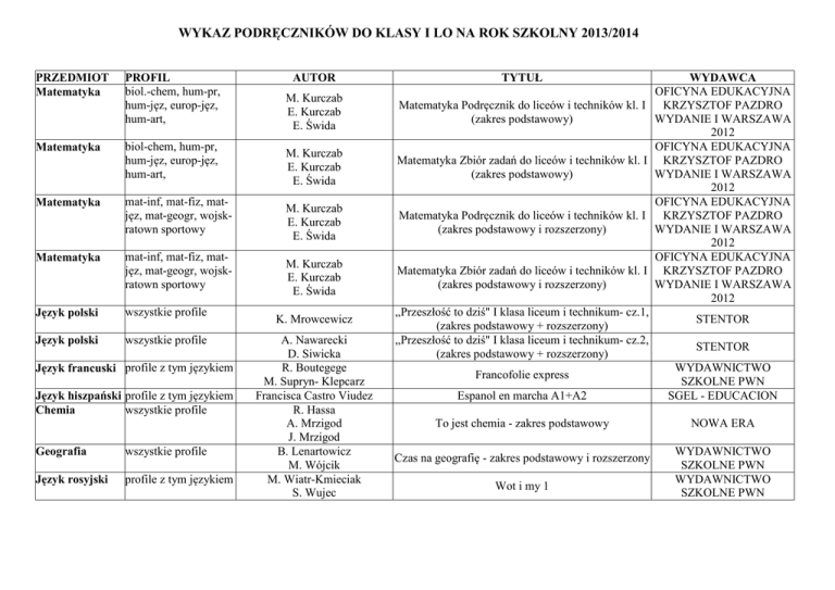 WYKAZ PODRĘCZNIKÓW DO KLASY I LO NA ROK SZKOLNY 2013/2014 PRZEDMIOT Matematyka Matematyka Matematyka Matematyka PROFIL biol.-chem, hum-pr, hum-jęz, europ-jęz, hum-art, biol-chem, hum-pr, hum-jęz, europ-jęz, hum-art, mat-inf, mat-fiz, matjęz, mat-geogr, wojskratown sportowy mat-inf, mat-fiz, matjęz, mat-geogr, wojskratown sportowy Język polski wszystkie profile Język polski wszystkie profile Język francuski profile z tym językiem Język hiszpański profile z tym językiem wszystkie profile Chemia Geografia wszystkie profile Język rosyjski profile z tym językiem AUTOR TYTUŁ M. Kurczab E. Kurczab E. Świda Matematyka Podręcznik do liceów i techników kl. I (zakres podstawowy) M. Kurczab E. Kurczab E. Świda Matematyka Zbiór zadań do liceów i techników kl. I (zakres podstawowy) M. Kurczab E. Kurczab E. Świda Matematyka Podręcznik do liceów i techników kl. I (zakres podstawowy i rozszerzony) M. Kurczab E. Kurczab E. Świda Matematyka Zbiór zadań do liceów i techników kl. I (zakres podstawowy i rozszerzony) K. Mrowcewicz A. Nawarecki D. Siwicka R. Boutegege M. Supryn- Klepcarz Francisca Castro Viudez R. Hassa A. Mrzigod J. Mrzigod B. Lenartowicz M. Wójcik M. Wiatr-Kmieciak S. Wujec „Przeszłość to dziś" I klasa liceum i technikum- cz.1, (zakres podstawowy + rozszerzony) „Przeszłość to dziś" I klasa liceum i technikum- cz.2, (zakres podstawowy + rozszerzony) WYDAWCA OFICYNA EDUKACYJNA KRZYSZTOF PAZDRO WYDANIE I WARSZAWA 2012 OFICYNA EDUKACYJNA KRZYSZTOF PAZDRO WYDANIE I WARSZAWA 2012 OFICYNA EDUKACYJNA KRZYSZTOF PAZDRO WYDANIE I WARSZAWA 2012 OFICYNA EDUKACYJNA KRZYSZTOF PAZDRO WYDANIE I WARSZAWA 2012 STENTOR STENTOR Espanol en marcha A1+A2 WYDAWNICTWO SZKOLNE PWN SGEL - EDUCACION To jest chemia - zakres podstawowy NOWA ERA Francofolie express Czas na geografię - zakres podstawowy i rozszerzony Wot i my 1 WYDAWNICTWO SZKOLNE PWN WYDAWNICTWO SZKOLNE PWN Historia wszystkie profile WOS wszystkie profile Wiedza o kulturze wszystkie profile Elementy prawa humanistyczno prawny Język niemiecki profile z tym językiem Fizyka wszystkie profile oprócz: biol-chem, wojsk-ratown, sportowy biol-chem, wojskratown, sportowy wszystkie profile Informatyka wszystkie profile Biologia Biologia wszystkie profile Podstawy przedsiębiorczoś ci wszystkie profile Edukacja dla bezpieczeństwa Ratownictwo profile z tym przedmiotem dla klas o profilu językowym pozostałe profile S. Roszak J. Kłaczków Z. Smutek J. Maleska M.Bokiniec B. Forysiewicz J. Michałowski i in. Poznać przeszłość. Wiek XX - zakres podstawowy NOWA ERA Wiedza o społeczeństwie - zakres podstawowy Seria: Odkrywamy na nowo OPERON Spotkania z kulturą. Podręcznik do wiedzy o kulturze dla liceum i technikum NOWA ERA J. Musiałkiewicz Elementy prawa Wydawnictwo EKONOMIK G. Motta B. Ćwikowska Exakt1 język niemiecki dla szkół ponadgimnazjalnych LektorKlett E. Bonar W. Krzeszowiec-Jeleń S. Czachorowski Biologia na czasie - podręcznik dla szkół ponadgimnazjalnych - zakres podstawowy NOWA ERA M.Guzik, E. Jastrzębska i in. Praca zbiorowa pod red. M. Fijałkowskiej G. Koba Z. Makieła T. Rachwał Biologia na czasie 1 podręcznik dla liceum ogólnokształcącego i technikum - zakres rozszerzony Świat fizyki podręcznik dla szkół ponadgimnazjalnych - zakres podstawowy Informatyka dla szkół ponadgimnazjalnych - zakres podstawowy Krok w przedsiębiorczość - podręcznik do podstaw przedsiębiorczości dla szkół ponadgimnazjalnych zakres podstawowy NOWA ERA ZAMKOR MIGRA NOWA ERA M. Goniewicz A. W. Nowak-Kowal Z. Smutek Edukacja dla bezpieczeństwa Seria: Odkrywamy na nowo Wydawnictwo OPERON Pod red. J. Andresa Pierwsza pomoc i resuscytacja krążeniowooddechowa Polska Rada Resuscytacji J. Hughes Matura Explorer NOWA ERA B. Polit T. Falla Język angielski New Matura Solutions Oxford University Press P. A. Davis UWAGA: Poziom podręcznika jęz. angielskiego wybierany jest dla grupy na początku roku szkolnego po przeprowadzeniu testu kompetencji językowych Podręczniki będą zamawiane przez nauczyciela dla całej klasy, po atrakcyjnych rabatach. Język angielski WYKAZ PODRECZNIKÓW DO KLASY I TECHNIKUM NA ROK SZKOLNY 2013/2014 PRZEDMIOT Matematyka AUTOR TYTUŁ M. Kurczab E. Kurczab E. Świda Matematyka Podręcznik do liceów i techników kl. I (zakres podstawowy i rozszerzony) M. Kurczab E. Kurczab E. Świda Matematyka Zbiór zadań do liceów i techników kl. I (zakres podstawowy i rozszerzony) Matematyka Język polski Język polski Historia WOS Wiedza o kulturze Prawo Język niemiecki Język francuski Język rosyjski Biologia K. Mrowcewicz A. Nawarecki D. Siwicka S. Roszak J. Kłaczków Z. Smutek J. Maleska M.Bokiniec B. Forysiewicz J. Michałowski i in. „Przeszłość to dziś" I klasa liceum i technikum- cz.1 (zakres podstawowy i rozszerzony) „Przeszłość to dziś" I klasa liceum i technikum- cz.2 (zakres podstawowy i rozszerzony) WYDAWCA OFICYNA EDUKACYJNA KRZYSZTOF PAZDRO WYDANIE I WARSZAWA 2012 OFICYNA EDUKACYJNA KRZYSZTOF PAZDRO WYDANIE I WARSZAWA 2012 STENTOR STENTOR Poznać przeszłość. Wiek XX - zakres podstawowy NOWA ERA Wiedza o społeczeństwie - zakres podstawowy Seria: Odkrywamy na nowo OPERON Spotkania z kulturą. Podręcznik do wiedzy o kulturze dla liceum i technikum NOWA ERA J. Musiałkiewicz Elementy prawa WYDAWNICTWO EKONOMIK G. Motta B. Ćwikowska R. Boutegege M. Supryn- Klepcarz Exakt1 język niemiecki dla szkół ponadgimnazjalnych LEKTORKLETT M. Wiatr-Kmieciak S. Wujec E. Bonar W. Krzeszowiec-Jeleń S. Czachorowski Francofolie express Wot i my 1 Biologia na czasie - podręcznik dla szkół ponadgimnazjalnych - zakres podstawowy WYDAWNICTWO SZKOLNE PWN WYDAWNICTWO SZKOLNE PWN NOWA ERA Chemia R. Hassa NOWA ERA A. Mrzigod To jest chemia - zakres podstawowy J. Mrzigod Geografia WYDAWNICTWO B. Lenartowicz Czas na geografię - zakres podstawowy i rozszerzony M. Wójcik SZKOLNE PWN Fizyka Praca zbiorowa pod red. Świat fizyki podręcznik dla szkół ponadgimnazjalnych - za