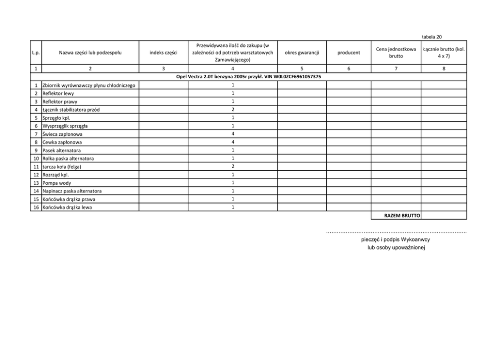 tabela 20 L.p. Nazwa części lub podzespołu indeks części 1 2 3 Przewidywana ilość do zakupu (w zależności od potrzeb warsztatowych Zamawiającego) okres gwarancji 4 5 Opel Vectra 2.0T benzyna 2005r przykł. VIN W0L0ZCF6961057375 1 Zbiornik wyrównawczy płynu chłodniczego 1 2 Reflektor lewy 1 3 Reflektor prawy 1 4 Łącznik stabilizatora przód 2 5 Sprzęgło kpl. 1 6 Wysprzęglik sprzęgła 1 7 Świeca zapłonowa 4 8 Cewka zapłonowa 4 9 Pasek alternatora 1 10 Rolka paska alternatora 1 11 tarcza koła (felga) 2 12 Rozrząd kpl. 1 13 Pompa wody 1 14 Napinacz paska alternatora 1 15 Końcówka drążka prawa 1 16 Końcówka drążka lewa 1 producent Cena jednostkowa brutto Łącznie brutto (kol. 4 x 7) 6 7 8 RAZEM BRUTTO ……………………………………………………………………. pieczęć i podpis Wykoanwcy lub osoby upoważnionej ……………….