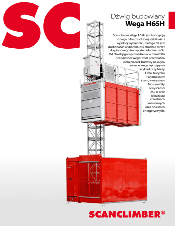Dźwig budowlany Wega H65H Scanclimber Wega H65H jest koncepcją dźwigu o bardzo dobrej stabilności i wysokiej wydajności, dlatego też jest doskonałym wyborem, jeśli chodzi o sprzęt do pionowego transportu ładunku i osób. Od chwili jego wprowadzenia w roku 2004 Scanclimber Wega H65H pracował na wielu placach budowy na całym świecie. Wega był użyty na przykład przy Wieży Eiffla, budynku Parlamentu w Danii, Kompleksie Moscow City o wysokości 250 m oraz kilkunastu chłodniach kominowych oraz obiektach energetycznych. Dźwig budowlany Wega H65H Wega H65H Wprowadzenie Duża prędkość skraca czas montażu RODZINA DŹWIGÓW TOWAROWO-OSOBOWYCH H65H jest wysokowydajnym, elastycznym i dającym DZIĘKI PRĘDKOŚCI PODNOSZENIA do 90 metrów na się modernizować systemem do transportu ładunków i osób na wysokość do 300 m, posiadającym przestronną kabinę. SOLIDNY SYSTEM TYPU MASZTOWEGO H65H ustawiony jest na stabilnej stacji dolnej i w prosty sposób zmontowany za pomocą dźwigu pomocniczego lub ręcznie, za pomocą opcjonalnego żurawika montażowego. MODUŁOWA STRUKTURA WEGA zapewnia niezawodność, długotrwałość, elastyczność, bezpieczeństwo, wydajność, niskie zużycie energii oraz niskie koszty użytkowania, przez co jest opłacalną inwestycją dla firm budowlanych i zajmujących się wynajmem sprzętu. DZIĘKI UDŹWIGOWI do 3200 kg i maksymalnej szybkości podnoszenia do 90 m/min Wega już sprawdził się jako wysokowydajne urządzenie na wielu placach budowy na świecie. Konfiguracje Wega SYSTEM MODUŁOWY WEGA pozwala na wybór wymaganej konfiguracji o specjalnych dodatkach i własnościach. Następnie, wybrana konfiguracja może być zaadaptowana do różnych zastosowań, dzięki użyciu zaledwie kilku dodatkowych modułów i komponentów. Ta rodzina dźwigów posiada różne rozmiary kabin, opcje szybkości oraz nośności. Ponadto, istnieje duża różnorodność bramek na pomostach, drzwi oraz systemów kotwienia masztów. NOŚNOŚCI DŹWIGÓW WEGA dla modeli z pojedynczą kabiną wynoszą: 2000 kg, 2500 kg lub 3200 kg, a opcje prędkości są następujące: prędkość normalna 36 m/min, średnia 54 m/min oraz wysoka 90 m/min. Kabina jest dostępna w dwóch opcjach długości: 3,2 m lub 3,7 m. Jeśli pojemność lub nośność jednej klatki jest niewystarczająca, można ją podwoić poprzez zastosowanie wersji z podwójną kabiną. Każda kabina może być obciążona tym samym ładunkiem, co oznacza, że największy ładunek może ważyć 6400 kg. minutę, Scanclimber Wega nie tylko szybko się wznosi, lecz jest także szybszy w montażu niż większość innych dźwigów na rynku. Jest to możliwe dzięki stabilnemu masztowi. Sztywny maszt Wega pozwala na zachowanie maksymalnego rozstawu kotwienia 21 metrów. Wszystko to składa się na większą wydajność pracy, skrócenie czasu montażu oraz oczywiście, bardziej bezpieczne środowisko pracy. SPECYFICZNE WARUNKI panujące na placach budowy oraz rożne dziedziny zastosowania wymagają elastycznych i odpowiednich technologii osiągania dużych wysokości. Aby być o krok przed konkurencją na światowych rynkach, Scanclimber nieustannie pracuje nad ulepszeniem i modyfikacjami swoich produktów. Możliwość przywoływania i sterowanie komputerowe JEDNĄ Z ZALET dźwigów H65H jest możliwość przywoływania. Oznacza to, że kabinę można wezwać na wybrany poziom jak zwykłą windę. W miejscach intensywnej pracy zazwyczaj zwykłe przywoływanie i obsługa ręczna nie wystarczają i potrzebne są bardziej zaawansowane metody. Jako rozwiązanie tego problemu Scanclimber proponuje bardziej inteligentny, sterowany komputerem system kontrolowania zatrzymywania kabiny. Jest on także znany jako programowany sterownik logiczny (PLC). Użytkownicy dźwigu mogą żądać podjazdu na wybrany poziom. W przypadku wielu wezwań z różnych poziomów jednocześnie, komputer optymalizuje pracę dźwigu. Dźwig budowlany Wega H65H 1 2 3 4 5 6 Szczegóły Hamulec bezpieczeństwa 1 HAMULEC BEZPIECZEŃSTWA zapewnia, że nawet w przypadku całkowitej awarii jednostki napędowej kabina nie spadnie. Mechaniczny, dociskany sprężyną hamulec bezpieczeństwa jest standardowym elementem we wszystkich modelach Wega. Zwiększa on bezpieczeństwo i niezawodność dźwigu w codziennym użytkowaniu. Hamulec bezpieczeństwa jest dobrze zabezpieczony przed brudem oraz pyłem i jest praktycznie bezobsługowy. Kabina Kabiny STANDARDOWE są dostęp- 2 ne w dwóch rozmiarach: 32 = (3,2 m x 1,5 m) lub 37 = (3,7 m x 1,5 m). Drzwi mogą być założone z jednej lub z każdej strony kabiny. Drzwi przednie (A) oraz tylne (B) mają szerokość 1,5 m, natomiast boczne (C) są szersze (2,6 m), aby możliwe było wnoszenie ładunków o większych wymiarach. Rampa 3 WYJŚCIE NA DOCELOWY POZIOM normalnie odbywa się przez drzwi B. Aby ułatwić wejście i wznoszenie dźwigu, drzwi mogą być wyposażone w ręczną lub hydrauliczną rampę. Długość rampy wynosi 820 mm. Stacja dolna 4 LŻEJSZA STACJA DOLNA WEGA jest przykręcona do betonowej lub podobnej płyty, a sposób obsługi może być dowolnie wybrany. Dostępna jest także ciężka stacja, która stoi na swoich własnych podporach i potrzebuje jedynie twardego, płaskiego podłoża. Standardowa stacja dolna jest wyposażona w jedne drzwi (A), lecz drzwi tylne (B) oraz szersze drzwi boczne (C) są także opcjonalnie dostępne. Więcej mocy, mniej zużycia energii 6 SCANCLIMBER WEGA H65H jest zawsze wyposażony w sterownik częstotliwości (FC). Zapewnia on bardzo łagodne ruszanie i zatrzymywanie się, o niskim prądzie rozruchowym oraz mniejsze zużycie sprzętu. Bramki oraz drzwi 5 Bramki na pomostach WEGA oraz drzwi są kompatybilne ze wszystkimi modelami podnośników H65H. Bramki i drzwi są solidne, elastyczne i mogą być dostosowane do różnych rodzajów warunków strukturalnych. Wszystkie bramki i drzwi są wyposażone w system blokowania i spełniają wymagania aktualnej