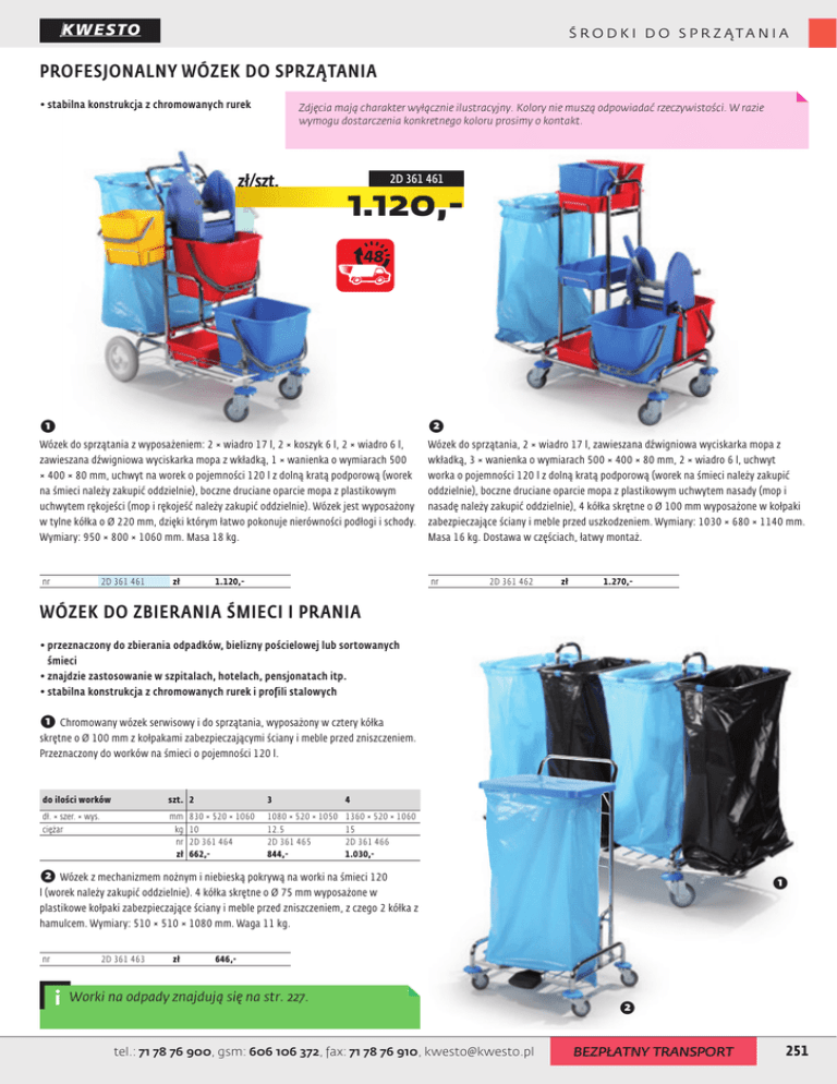 Ś RO D K I D O S P R Z ĄTA N I A PROFESJONALNY WÓZEK DO SPRZĄTANIA •stabilna konstrukcja z chromowanych rurek Zdjęcia mają charakter wyłącznie ilustracyjny. Kolory nie muszą odpowiadać rzeczywistości. W razie wymogu dostarczenia konkretnego koloru prosimy o kontakt. zł/szt. 2D 361 461 1.120,48 ➊ ➋ Wózek do sprzątania z wyposażeniem: 2 × wiadro 17 l, 2 × koszyk 6 l, 2 × wiadro 6 l, zawieszana dźwigniowa wyciskarka mopa z wkładką, 1 × wanienka o wymiarach 500 × 400 × 80 mm, uchwyt na worek o pojemności 120 l z dolną kratą podporową (worek na śmieci należy zakupić oddzielnie), boczne druciane oparcie mopa z plastikowym uchwytem rękojeści (mop i rękojeść należy zakupić oddzielnie). Wózek jest wyposażony w tylne kółka o Ø 220 mm, dzięki którym łatwo pokonuje nierówności podłogi i schody. Wymiary: 950 × 800 × 1060 mm. Masa 18 kg. Wózek do sprzątania, 2 × wiadro 17 l, zawieszana dźwigniowa wyciskarka mopa z wkładką, 3 × wanienka o wymiarach 500 × 400 × 80 mm, 2 × wiadro 6 l, uchwyt worka o pojemności 120 l z dolną kratą podporową (worek na śmieci należy zakupić oddzielnie), boczne druciane oparcie mopa z plastikowym uchwytem nasady (mop i nasadę należy zakupić oddzielnie), 4 kółka skrętne o Ø 100 mm wyposażone w kołpaki zabezpieczające ściany i meble przed uszkodzeniem. Wymiary: 1030 × 680 × 1140 mm. Masa 16 kg. Dostawa w częściach, łatwy montaż. nr 2D 361 461 zł 1.120,- nr 2D 361 462 zł 1.270,- WÓZEK DO ZBIERANIA ŚMIECI I PRANIA •przeznaczony do zbierania odpadków, bielizny pościelowej lub sortowanych śmieci •znajdzie zastosowanie w szpitalach, hotelach, pensjonatach itp. •stabilna konstrukcja z chromowanych rurek i profili stalowych ➊ Chromowany wózek serwisowy i do sprzątania, wyposażony w cztery kółka skrętne o Ø 100 mm z kołpakami zabezpieczającymi ściany i meble przed zniszczeniem. Przeznaczony do worków na śmieci o pojemności 120 l. do ilości worków szt. 2 3 4 dł. × szer. × wys. ciężar mm kg nr zł 1080 × 520 × 1050 12.5 2D 361 465 844,- 1360 × 520 × 1060 15 2D 361 466 1.030,- 830 × 520 × 1060 10 2D 361 464 662,- ➋ Wózek z mechanizmem nożnym i niebieską pokrywą na worki na śmieci 120 ➊ l (worek należy zakupić oddzielnie). 4 kółka skrętne o Ø 75 mm wyposażone w plastikowe kołpaki zabezpieczające ściany i meble przed zniszczeniem, z czego 2 kółka z hamulcem. Wymiary: 510 × 510 × 1080 mm. Waga 11 kg. nr 2D 361 463 zł 646,- Worki na odpady znajdują się na str. 227. tel.: 71 78 76 900, gsm: 606 106 372, fax: 71 78 76 910, [email protected] ➋ BEZPŁATNY TRANSPORT 251