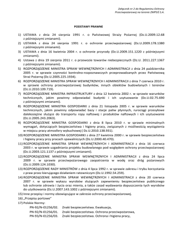 Załącznik nr 2 do Regulaminu Ochrony Przeciwpożarowej na terenie ZMPSiŚ S.A. PODSTAWY PRAWNE 1) USTAWA z dnia 24 sierpnia 1991 r. o Państwowej Straży Pożarnej (Dz.U.2009.12.68 z późniejszymi zmianami). 2) USTAWA z dnia 24 sierpnia 1991 r. o ochronie przeciwpożarowej (Dz.U.2009.178.1380 z późniejszymi zmianami). 3) USTAWA z dnia 16 kwietnia 2004 r. o ochronie przyrody (Dz.U.2009.151.1220 z późniejszymi zmianami). 4) Ustawa z dnia 19 sierpnia 2011 r. o przewozie towarów niebezpiecznych (Dz.U. 2011.227.1367 z późniejszymi zmianami). 5) ROZPORZĄDZENIE MINISTRA SPRAW WEWNĘTRZNYCH I ADMINISTRACJI z dnia 24 października 2005 r. w sprawie czynności kontrolno-rozpoznawczych przeprowadzanych przez Państwową Straż Pożarną (Dz.U.2005.225.1934). 6) ROZPORZĄDZENIE MINISTRA SPRAW WEWNĘTRZNYCH I ADMINISTRACJI z dnia 7 czerwca 2010 r. w sprawie ochrony przeciwpożarowej budynków, innych obiektów budowlanych i terenów (Dz.U.2010.109.719). 7) ROZPORZĄDZENIE MINISTRA INFRASTRUKTURY z dnia 12 kwietnia 2002 r. w sprawie warunków technicznych, jakim powinny odpowiadać budynki i ich usytuowanie (Dz.U.02.75.690 z późniejszymi zmianami). 8) ROZPORZĄDZENIE MINISTRA GOSPODARKI z dnia 21 listopada 2005 r. w sprawie warunków technicznych, jakim powinny odpowiadać bazy i stacje paliw płynnych, rurociągi przesyłowe dalekosiężne służące do transportu ropy naftowej i produktów naftowych i ich usytuowanie (Dz.U.2005.243.2063). 9) ROZPORZĄDZENIE MINISTRA GOSPODARKI z dnia 8 lipca 2010 r. w sprawie minimalnych wymagań, dotyczących bezpieczeństwa i higieny pracy, związanych z możliwością wystąpienia w miejscu pracy atmosfery wybuchowej ( Dz.U.2010.138.931). 10) ROZPORZĄDZENIE MINISTRA GOSPODARKI z dnia 27 kwietnia 2000 r. w sprawie bezpieczeństwa i higieny pracy przy pracach spawalniczych (Dz.U.2000.40.470). 11) ROZPORZĄDZENIE MINISTRA SPRAW WEWNĘTRZNYCH I ADMINISTRACJI z dnia 16 czerwca 2003 r. w sprawie uzgadniania projektu budowlanego pod względem ochrony przeciwpożarowej (Dz.U.2003.121.1137 z późniejszymi zmianami). 12) ROZPORZĄDZENIE MINISTRA SPRAW WEWNĘTRZNYCH I ADMINISTRACJI z dnia 24 lipca 2009 r. w sprawie przeciwpożarowego zaopatrzenia w wodę oraz dróg pożarowych (Dz.U.2009.124.1030). 13) ROZPORZĄDZENIE RADY MINISTRÓW z dnia 4 lipca 1992 r. w sprawie zakresu i trybu korzystania z praw przez kierującego działaniem ratowniczym (Dz.U.1992.54.259). 14) ROZPORZĄDZENIE MINISTRA SPRAW WEWNĘTRZNYCH I ADMINISTRACJI z dnia 20 czerwca 2007 r. w sprawie wykazu wyrobów służących zapewnieniu bezpieczeństwa publicznego lub ochronie zdrowia i życia oraz mienia, a także zasad wydawania dopuszczenia tych wyrobów do użytkowania (Dz.U.2007.143.1002 z późniejszymi zmianami). 15) Inne przepisy i normy obowiązujące w zakresie ochrony przeciwpożarowej. 16) „Przepisy portowe” 17) Polskie Normy: PN-92/N-01256/02. Znaki bezpieczeństwa. Ewakuacja, PN-92/N-01256/01. Znaki bezpieczeństwa. Ochrona przeciwpożarowa, PN-93/N-01256/03. Znaki bezpieczeństwa. Ochrona i higiena pracy, PN-/N-01256-4:1997. Znaki bezpieczeństwa. Techniczne środki przeciwpożarowe, PN-N-01256-5:1998. Znaki bezpieczeństwa. Zasady umieszczania znaków bezpieczeństwa na drogach ewakuacyjnych i drogach pożarowych, PN-EN 671-3:2002 Stałe urządzenia gaśnicze. Hydranty wewnętrzne. 18) Międzynarodowy Kodeks Morski Towarów Niebezpiecznych (IMDG code). 19) Umowa europejska ADR dotycząca międzynarodowego przewozu drogowego towarów niebezpiecznych. 20) Regulamin RID dla międzynarodowego przewozu kolejami towarów niebezpiecznych. 21) Umowa europejska ADN dotycząca międzynarodowego przewozu towarów niebezpiecznych śródlądowymi drogami wodnymi.