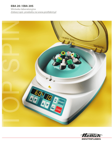 EBA 20 / EBA 20S Wirówka laboratoryjna Zobacz opis produktu na www.profident.pl EBA 20 / EBA 20 S Technologia Wirówka EBA 20 i wirówka EBA 20 S to kompaktowe praktyczne urządzenia przystosowane do próbek o małej objętości. Są one standardowo mocowane w rotorze, jednocześnie można umieścić 8 probówek o objętości do 15 ml. EBA osiąga maksymalną wartość RCF (Relative Centrifugal Force = względna siła odśrodkowa) równą 3,461 i jest idealnym wyborem dla praktyki medycznej. Mocniejsza wersja EBA 20 S generuje maksymalną wartość RCF 6,153 i jest odpowiednia do laboratoriów świadczących pomoc doraźną, gdzie liczy się każda minuta. EBA 20 EBA 20 S Small centrifuge, with rotor Power supply* ) 208 – 240 V 1 ~ 100 – 127 V 1 ~ 65 VA 70 VA 130 VA 180 VA EN 55011 group 1, class B, EN 61000-3-2, EN 61000-3-3 FCC class B EN 55011 group 1, class B, EN 61000-3-2, EN 61000-3-3 FCC class B EN 61000-6-1 - EN 61000-6-1 - Frequency Emission Immunity Max. capacity 8 x 15 ml Max. RPM 6,000 min-1 8,000 min-1 3,461 6,153 Max. RCF Running time 1 – 99 min , continuous run, short cycle mode (impulse key) Frequency drive - Yes Imbalance switch-off - Yes Dimensions (H x W x D) 216 x 231x 292 mm approx. 4 kg Cat. No. 5 Ø x L in mm 10 x 88 12 x 75 12 x 82 17 x 100 - 0553 0501 Cat. No. 6 15 0518 2002 1.1– 1.4 2.6 – 2.9 8 x 66 13 x 65 approx. 6 kg 2002-01 1.6 – 5 4–7 2080-01 2.7– 3 4.5 – 5 4.9 7.5–8.2 9 – 10 11 x 66 11 x 92 13 x 90 15 x 92 16 x 92 15 x 102 13 x 75 13 x 100 16 x 125 16 x 100 17x 120 1) 10 2080 8 8.5 – 10 blood collection/urine tubes #) 15 0509 #) #) rotor incl. Cat. No. boring Ø x L in mm 6305 1054-A - 1054-A - 1054-A 1058 - 11.5x 67.5 13.5 x 60 17.7 x 88 13.5 x 60 17.7 x 88 13.5 x 60 13.5 x 79 17.7 x 88 tubes per rotor max. RCF 1) max. RCF 1) 8 8 8 4 8 EBA 20 2,817 2,697 3,461 2,697 3,461 2,697 3,461 EBA 20 S 5,009 4,794 6,153 4,794 6,153 4,794 6,153 70 67 86 67 86 67 86 radius in mm Shortest run-up in sec 26/23 Shortest run-down in sec 37/40 Additional tubes e.g. stool tubes or spin columns on request. * ) Other voltages on request. Please note that the RCF values indicated refer only to rotor performance. The max. permissible RCF of tubes used should be verified with the individual manufacturers. The max. RCF for glass tubes annotated with footnote 1) is 4,000. #) For the EBA 20 only! Model EBA 20 S is supplied as standard with an adapter for these tubes. 1) Andreas Hettich GmbH & Co. KG Föhrenstr. 12 D -78532 Tuttlingen Germany www.hettichlab.com [email protected] [email protected] Phone+49 (0)7461 / 7 05 -0 Fax +49 (0)7461 / 7 05 -1 22 National Sales: International Sales: National Service: International Service: -2 00 -2 01 -2 02 -2 03 4 P2002GB.0209 © by Hettich Tuttlingen · Printed in Germany · Design, form and colour modifications reserved. Weight 4 100 – 127 V 1 ~ 50 – 60 Hz Consumption capacity in ml 200 – 240 V 1 ~