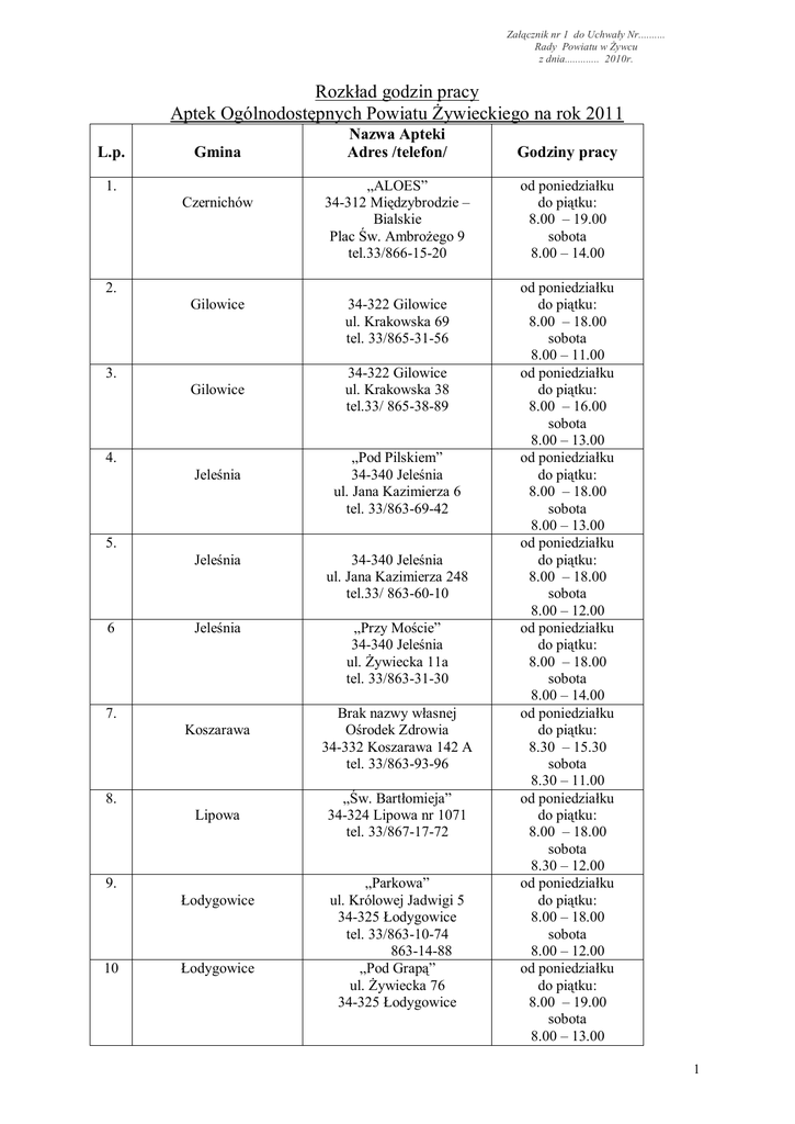 Załącznik nr 1 do Uchwały Nr.......... Rady Powiatu w Żywcu z dnia............. 2010r. Rozkład godzin pracy Aptek Ogólnodostępnych Powiatu Żywieckiego na rok 2011 L.p. Gmina 1. Czernichów Nazwa Apteki Adres /telefon/ Godziny pracy „ALOES” 34-312 Międzybrodzie – Bialskie Plac Św. Ambrożego 9 tel.33/866-15-20 od poniedziałku do piątku: 8.00 – 19.00 sobota 8.00 – 14.00 2. Gilowice 3. Gilowice 4. Jeleśnia 34-322 Gilowice ul. Krakowska 69 tel. 33/865-31-56 34-322 Gilowice ul. Krakowska 38 tel.33/ 865-38-89 „Pod Pilskiem” 34-340 Jeleśnia ul. Jana Kazimierza 6 tel. 33/863-69-42 5. 6 Jeleśnia 34-340 Jeleśnia ul. Jana Kazimierza 248 tel.33/ 863-60-10 Jeleśnia „Przy Moście” 34-340 Jeleśnia ul. Żywiecka 11a tel. 33/863-31-30 Koszarawa Brak nazwy własnej Ośrodek Zdrowia 34-332 Koszarawa 142 A tel. 33/863-93-96 Lipowa „Św. Bartłomieja” 34-324 Lipowa nr 1071 tel. 33/867-17-72 7. 8. 9. Łodygowice 10 Łodygowice „Parkowa” ul. Królowej Jadwigi 5 34-325 Łodygowice tel. 33/863-10-74 863-14-88 „Pod Grapą” ul. Żywiecka 76 34-325 Łodygowice od poniedziałku do piątku: 8.00 – 18.00 sobota 8.00 – 11.00 od poniedziałku do piątku: 8.00 – 16.00 sobota 8.00 – 13.00 od poniedziałku do piątku: 8.00 – 18.00 sobota 8.00 – 13.00 od poniedziałku do piątku: 8.00 – 18.00 sobota 8.00 – 12.00 od poniedziałku do piątku: 8.00 – 18.00 sobota 8.00 – 14.00 od poniedziałku do piątku: 8.30 – 15.30 sobota 8.30 – 11.00 od poniedziałku do piątku: 8.00 – 18.00 sobota 8.30 – 12.00 od poniedziałku do piątku: 8.00 – 18.00 sobota 8.00 – 12.00 od poniedziałku do piątku: 8.00 – 19.00 sobota 8.00 – 13.00 1 11. Łodygowice 12. Łękawica 13. Milówka 14. Milówka Brak nazwy własnej ul. Jana Pawła II 60 34-326 Pietrzykowice tel.33/ 863-23-46 od poniedziałku do piątku: 9.00 – 16.00 sobota 9.00 – 12.00 „Nostra” ul. Żywiecka 58 B 34-321 Łękawica tel. 33/862-25-60 od poniedziałku do piątku: 8.00 – 17.00 sobota 9.00 – 14.00 poniedziałek od 8.00 do 19.00 od wtorku do piątku: 8.00 – 18.00 sobota 8.00 – 12.00 od poniedziałku do piątku: 9.00 – 17.00 sobota 9.00 – 13.00 od poniedziałku do piątku: 7.30 – 17.30 sobota 7.30 – 13.00 „ Św. Antoniego” ul. Dworcowa 31 34-360 Milówka tel.33/ 863-76-01 „ Za Kościołem ul. Nowa 14 34-360 Milówka tel.33/ 863-70-42 Rajcza „Przy Górskiej” ul. Górska 6 34-370 Rajcza tel. 33/864-33-98 Rajcza „Pod Jesionem” ul. Rynek 3 34-370 Rajcza tel.33/ 864-30-17 15. 16. 17. Radziechowy-Wieprz 18. Radziechowy-Wieprz „Zdrowie” 34-381 Wieprz ul. Żywiecka 15 tel.33/ 861-11-16 „Św. Marcina” 34-381 Radziechowy ul. Św. Marcina 83 tel.33/ 867-64-54 19. Radziechowy - Wieprz 20. Świnna Brzuśnik 227 34-382 Bystra tel.33/ 867-55-65 Apteka „Alfa” 34-331 Pewel Mała Ul. Żywiecka 28 tel. 33/863-99-10 21. Ujsoły 34-371 Ujsoły ul. Bystra 8/3 tel. 33/864-72-71 od poniedziałku do piątku: 8.00 – 18.00 sobota 8.00 – 13.00 od poniedziałku do piątku: 8.00 – 17.00 sobota 8.00 – 12.00 od poniedziałku do piątku: 8.00 – 17.00 sobota 8.00 – 13.00 od poniedziałku do piątku: 8.00 – 17.00 sobota 8.00 – 12.00 od poniedziałku do piątku: 7.30 – 19.30 sobota 7.30 – 15.00 od poniedziałku do piątku: 8.00 – 15.00 sobota 8.00 – 12.00 2 22. Węgierska Górka 23. Węgierska Górka 24. Żywiec 25. Żywiec 26. Żywiec 27. Żywiec 28. Żywiec 29. Żywiec 30. Żywiec 31. Żywiec 32. Żywiec 33. Żywiec „Pod Baranią” oś. XX- lecia II RP 1/1/2 34-350 Węgierska Górka tel. 33/864-11-00 „POD KOPUŁĄ” ul. Kościuszki 12 34-350 Węgierska Górka tel. 33/864 07 53 „Świętokrzyska” ul. Świętokrzyska 34 34-300 Żywiec tel. 33/860-46-76 „Parkowa” oś. Parkowe 9 34-300 Żywiec tel. 33/861-36-65 „Jagiellońska” ul. Jagiellońska 21 34-300 Żywiec tel. 33/861-55-62 „Zdrowie” ul. Dworcowa 23 34-300 Żywiec tel.33/ 861-55-61 „Galena” Al. Piłsudskiego 78 34-300 Żywiec tel.33/861-03-76 „Sana” ul. Dworcowa 11 34-300 Żywiec tel. 33/861-27-84 „Św. Franciszka” ul. Kościuszki 42 34-300 Żywiec tel.33/ 861-09-67 „Nadzieja” ul. Sienkiewicza 35 34-300 Żywiec tel.33/861-51-31 „Złoty Lek” oś. 700 –lecia 9A 34-300 Żywiec tel.33/ 861-69-19 „Na Mostku” ul. Kościuszki 15 34-300 Żywiec tel. 33/861-43-33 od poniedziałku do piątku: 9.00 – 17.00 sobota 9.00 – 12.00 od poniedziałku do piątku: 8.00 – 19.00 sobota 8.00 – 15.30 od poniedziałku do soboty: 7.00 – 21.00 niedziela: 10.00-17.00 od poniedziałku do piątku: 8.00 – 19.00 sobota 8.00 – 13.00 od poniedziałku do piątku: 8.00 – 18.00 sobota 8.00 – 15.00 od poniedziałku do piątku: 8.00 – 18.00 sobota 8.00 – 13.00 od poniedziałku do piątku: 8.00 –20.00 sobota 8.00 – 20.00 od poniedziałku do piątku: 8.00 –17.00 sobota 8.00 – 13.00 od poniedziałku do piątku: 8.00 –19.00 sobota 8.00 – 13.00 od poniedziałku do piątku: 8.00 –21.00 sobota 8.00 – 14.00 od poniedziałku do piątku: 8.30 –17.00 sobota 8.30 – 12.00 od poniedziałku do piątku: 8.00 –17.00 sobota 8.00 – 13.00 3 34. Żywiec 35. Żywiec 36 Żywiec 37. Żywiec 38. Żywiec ul. Ks.Prał.St.Słonki 2 34-300 Żywiec tel.33/ 861-54-30 „Pod Grapą” oś. Młodych 1 34-300 Żywiec tel.33/ 861-33-80 „Solidarna Pomoc” ul. Kopernika 39 34- 300 Żywiec tel.33/ 866-68-68 „Cefarm” ul. Rynek 10 34-300 Żywiec tel. 33/861-16-36 „Remedium” ul. Ks.St. Słonki 24 34- 300 Żywiec tel.33/ 861-13-95 39. Żywiec „Świętokrzyska” ul. Legionów 45 34-300 Żywiec tel.33/ 861-43-39 40. Żywiec 41 Żywiec „Przy Starostwie” ul. Powstańców Śląskich 2A 34-300 Żywiec tel. 33/861-90-30 „Dla Ciebie” ul. Zamkowa 14 34-300 Żywiec tel. 33/861 91 50 42 Żywiec „700-Lecia” ul. Południowa 19 34-300 Żywiec tel.33/861 33 99 43. Żywiec „Żywiecka” ul. 1 maja 1 34-300 Żywiec tel.33/ 475-48-36 44 Żywiec Ogólnodostępna ul. Żeromskiego 1 tel. 33/861