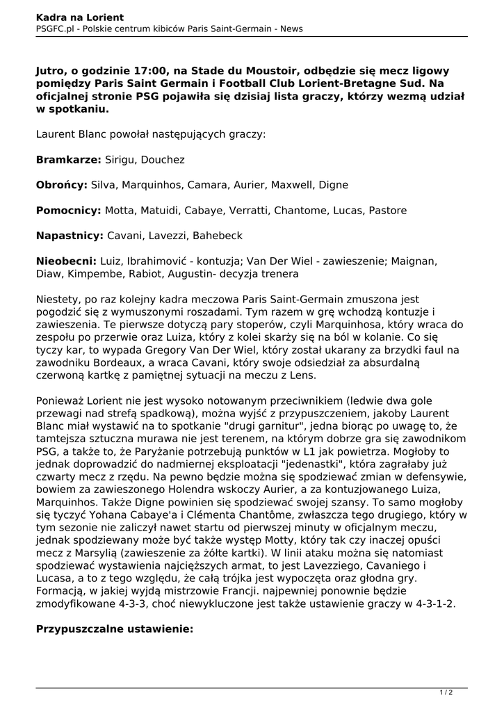Kadra na Lorient PSGFC.pl - Polskie centrum kibiców Paris Saint-Germain - News Jutro, o godzinie 17:00, na Stade du Moustoir, odbędzie się mecz ligowy pomiędzy Paris Saint Germain i Football Club Lorient-Bretagne Sud. Na oficjalnej stronie PSG pojawiła się dzisiaj lista graczy, którzy wezmą udział w spotkaniu. Laurent Blanc powołał następujących graczy: Bramkarze: Sirigu, Douchez Obrońcy: Silva, Marquinhos, Camara, Aurier, Maxwell, Digne Pomocnicy: Motta, Matuidi, Cabaye, Verratti, Chantome, Lucas, Pastore Napastnicy: Cavani, Lavezzi, Bahebeck Nieobecni: Luiz, Ibrahimović - kontuzja; Van Der Wiel - zawieszenie; Maignan, Diaw, Kimpembe, Rabiot, Augustin- decyzja trenera Niestety, po raz kolejny kadra meczowa Paris Saint-Germain zmuszona jest pogodzić się z wymuszonymi roszadami. Tym razem w grę wchodzą kontuzje i zawieszenia. Te pierwsze dotyczą pary stoperów, czyli Marquinhosa, który wraca do zespołu po przerwie oraz Luiza, który z kolei skarży się na ból w kolanie. Co się tyczy kar, to wypada Gregory Van Der Wiel, który został ukarany za brzydki faul na zawodniku Bordeaux, a wraca Cavani, który swoje odsiedział za absurdalną czerwoną kartkę z pamiętnej sytuacji na meczu z Lens. Ponieważ Lorient nie jest wysoko notowanym przeciwnikiem (ledwie dwa gole przewagi nad strefą spadkową), można wyjść z przypuszczeniem, jakoby Laurent Blanc miał wystawić na to spotkanie "drugi garnitur", jedna biorąc po uwagę to, że tamtejsza sztuczna murawa nie jest terenem, na którym dobrze gra się zawodnikom PSG, a także to, że Paryżanie potrzebują punktów w L1 jak powietrza. Mogłoby to jednak doprowadzić do nadmiernej eksploatacji "jedenastki", która zagrałaby już czwarty mecz z rzędu. Na pewno będzie można się spodziewać zmian w defensywie, bowiem za zawieszonego Holendra wskoczy Aurier, a za kontuzjowanego Luiza, Marquinhos. Także Digne powinien się spodziewać swojej szansy. To samo mogłoby się tyczyć Yohana Cabaye'a i Clémenta Chantôme, zwłaszcza tego drugiego, który w tym sezonie nie zaliczył nawet startu od pierwszej minuty w oficjalnym meczu, jednak spodziewany może być także występ Motty, który tak czy inaczej opuści mecz z Marsylią (zawieszenie za żółte kartki). W linii ataku można się natomiast spodziewać wystawienia najcięższych armat, to jest Lavezziego, Cavaniego i Lucasa, a to z tego względu, że całą trójka jest wypoczęta oraz głodna gry. Formacją, w jakiej wyjdą mistrzowie Francji. najpewniej ponownie będzie zmodyfikowane 4-3-3, choć niewykluczone jest także ustawienie graczy w 4-3-1-2. Przypuszczalne ustawienie: 1/2 Kadra na Lorient PSGFC.pl - Polskie centrum kibiców Paris Saint-Germain - News Autor: Próżnia 2/2 Powered by TCPDF (www.tcpdf.org)