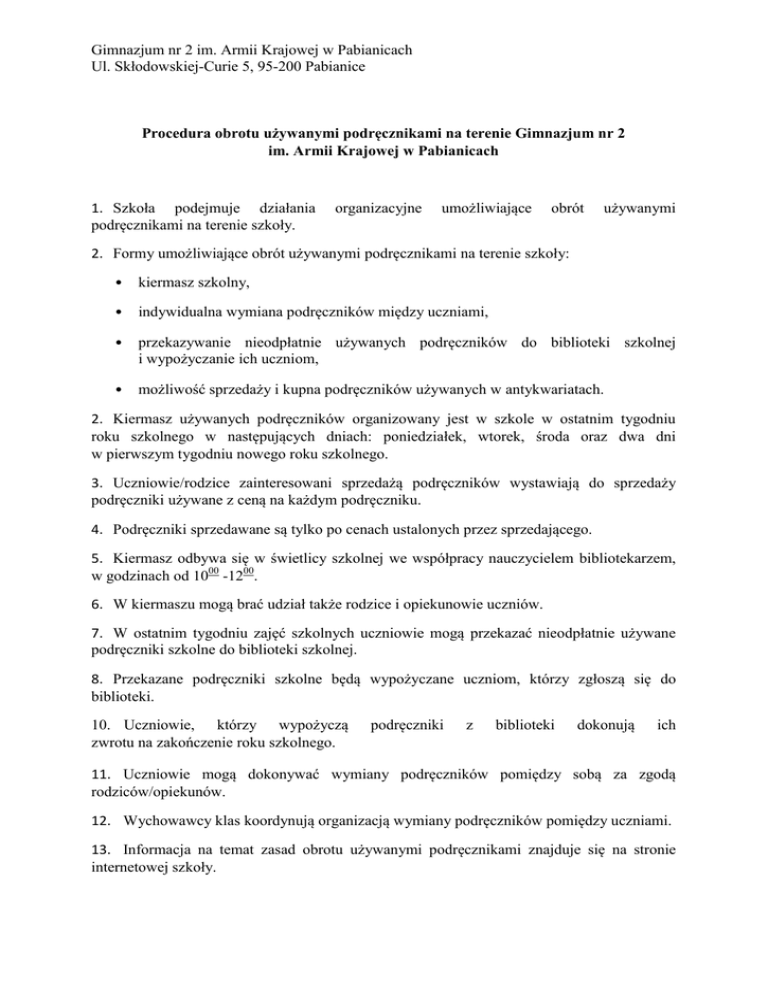 Gimnazjum nr 2 im. Armii Krajowej w Pabianicach Ul. Skłodowskiej-Curie 5, 95-200 Pabianice Procedura obrotu używanymi podręcznikami na terenie Gimnazjum nr 2 im. Armii Krajowej w Pabianicach 1. Szkoła podejmuje działania podręcznikami na terenie szkoły. organizacyjne umożliwiające obrót używanymi 2. Formy umożliwiające obrót używanymi podręcznikami na terenie szkoły: • kiermasz szkolny, • indywidualna wymiana podręczników między uczniami, • przekazywanie nieodpłatnie używanych podręczników do biblioteki szkolnej i wypożyczanie ich uczniom, • możliwość sprzedaży i kupna podręczników używanych w antykwariatach. 2. Kiermasz używanych podręczników organizowany jest w szkole w ostatnim tygodniu roku szkolnego w następujących dniach: poniedziałek, wtorek, środa oraz dwa dni w pierwszym tygodniu nowego roku szkolnego. 3. Uczniowie/rodzice zainteresowani sprzedażą podręczników wystawiają do sprzedaży podręczniki używane z ceną na każdym podręczniku. 4. Podręczniki sprzedawane są tylko po cenach ustalonych przez sprzedającego. 5. Kiermasz odbywa się w świetlicy szkolnej we współpracy nauczycielem bibliotekarzem, w godzinach od 1000 -1200. 6. W kiermaszu mogą brać udział także rodzice i opiekunowie uczniów. 7. W ostatnim tygodniu zajęć szkolnych uczniowie mogą przekazać nieodpłatnie używane podręczniki szkolne do biblioteki szkolnej. 8. Przekazane podręczniki szkolne będą wypożyczane uczniom, którzy zgłoszą się do biblioteki. 10. Uczniowie, którzy wypożyczą zwrotu na zakończenie roku szkolnego. podręczniki z biblioteki dokonują ich 11. Uczniowie mogą dokonywać wymiany podręczników pomiędzy sobą za zgodą rodziców/opiekunów. 12. Wychowawcy klas koordynują organizacją wymiany podręczników pomiędzy uczniami. 13. Informacja na temat zasad obrotu używanymi podręcznikami znajduje się na stronie internetowej szkoły.