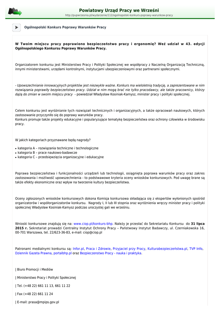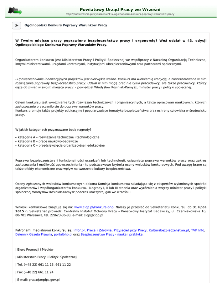 Powiatowy Urząd Pracy we Wrześni http://pupwrzesnia.pl/wydarzenie/112/ogolnopolski-konkurs-poprawy-warunkow-pracy Ogólnopolski Konkurs Poprawy Warunków Pracy W Twoim miejscu pracy poprawiono bezpieczeństwo pracy i ergonomię? Weź udział w 43. edycji Ogólnopolskiego Konkursu Poprawy Warunków Pracy. Organizatorem konkursu jest Ministerstwo Pracy i Polityki Społecznej we współpracy z Naczelną Organizacją Techniczną, innymi ministerstwami, urzędami kontrolnymi, instytucjami ubezpieczeniowymi oraz partnerami społecznymi. - Upowszechnianie innowacyjnych projektów jest niezwykle ważne. Konkurs ma wieloletnią tradycję, a zaprezentowane w nim rozwiązania poprawiły bezpieczeństwo pracy. Udział w nim mogą brać nie tylko pracodawcy, ale także pracownicy, którzy dążą do zmian w swoim miejscu pracy - powiedział Władysław Kosiniak-Kamysz, minister pracy i polityki społecznej. Celem konkursu jest wyróżnianie tych rozwiązań technicznych i organizacyjnych, a także opracowań naukowych, których zastosowanie przyczyniło się do poprawy warunków pracy. Konkurs promuje także projekty edukacyjne i popularyzujące tematykę bezpieczeństwa oraz ochrony człowieka w środowisku pracy. W jakich kategoriach przyznawane będą nagrody? ● ● ● kategoria A – rozwiązania techniczne i technologiczne kategoria B – prace naukowo-badawcze kategoria C – przedsięwzięcia organizacyjne i edukacyjne Poprawa bezpieczeństwa i funkcjonalności urządzeń lub technologii, osiągnięta poprawa warunków pracy oraz zakres zastosowania i możliwość upowszechnienia - to podstwawowe kryteria oceny wniosków konkursowych. Pod uwagę brane są także efekty ekonomiczne oraz wpływ na tworzenie kultury bezpieczeństwa. Oceny zgłoszonych wniosków konkursowych dokona Komisja konkursowa składająca się z ekspertów wyłonionych spośród organizatorów i współorganizatorów konkursu. Nagrody I, II lub III stopnia oraz wyróżnienia wręczy minister pracy i polityki społecznej Władysław Kosiniak-Kamysz podczas uroczystej gali we wrześniu. Wnioski konkursowe znajdują się na: www.ciop.pl/konkurs-bhp. Należy je przesłać do Sekretariatu Konkursu do 31 lipca 2015 r. Sekretariat prowadzi Centralny Instytut Ochrony Pracy – Państwowy Instytut Badawczy, ul. Czerniakowska 16, 00-701 Warszawa, tel. 22/623-36-83, e-mail: [email protected] Patronami medialnymi konkursu są: Infor.pl, Praca i Zdrowie, Przyjaciel przy Pracy, Kulturabezpieczeństwa.pl, TVP Info, Dziennik Gazeta Prawna, portalbhp.pl oraz Bezpieczenstwo Pracy - nauka i praktyka. | Biuro Promocji i Mediów | Ministerstwo Pracy i Polityki Społecznej | Tel. (+48 22) 661 11 13, 661 11 22 | Fax (+48 22) 661 11 24 | E-mail: [email protected] | www.mpips.gov.pl