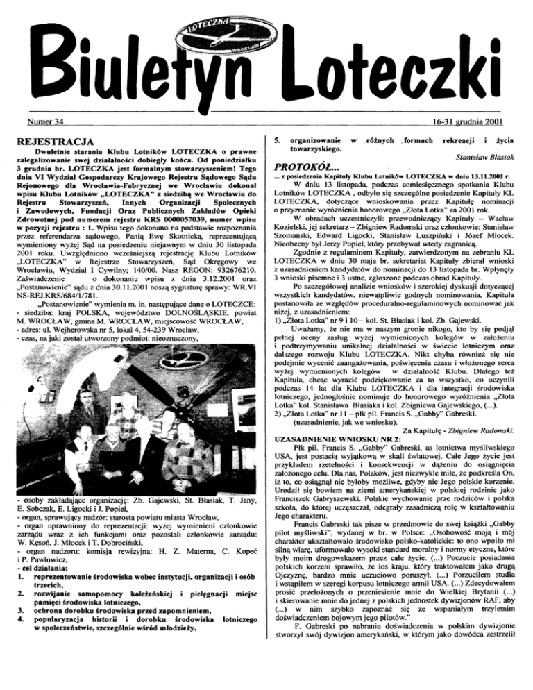 Numer 34 REJESTRACJA Dwuletnie starania Klubu Lotników LOTECZKA o prawne zalegalizowanie swej działalności dobiegły końca. Od poniedziałku 3 grudn.ia br. LOTECZKA jest formalnym stowarzyszeniem! Tego dnia VI Wydział Gospodarczy Krajowego Rejestru Sądowego Sądu Rejonowego dla Wrocławia-Fabrycznej we Wrocławiu dokonał wpisu Klubu Lotników "LOTECZKA" z siedzibą we Wrocławiu do Stowarzyszeń, Innych Organizacji Społecznycb Rejestru i Zawodowych, Fundacji Oraz Publicznych Zakładów Opieki Zdrowotnej pod numerem rejestru KRS ססOO057039, numer wpisu w pozycji rejestru: l. Wpisu tego dokonano na podstawie rozpoznania przez referendarza sądowego,. Panią Ewę Skotnicką, reprezentującą wymieniony wyżej Sąd na posiedzeniu niejawnym w dniu 30 listopada 200 l roku. Uwzględniono wcześniejszą rejestrację Klubu Lotników ,~OTECZKA" w Rejestrze Stowarzyszeń, Sąd Okręgowy we Wrocławiu, Wydział I Cywilny; 140/00. Nasz REGON: 932676210. Zaświadczenie o dokonaniu wpisu z dnia 3.12.2001 oraz "Postanowienie" sądu z dnia 30.11.200 l noszą sygnaturę sprawy: WR. VI NS-REJ.KRS/684/1/781. "Postanowienie" wymienia m. in. następujące dane o LOTECZCE: - siedziba: kraj POLSKA, województwo DOLNOŚLĄSKIE, powiat M. WROCŁAW, gmina M. WROCŁAW, miejscowość WROCŁAW, - adres: ul. Wejherowska nr 5, lokal 4, 54-239 Wrocław, - czas, najaki_został utworzony podmiot: nieoznaczony, - osoby zakładające organizację: Zb. Gajewski, Sto Błasiak, T. Jany, E. Sobczak, E. Ligocki i 1. Popiel, - organ, sprawujący nadzór: starosta powiatu miasta Wrocław, - organ uprawniony do reprezentacji: wyżej wymienieni członkowie zarządu wraz z ich funkcjami oraz pozostali członkowie zarządu: w. Kęsoń, J. Młocek iT. Dobrociński, - organ nadzoru: komisja rewizyjna: H. Z. Materna, C. Kopeć i P. Pawłowicz, - cel działania: l. reprezentowanie środowiska wobec instytucji, organizacji i osób trzecicb, 2. rozwijanie samopomocy koleżeńskiej i pielęgnacj i miejsc pamięci środowiska lotniczego, 3. ocbrona dorobku środ~iska przed zapomnieniem, 4. popularyzacja historii i dorobku środowiska lotniczego w społeczeństwie, szczególnie wśród młodzieży, 16-31 grudnia 200 l 5. organizowanie towarzyskiego. PROTOKÓŁ••• w , różnych h formach rekreacji życia Stanisław Błasiak •.. z posiedzenia Kapituły Klubu Lotników LOTECZKA w dniu 13.11.2001 r. W dniu 13 listopada, podczas comiesięcmego spotkania Klubu Lotników ŁOTECZKA , odbyło się szczególne posiedzenie Kapituły KL ŁOTECZKA, dotyczące wnioskowania przez Kapitułę nominacji o przyznanie wyróżnienia honorowego "Złota Lotka" za 200 l rok. W obradach uczestniczyli: przewodniczący Kapituły - Wacław Kozielski, jej sekretarz - Zbigniew Radomski oraz członkowie: Stanisław Szomański, Edward Ligocki, Stanisław Łuszpiński i Józef Młocek. Nieobecny był Jerzy Popiel, który przebywał wtedy zagranicą. Zgodnie z regulaminem Kapituły, zatwierdzonym na zebraniu KL LOTECZKA w dniu 30 maja br. sekretariat Kapituły zbierał wnioski z uzasadnieniem kandydatów do nominacji do 13 listopada br. Wpłynęły 3 wnioski pisemne i 3 ustne, zgłoszone podczas obrad Kapituły. Po szczegółowej analizie wniosków i szerokiej dyskusji dotyczącej wszystkich kandydatów, niewątpliwie godnych nominowania, Kapituła postanowiła ze względów proceduralno-regulaminowych nominować jak niżej, z uzasadnieniem: 1) ,,złota Lotka" nr 9 i 10 - kol. 51. Błasiak i kol. Zb. Gajewski. Uważamy, że nie ma w naszym gronie nikogo, kto by się podjął pełnej oceny zasług wyżej wymienionych kolegów w założeniu i podtrzymywaniu unikalnej działalności w świecie lotniczym oraz dalszego rozwoju Klubu LOTECZKA. Nikt chyba również się nie podejmie wycenić zaangażowania, poświęcenia czasu i włożonego serca wyżej wymienionych kolegów w działalność Klubu. Dlatego też Kapituł~ chcąc wyrazić podziękowanie za to wszystko, co uczynili podczas 14 lat dla Klubu LOTECZKA i dla integracji środowiska lotniczego, jednogłośnie nominuje do honorowego wyróżnienia "Złota Lotka" kol. Stanisława Błasiaka i kol. Zbigniewa Gajewskiego, (...). 2) "Złota Lotka" nr 11 - płk pil. Francis S. "Gabby" Gabreski. (uzasadnienie, jak we wniosku). Za Kapitułę - Zbigniew Radomski. UZASADNIENIE WNIOSKU NR 2: Płk pil. Francis S. "Gabby" Gabreski, as lotnictwa myśliwskiego USA, jest postacią wyjątkową w skali śWIatowej. Całe Jego życie jest przykładem rzetelności i konsekwencji w dążeniu do osiągnięcia założonego celu. Dla nas, Polaków, jest niezwykle miłe, że podkreśla On, iż to, co osiągnął nie byłoby możliwe, gdyby nie Jego polskie korzenie. Urodził się bowiem na ziemi amerykańskiej w polskiej rodzinie jako Franciszek Gabryszewski. Polskie wychowanie prze rodziców i polska szkoła, do której uczęszczał, odegrały zasadniczą rolę w kształtowaniu Jego charakteru. Francis Gabreski tak pisze w przedmowie do swej książki "Gabby pilot myśliwski", wydanej w hr. w Polsce: "Osobowość moją i mój charakter ukształtowało środowisko polsko-katolickie: to ono wpoiło mi silną wiarę, uformowało wysoki standard moralny j normy etyczne, które były moim drogowskazem przez całe życie. (...) Poczucie posiadania polskich korzeni sprawiło, że los kraju, który traktowałem jako drugą Ojczyznę, bardzo mnie uczuciowo poruszył. (... ) Porzuciłem studia i wstąpiłem w szeregi korpusu lotniczego annii USA. (...) Zdecydowałem prosić przełożonych o przeniesienie mnie do Wielkiej Brytanii (...) i skierowanie mnie do jednej z polskich jednostek dywizjonów RAF, aby (...) w nim szybko zapomać się ze wspaniałym trzyletnim doświadczeniem bojowym jego pilotów." F. Gabreski po nabraniu doświadczenia w polskim dywizjonie stworzył swój dywizjon amerykański, w którym jako dowódca zestrzelił 28 samolotów niemieckich na pewno i 3 prawdopodobnie. W roku 1944 dostał się do niewoli niemieckiej, gdzie p