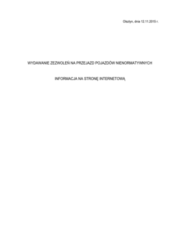 Olsztyn, dnia 12.11.2015 r. WYDAWANIE ZEZWOLEŃ NA PRZEJAZD POJAZDÓW NIENORMATYWNYCH INFORMACJA NA STRONĘ INTERNETOWĄ WYDAWANIE ZEZWOLEŃ NA PRZEJAZD POJAZDÓW NIENORMATYWNYCH 1. ZASTOSOWANIE Procedura dotyczy każdego podmiotu, który ubiega się o wydanie zezwolenia na przejazd pojazdu nienormatywnego. Pojazd nienormatywny jest to pojazd lub zespół pojazdów, którego naciski osi wraz z ładunkiem lub bez ładunku są większe od dopuszczalnych, przewidzianych dla danej drogi w przepisach o drogach publicznych, lub którego wymiary lub rzeczywista masa całkowita wraz z ładunkiem lub bez niego są większe od dopuszczalnych, przewidzianych w przepisach ustawy z dnia 18 sierpnia 2011 r. o zmianie ustawy – Prawo o ruchu drogowym oraz niektórych innych ustaw. Zgodnie z art. 64 ust. 1 ustawy z dnia 20 czerwca 1997 r. Prawo o ruchu drogowym, ruch pojazdu nienormatywnego jest dozwolony pod warunkiem uzyskania zezwolenia na przejazd pojazdu nienormatywnego odpowiedniej kategorii, wydawanego w drodze decyzji administracyjnej, przez właściwy organ. 2. WYMAGANE DOKUMENTY W celu uzyskania zezwolenia na przejazd pojazdu nienormatywnego należy w siedzibie Powiatowej Służby Drogowej w Olsztynie złożyć wniosek o wydanie zezwolenia na przejazd pojazdu nienormatywnego. Wniosek o wydanie zezwolenia na przejazd pojazdu nienormatywnego powinien być złożony wraz z dowodem wniesienia opłaty za wydanie zezwolenia. Wniosek o wydanie zezwolenia kategorii I na przejazd pojazdu nienormatywnego na okres miesiąca/ 6 miesięcy/ 12 miesięcy – plik do pobrania w formacie .pdf Wniosek o wydanie zezwolenia kategorii II na przejazd pojazdu nienormatywnego na okres 12 miesięcy – plik do pobrania w formacie .pdf Wniosek o wydanie zezwolenia kategorii III na przejazd pojazdu nienormatywnego na okres miesiąca/ 6 miesięcy/ 12 miesięcy/ 24 miesięcy – plik do pobrania w formacie .pdf 3. MIEJSCE ZŁOŻENIA DOKUMENTÓW Powiatowa Służba Drogowa w Olsztynie ul. Cementowa 3 10-429 Olsztyn IV piętro, pokój 407 tel. 089 535 66 30 fax. 089 535 66 40 poniedziałek – piątek w godz. 7:00 – 15:00 Informacje na temat zezwoleń na przejazd pojazdu nienormatywnego można uzyskać w pokoju nr 412 lub pod numerem telefonu 089 535 66 41 lub 089 535 66 42. 4. INFORMACJE DOTYCZĄCE ZEZWOLEŃ NA PRZEJAZD POJAZDU NIENORMATYWNEGO Zezwolenie Pojazdy nienormatywne Organ wydający Drogi kategorii I a) o wymiarach oraz rzeczywistej masie całkowitej nie większej od dopuszczalnych, b) o naciskach osi nieprzekraczających wielkości przewidzianych dla dróg o dopuszczalnym nacisku pojedynczej osi napędowej do 11,5 t; zarządca drogi właściwy dla drogi, po której ruch ma być wykonywany gminne, powiatowe, wojewódzkie wskazane w zezwoleniu kategorii II a) o długości, wysokości oraz rzeczywistej masie całkowitej nie większych od dopuszczalnych, b) o naciskach osi nie większych od dopuszczalnych dla danej drogi c) o szerokości nieprzekraczającej 3,5 m; starosta właściwy ze względu na siedzibę wnioskodawcy albo miejsce rozpoczęcia przejazdu publiczne z wyjątkiem ekspresowych i autostrad kategorii III a) o naciskach osi i rzeczywistej masie całkowitej nie większych od dopuszczalnych, b) o szerokości nieprzekraczającej 3,2 m, c) o długości nieprzekraczającej: 15 m dla pojedynczego pojazdu, 23 m dla zespołu pojazdów, d) o wysokości nieprzekraczającej 4,3 m; starosta właściwy ze względu na siedzibę wnioskodawcy albo miejsce rozpoczęcia przejazdu, publiczne naczelnik urzędu celnego przy wjeździe na terytorium RP Kierujący pojazdem nienormatywnym jest obowiązany mieć przy sobie i okazywać uprawnionym osobom zezwolenie na przejazd pojazdu nienormatywnego odpowiedniej kategorii, albo wypis z zezwolenia w przypadku zezwolenia kategorii I. Zezwolenie kategorii I Zezwolenie kategorii I na przejazd pojazdu nienormatywnego jest wydawane w celu umożliwienia dojazdu do i ze wskazanego w zezwoleniu miejsca i uprawnia do ruchu po drodze powiatowej wskazanej w zezwoleniu. Zezwolenie wydaje się na wniosek zainteresowanego podmiotu. Zezwolenie wydaje Dyrektor Powiatowej Służby Drogowej w Olsztynie, działając z upoważnienia Zarządu Powiatu w Olsztynie jako zarządca dróg powiatowych, po których ruch ma być wykonywany. Wydając zezwolenie, zarządca drogi wydaje także jego wypis lub wypisy w liczbie odpowiadającej liczbie pojazdów samochodowych określonych we wniosku o wydanie zezwolenia. Zezwolenie wydaje się dla podmiotu wskazanego we wniosku o wydanie zezwolenia, na wskazany we wniosku okres: miesiąca, 6 miesięcy lub 12 miesięcy, bez wskazania pojazdów, którymi ma być wykonywany przewóz. Opłatę za wydanie zezwolenia ustala się w kwocie stanowiącej iloczyn liczby wypisów i odpowiedniej stawki opłaty za zezwolenie w tej kategorii. Zezwolenie kategorii II Zezwolenie kategorii II jest wydawane na przejazd nienormatywnego pojazdu wolnobieżnego, ciągnika rolniczego albo zespołu pojazdów składającego się z pojazdu wolnobieżnego lub ciągnika rolniczego i przyczepy specjalnej i uprawnia do ruchu po drogach publicznych z wyjątkiem dróg ekspresowych i autostrad. Zezwolenie wydaje się na wniosek podmiotu wykonującego przejazd. Zezwolenie wydaje Dyrektor Powiatowej Służby Drogowej w Olsztynie, działając z upoważnienia Starosty Olsztyńskiego, ze względu na siedzibę wnioskodawcy albo miejsce rozpoczęcia przejazdu. Zezwolenie wydaje się na okres 12 miesięcy, wskazując w nim podmiot wykonujący przejazd oraz pojazd, którym będzie wykonywany przejazd. Do ruchu pojazdu nienormatywnego, dla którego zostało wydane zezwolenie kategorii II, nie jest wymagane pilotowanie przejazdu przez pilota. Zezwolenie kategorii III Zezwolenie kategorii III jest wydawane na przejazd pojazdu nienormatywnego po drogach publicznych. Zezwolenie kategorii III na przejazd pojazdu nienormatywnego jest wydawane na wskazany we wniosku okres: miesiąca, 6 miesięcy, 12 miesięcy lub 24