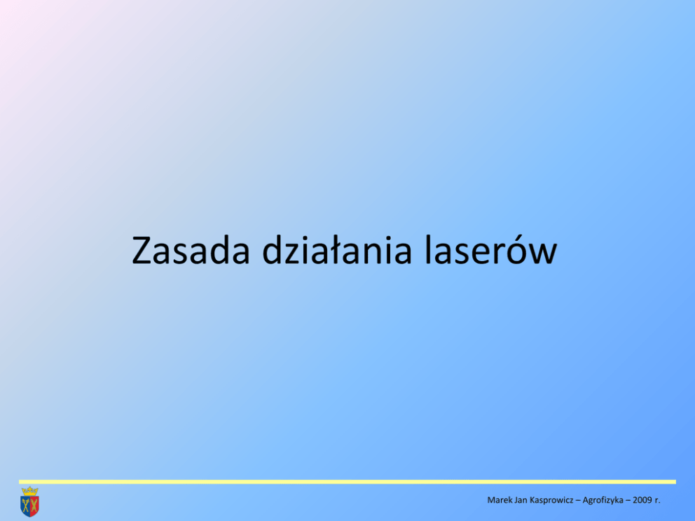 Zasada działania laserów Marek Jan Kasprowicz – Agrofizyka – 2009 r. Laser to generator promieniowania, wykorzystujący zjawisko emisji wymuszonej. Nazwa jest akronimem od Light Amplification by Stimulated Emission of Radiation — wzmocnienie światła poprzez wymuszoną emisję promieniowania. Promieniowanie lasera ma charakterystyczne właściwości, trudne lub wręcz niemożliwe do osiągnięcia w innych typach źródeł promieniowania. Jest spójne w czasie i przestrzeni, zazwyczaj spolaryzowane i ma postad wiązki o bardzo małej rozbieżności. Marek Jan Kasprowicz – Agrofizyka – 2009 r. Oddziaływanie fotonów z atomami Marek Jan Kasprowicz – Agrofizyka – 2009 r. Budowa lasera Laser składa się z trzech głównych modułów: • ośrodka czynnego – materiału, który przetwarza energię na emitowane światło • układu pompującego energię • rezonatora – zapewniającego sprzężenie zwrotne Marek Jan Kasprowicz – Agrofizyka – 2009 r. Marek Jan Kasprowicz – Agrofizyka – 2009 r. Marek Jan Kasprowicz – Agrofizyka – 2009 r. Marek Jan Kasprowicz – Agrofizyka – 2009 r. Marek Jan Kasprowicz – Agrofizyka – 2009 r.