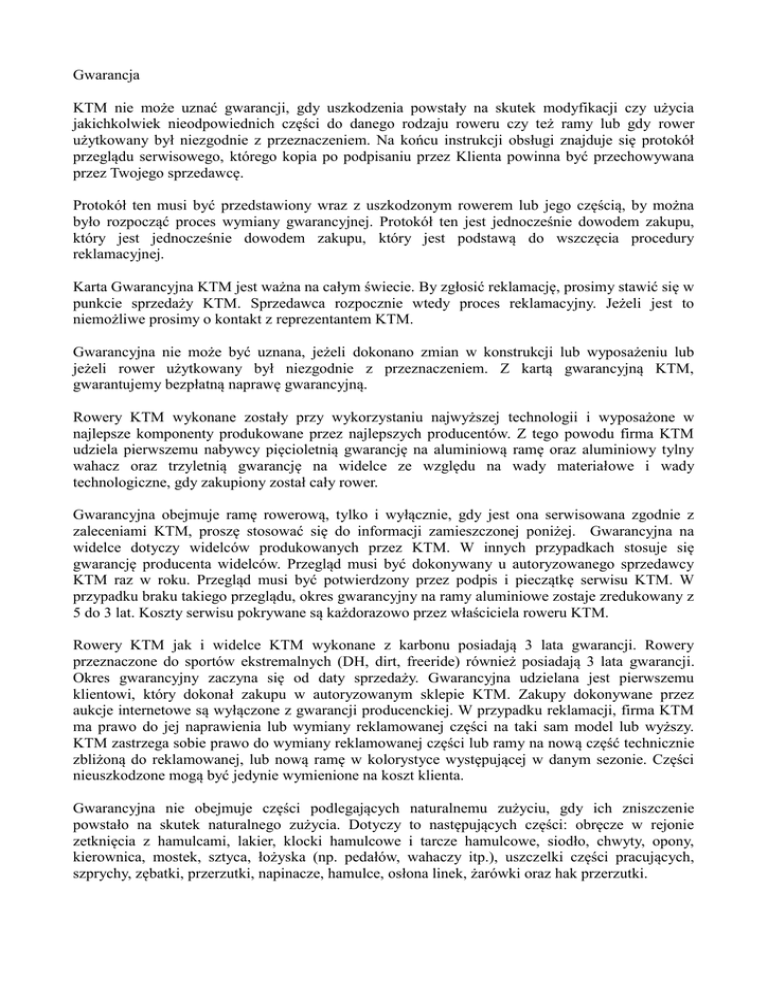 Gwarancja KTM nie może uznać gwarancji, gdy uszkodzenia powstały na skutek modyfikacji czy użycia jakichkolwiek nieodpowiednich części do danego rodzaju roweru czy też ramy lub gdy rower użytkowany był niezgodnie z przeznaczeniem. Na końcu instrukcji obsługi znajduje się protokół przeglądu serwisowego, którego kopia po podpisaniu przez Klienta powinna być przechowywana przez Twojego sprzedawcę. Protokół ten musi być przedstawiony wraz z uszkodzonym rowerem lub jego częścią, by można było rozpocząć proces wymiany gwarancyjnej. Protokół ten jest jednocześnie dowodem zakupu, który jest jednocześnie dowodem zakupu, który jest podstawą do wszczęcia procedury reklamacyjnej. Karta Gwarancyjna KTM jest ważna na całym świecie. By zgłosić reklamację, prosimy stawić się w punkcie sprzedaży KTM. Sprzedawca rozpocznie wtedy proces reklamacyjny. Jeżeli jest to niemożliwe prosimy o kontakt z reprezentantem KTM. Gwarancyjna nie może być uznana, jeżeli dokonano zmian w konstrukcji lub wyposażeniu lub jeżeli rower użytkowany był niezgodnie z przeznaczeniem. Z kartą gwarancyjną KTM, gwarantujemy bezpłatną naprawę gwarancyjną. Rowery KTM wykonane zostały przy wykorzystaniu najwyższej technologii i wyposażone w najlepsze komponenty produkowane przez najlepszych producentów. Z tego powodu firma KTM udziela pierwszemu nabywcy pięcioletnią gwarancję na aluminiową ramę oraz aluminiowy tylny wahacz oraz trzyletnią gwarancję na widelce ze względu na wady materiałowe i wady technologiczne, gdy zakupiony został cały rower. Gwarancyjna obejmuje ramę rowerową, tylko i wyłącznie, gdy jest ona serwisowana zgodnie z zaleceniami KTM, proszę stosować się do informacji zamieszczonej poniżej. Gwarancyjna na widelce dotyczy widelców produkowanych przez KTM. W innych przypadkach stosuje się gwarancję producenta widelców. Przegląd musi być dokonywany u autoryzowanego sprzedawcy KTM raz w roku. Przegląd musi być potwierdzony przez podpis i pieczątkę serwisu KTM. W przypadku braku takiego przeglądu, okres gwarancyjny na ramy aluminiowe zostaje zredukowany z 5 do 3 lat. Koszty serwisu pokrywane są każdorazowo przez właściciela roweru KTM. Rowery KTM jak i widelce KTM wykonane z karbonu posiadają 3 lata gwarancji. Rowery przeznaczone do sportów ekstremalnych (DH, dirt, freeride) również posiadają 3 lata gwarancji. Okres gwarancyjny zaczyna się od daty sprzedaży. Gwarancyjna udzielana jest pierwszemu klientowi, który dokonał zakupu w autoryzowanym sklepie KTM. Zakupy dokonywane przez aukcje internetowe są wyłączone z gwarancji producenckiej. W przypadku reklamacji, firma KTM ma prawo do jej naprawienia lub wymiany reklamowanej części na taki sam model lub wyższy. KTM zastrzega sobie prawo do wymiany reklamowanej części lub ramy na nową część technicznie zbliżoną do reklamowanej, lub nową ramę w kolorystyce występującej w danym sezonie. Części nieuszkodzone mogą być jedynie wymienione na koszt klienta. Gwarancyjna nie obejmuje części podlegających naturalnemu zużyciu, gdy ich zniszczenie powstało na skutek naturalnego zużycia. Dotyczy to następujących części: obręcze w rejonie zetknięcia z hamulcami, lakier, klocki hamulcowe i tarcze hamulcowe, siodło, chwyty, opony, kierownica, mostek, sztyca, łożyska (np. pedałów, wahaczy itp.), uszczelki części pracujących, szprychy, zębatki, przerzutki, napinacze, hamulce, osłona linek, żarówki oraz hak przerzutki.