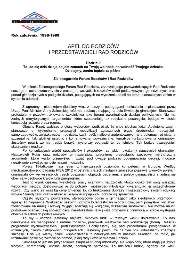 FORUMRODZICÓW IRA DRODZICÓW Rok założenia: 1998-1999 APEL DO RODZICÓW I PRZEDSTAWICIELI RAD RODZICÓW Rodzicu! To, co się dziś dzieje, to jest zamach na Twoją wolność, na wolność Twojego dziecka. Działajmy, zanim będzie za późno! Zielonogórskie Forum Rodziców i Rad Rodziców W imieniu Zielonogórskiego Forum Rad Rodziców, zrzeszającego przewodniczących Rad Rodziców naszego miasta, zwracamy się z prośbą do wszystkich rodziców szkół podstawowych, gimnazjalnych oraz ponad gimnazjalnych o podjęcie działań, polegających na wyrażeniu opinii na temat planowanych zmian w systemie edukacji. Z ogromnym niepokojem śledzimy wraz z naszymi pedagogami doniesienia o planowanej przez Urząd Pani Minister Anny Zalewskiej reformie edukacji, mającej na celu likwidację gimnazjów. Stanowczo protestujemy przeciw traktowaniu szkolnictwa jako terenu ewentualnych działań politycznych. Nie ma żadnych merytorycznych argumentów, które uzasadniają tak radykalne posunięcie, będące w istocie koncepcją rozwoju przez regres. Obecny Rząd, walcząc o głosy wyborców, podkreślał, że chce słuchać ludzi. Apelujemy zatem stanowczo o wysłuchanie propozycji modyfikacji zgłaszanych przez środowiska nauczycieli, samorządowców, związkowców i rodziców, czyli osób najlepiej zorientowanych w problemach oświaty, a szczególnie, tak głośnej ostatnio i komentowanej powszechnie, tematyce funkcjonowania gimnazjów. Jesteśmy pewni, że nie trzeba burzyć, wystarczy poprawić to, co istnieje. Tak będzie oszczędniej, skuteczniej i mądrzej. Po konsultacjach wśród specjalistów i ekspertów, za jakich uważamy nauczycieli gimnazjów, Nauczycieli Roku oraz rodziców gimnazjalistów, pragniemy przedstawić rzeczowe merytoryczne argumenty, które warto przemyśleć i wziąć pod uwagę podczas podejmowania decyzji, mogącej negatywnie zaważyć na losie naszej młodzieży. Polscy 15-latkowie mają jeden z najwyższych poziomów kompetencji w Europie. Według międzynarodowego badania PISA 2012 w ostatnich latach nastąpiła znacząca poprawa wyników polskich gimnazjalistów we wszystkich trzech obszarach objętych badaniem, a polscy gimnazjaliści znajdują się obecnie w czołówce krajów Unii Europejskiej. Jest to wynik ciężkiej, wieloletniej pracy uczniów i nauczycieli, którzy doskonalili swój warsztat, wzbogacili metody, dostosowując je do potrzeb i możliwości młodzieży, gwarantując jej wszechstronny rozwój. Czy warto za wszelką cenę zmieniać to, co funkcjonuje dobrze? Trójszczeblowy system edukacji istnieje Skandynawii oraz większości krajów europejskich i dobrze się sprawdza. Często słyszymy powtarzane, stereotypowe opinie o gimnazjach jako siedliskach przemocy i agresji. To nieprawda. Większość naszych uczniów to fantastyczni młodzi ludzie, pełni pomysłów, inicjatyw, zorientowani na naukę i rozwój. Wyjątki zdarzają się wszędzie, w każdym środowisku. Nie można na ich podstawie oceniać całej społeczności. Paradoksalnie największe problemy z przemocą w szkole występują obecnie w szkołach podstawowych. To my – rodzice jesteśmy najbliżej młodych ludzi w trudnym wieku dojrzewania. To nasi nauczyciele we współpracy z radami rodziców, pracowali kreatywnie nad konstrukcją (formą i treścią) programów wychowawczych i profilaktycznych. Pochylaliśmy się nad procedurami postępowania w rozmaitych, często nietypowych przypadkach. Jesteśmy pewni, że na tym polu odnieśliśmy znaczące sukcesy. Dziś już wiemy dzięki współdziałaniu z nauczycielami w naszych szkołach, co robić, jak rozmawiać, gdzie się zwrócić po pomoc, jakiej rady udzielić młodym ludziom. Gimnazja to już nie przypadkowe skupiska trudnej młodzieży, ale wspólnoty, które mają już swoje tradycje, ceremoniały, własne święta, cenionych patronów. To miejsca i ludzie, będący dla wielu nastolatków źródłem inspiracji, poszukiwania i odnajdowania własnej tożsamości – między dzieciństwem a dorosłością. Dla tych zaś pochodzących ze wsi i małych miasteczek, szansą na lepsze wykształcenie. Argumentem zwolenników likwidowania gimnazjów są wyniki badania opinii publicznej. Jednak gdy w wyniku dyskusji o gimnazjach poszerzyła się wiedza społeczeństwa na ten temat, zaczyna przeważać opinia o bezsensowności tej reformy. Pytamy – czy społeczeństwo zostało zapoznane z opinią tych, których ta sprawa dotyczy bezpośrednio? Czy współpracownicy Pani Minister sprawdzili stan gimnazjalnego bytu w roku 2015/16. Szanujmy prawo do głosu wszystkich obywateli, ale debata nad systemem edukacji oraz szczegółowymi rozwiązaniami wymaga specjalistycznej wiedzy oraz doświadczenia rodziców, której statystyczny wypowiadający się polityk i opiniujący publicysta często nie posiada. Likwidacja gimnazjów według jej zwolenników to niskie koszty. Nic bardziej mylnego. Do nowego systemu należałoby dostosować infrastrukturę. Nie wszystkie szkoły podstawowe można przekształcić w szkoły 8-klasowe. Brakuje w nich, między innymi, klasopracowni np. chemii, fizyki, biologii. Przeniesienie szkół podstawowych do budynków po gimnazjach również nie zawsze będzie możliwe, między innymi z powodu rejonizacji. Zapewnienia przedstawicieli partii rządzącej, że „liczba lat nauki szkolnej pozostanie ta sama”, „straszenie masowymi zwolnieniami jest nieuprawnione” są fałszywe. Wystarczy uważnie policzyć, ile lat kształcenia przedmiotowego zaproponuje się naszym uczniom po likwidacji gimnazjów. Skoro 4 lata poświęci się edukacji wczesnoszkolnej, szkole podstawowej i średniej pozostanie 8 lat. Dotychczas kształceniu przedmiotowemu poświęcano 9 lat (3 lata w szkole podstawowej, 3 lata w gimnazjum i 3 lata w szkole średniej). Jeśli doda się do tego niż demograficzny i fakt, że w wielu szkołach nauczyciele są zatrudnieni w niepełnym wymiarze godzin, wniosek jest jeden – nastąpią masowe zwolnie