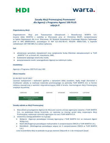 Zasady Akcji Promocyjnej Promowani dla Agencji z Programu Agenci 100 PLUS edycja II Organizatorzy Akcji: Organizatorem Akcji jest Towarzystwo Ubezpieczeń i Reasekuracji WARTA S.A. (zwane dalej WARTA) z siedzibą w Warszawie przy ul. Chmielnej 85/87, zarejestrowane w Sądzie Rejonowym dla m.st. Warszawy, XII Wydział Gospodarczy Krajowego Rejestru Sądowego pod nr KRS 0000016432, posiadające nr NIP 521-042-00-47, REGON: 000017265, o kapitale zakładowym 187 938 580 zł w całości opłacony. Cel: aktywizacja sprzedaży ubezpieczeń oraz zwiększenie liczby Klientów ubezpieczonych w TUiR „WARTA” S.A. w liniach AC, mieszkania, SME, budowanie spójnego wizerunku marki, pozycjonowanie marki i wiarygodności Agencji na rodzimym rynku. Uczestnicy: Agencje z Programu 100 PLUS sieci HDI Okres trwania: 01.06.2017-31.07.2017 Laureaci wytypowani i wyłonieni zgodnie z opisanymi dalej zasadami, będą mogli skorzystać z możliwości udziału w realizacji materiału promocyjnego na potrzeby TUiR WARTA S.A. w formie reklamy zewnętrznej o wartości nieprzekraczającej 2000 zł brutto. Harmonogram Akcji Promocyjnej znajduje się poniżej. Zasady udziału w Akcji Promocyjnej: 1. Warunkiem przystąpienia Agencji do Akcji jest czynna umowa agencyjna zawarta z TUiR WARTA S.A., na podstawie której Uczestnik, co najmniej na miesiąc przed datą rozpoczęcia Akcji Promocyjnej, wykonuje czynności agencyjne na rzecz TUiR WARTA S.A. 2. Uczestnicy zostają podzieleni na 3 grupy: Wyłączni (Agencje posiadające Umowę Agencyjną z TUiR WARTA S.A. ze statusem Agent Wyłączny), Multi (Multiagencje posiadające maksymalnie 3 zarejestrowane OWCA w TUiR WARTA S.A.), MultiMulti (Multiagencje posiadające więcej niż 3 zarejestrowane OWCA w TUiR WARTA S.A.). Lista Uczestników Akcji w podziale na grupy stanowi Załącznik nr 1 do niniejszych Zasad. 3. Zasady wyłaniania Laureatów Akcji: z możliwości udziału w realizacji materiału promocyjnego będzie mogło skorzystać 30 Laureatów (po 1 z każdej grupy z każdego Makroregionu Detalicznego), którzy osiągną najlepszy wynik pod względem nadwyżki przypisu księgowego w liniach AC, mieszkania, SME w stosunku do tego samego okresu roku 2016 w okresie naliczania wyników (01.06.2017-31.07.2017), jednocześnie nie będąc Laureatem I edycji Akcji. Na podstawie wyników sprzedażowych utworzony zostanie Ranking Laureatów. 4. W przypadku gdy Laureat zrezygnuje z nagrody (informacja przesłana drogą elektroniczną przez odpowiedniego Regionalnego Menadżera Sprzedaży w ciągu 7 dni od ogłoszenia Laureatów), jego miejsce zajmuje kolejny Laureat z Rankingu w danej grupie w danym MD. 5. Ogłoszenie Laureatów, którzy będą mogli skorzystać z możliwości udziału w realizacji materiału promocyjnego na potrzeby TUiR WARTA S.A. w formie reklamy zewnętrznej nastąpi do dnia 25.08.2017 drogą elektroniczną. 6. TUiR Warta S.A. jako administrator danych osobowych informuje, że będą one przetwarzane w zakresie i celu niezbędnym do realizacji Akcji Edukacyjnej. Podanie danych (tj. uczestnictwo w Akcji) jest dobrowolne. Uczestnikowi Akcji przysługuje prawo dostępu do treści danych oraz prawo ich poprawiania.