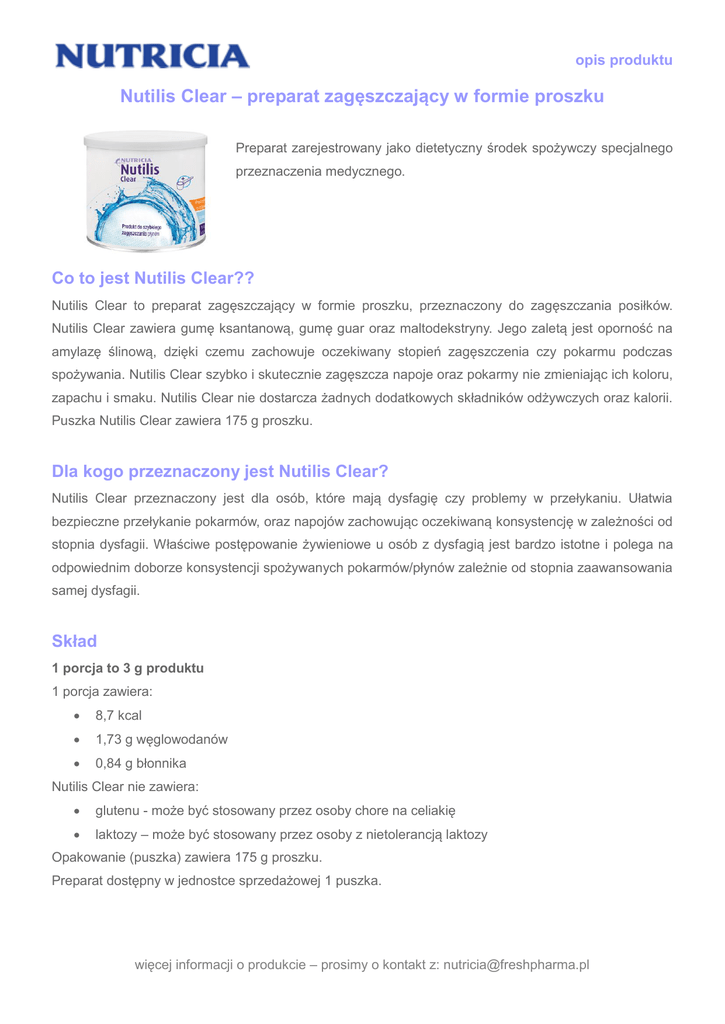 opis produktu Nutilis Clear – preparat zagęszczający w formie proszku Preparat zarejestrowany jako dietetyczny środek spożywczy specjalnego przeznaczenia medycznego. Co to jest Nutilis Clear?? Nutilis Clear to preparat zagęszczający w formie proszku, przeznaczony do zagęszczania posiłków. Nutilis Clear zawiera gumę ksantanową, gumę guar oraz maltodekstryny. Jego zaletą jest oporność na amylazę ślinową, dzięki czemu zachowuje oczekiwany stopień zagęszczenia czy pokarmu podczas spożywania. Nutilis Clear szybko i skutecznie zagęszcza napoje oraz pokarmy nie zmieniając ich koloru, zapachu i smaku. Nutilis Clear nie dostarcza żadnych dodatkowych składników odżywczych oraz kalorii. Puszka Nutilis Clear zawiera 175 g proszku. Dla kogo przeznaczony jest Nutilis Clear? Nutilis Clear przeznaczony jest dla osób, które mają dysfagię czy problemy w przełykaniu. Ułatwia bezpieczne przełykanie pokarmów, oraz napojów zachowując oczekiwaną konsystencję w zależności od stopnia dysfagii. Właściwe postępowanie żywieniowe u osób z dysfagią jest bardzo istotne i polega na odpowiednim doborze konsystencji spożywanych pokarmów/płynów zależnie od stopnia zaawansowania samej dysfagii. Skład 1 porcja to 3 g produktu 1 porcja zawiera: 8,7 kcal 1,73 g węglowodanów 0,84 g błonnika Nutilis Clear nie zawiera: glutenu - może być stosowany przez osoby chore na celiakię laktozy – może być stosowany przez osoby z nietolerancją laktozy Opakowanie (puszka) zawiera 175 g proszku. Preparat dostępny w jednostce sprzedażowej 1 puszka. więcej informacji o produkcie – prosimy o kontakt z: [email protected] opis produktu Jak stosować Nutilis Clear? W zależności od stopnia dysfagii zalecane jest zastosowanie różnej ilości preparatu Nutilis Clear. Dysfagia w stopniu Dysfagia w stopniu Dysfagia w stopniu lekkim umiarkowanym ciężkim – pokarmy i napoje o – pokarmy i napoje – pokarmy i napoje konsystencji syropu o konsystencji gęstego sosu o konsystencji budyniu 1 miarka Nutilis Clear 2 miarki Nutilis Clear 3 miarki Nutilis Clear aby zagęścić 200 ml płynu (np. woda, kawa, herbata, sok, mleko) w zależności od stopnia dysfagii, należy dodać: Dlaczego warto wybrać preparat Nutilis Clear? Nutilis Clear jest jedynym na rynku preparatem do zagęszczania napojów i pokarmów nie zwierającym skrobi. Firma Nutricia Medyczna, w odpowiedzi na potrzeby pacjentów i środowiska medycznego, wprowadza na rynek produkt Nutilis Clear dla osób cierpiący na trudności w przełykaniu czy dysfagię. Jego unikatowy skład zapewnia oporność na amylazę ślinową, dzięki czemu konsystencja pokarmu jest niezmienna podczas spożywania. Jest to niezmierne istotne dla pacjentów z dysfagia, ponieważ rozkład skrobi w jamie ustnej przez amylazę ślinową prowadzi do rozrzedzenia i zwiększenia ryzyka zachłyśnięcia (aspiracji). więcej informacji o produkcie – prosimy o kontakt z: [email protected]