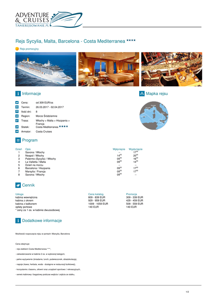 Rejs Sycylia, Malta, Barcelona - Costa Mediterranea Rejs promocyjny Informacje Cena: od 309 EUR/os Termin: 26.03.2017 - 02.04.2017 Ilość dni: 8 Region: Morze Śródziemne Trasa: Statek: Włochy > Malta > Hiszpania > Francja Costa Mediterranea Armator: Costa Cruises Mapka rejsu Program Dzień 1 2 3 4 5 6 7 8 Opis Savona / Włochy Neapol / Włochy Palermo (Sycylia) / Włochy La Valletta / Malta Dzień na morzu Barcelona / Hiszpania Marsylia / Francja Savona / Włochy Wpłynięcie -1400 0900 0900 -0930 0900 0900 Wypłynięcie 1730 2000 1600 1400 -1700 1700 -- Cennik Usługa kabina wewnętrzna kabina z oknem kabina z balkonem opłaty portowe * ceny za 1 os. w kabinie dwuosobowej Cena katalog. 809 - 839 EUR 929 - 959 EUR 1009 - 1059 EUR 140 EUR Promocja 309 - 339 EUR 429 - 459 EUR 509 - 559 EUR 140 EUR Dodatkowe informacje Możliwość rozpoczęcia rejsu w portach: Marsylia, Barcelona Cena obejmuje: - rejs statkiem Costa Mediterranea ****, - zakwaterowanie w kabinie 2 os. w wybranej kategorii, - pełne wyżywienie (śniadanie, lunch, podwieczorek, obiadokolację), - napoje (kawa, herbata, woda - dostępne w restauracji bufetowej), - korzystanie z basenu, siłowni oraz urządzeń sportowo – rekreacyjnych, - serwis kabinowy i bagażowy podczas wejścia i zejścia ze statku, 1/2 - udział we wszystkich imprezach organizowanych na statku (widowiska w teatrze, animacje, koncerty). Cena nie obejmuje: - opłat portowych, - ubezpieczenia KL, NW i bagażu, - kosztu dojazdu do portu, - wycieczek fakultatywnych zamawianych na pokładzie statku, - korzystania z punktów usługowych (pralnia, fotograf, SPA itp.), - Turystycznego Funduszu Gwarancyjnego (2,50 EUR/rejs/os.), - obowiązkowych napiwków dla załogi - osoba dorosła: 10 EUR/dzień, dzieci 3-13 lat: 5 EUR/dzień. All Inclusive (opcjonalnie): Istnieje możliwość wykupienia formuły all inclusive na czas trwania rejsu. Pakiet obejmuje napoje alkoholowe i bezalkoholowe dostępne we wszystkich barach bez ograniczeń. Napoje objęte pakietem: piwo, wino, napoje gazowane, likiery, wódka, koniak, whisky itp. Koszt pakietów: - Pakiet "Piu gusto" (z koktajlami): 28,5 EUR/dzień osoba dorosła, - Pakiet "Brindiamo" (bez koktajli): 25,5 EUR/dzień osoba dorosła, - Pakiet bezalkoholowy dla dzieci "Giovani": 16 EUR/dzień dziecko. Formuła all inclusive obowiązkowa jest na czas całego rejsu dla wszystkich osób podróżujących w jednej kabinie. Internet (opcjonalnie): Pakiety internetu linii Costa Cruises. Koszt pakietów: - "Costa Social 24h" - 4 EUR/dzień. Dostęp tylko do aplikacji social media (Facebook, Messenger, Twiter, WhatsApp, Snapchat itp.) - "Costa per minute" - 0,19 EUR/minutę (nielimitowany internet, naliczanie minutowe). - "Costa 250 MB" - 25 EUR/rejs (limit danych do 250 MB). - "Costa 500 MB" - 39 EUR/rejs (limit danych do 500 MB). - "Costa 3 GB" - 99 EUR/rejs (limit danych do 3 GB). 2/2 Powered by TCPDF (www.tcpdf.org)