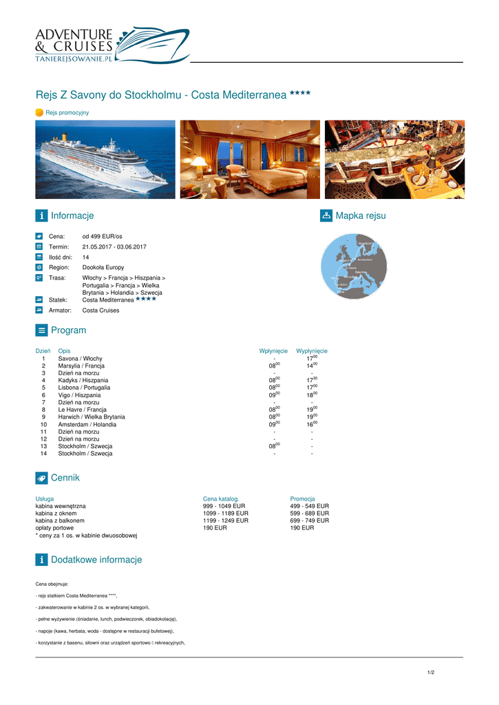 Rejs Z Savony do Stockholmu - Costa Mediterranea Rejs promocyjny Informacje Cena: od 499 EUR/os Termin: 21.05.2017 - 03.06.2017 Ilość dni: 14 Region: Dookoła Europy Trasa: Statek: Włochy > Francja > Hiszpania > Portugalia > Francja > Wielka Brytania > Holandia > Szwecja Costa Mediterranea Armator: Costa Cruises Mapka rejsu Program Dzień 1 2 3 4 5 6 7 8 9 10 11 12 13 14 Opis Savona / Włochy Marsylia / Francja Dzień na morzu Kadyks / Hiszpania Lisbona / Portugalia Vigo / Hiszpania Dzień na morzu Le Havre / Francja Harwich / Wielka Brytania Amsterdam / Holandia Dzień na morzu Dzień na morzu Stockholm / Szwecja Stockholm / Szwecja Wpłynięcie 0800 0800 0800 0900 0800 0800 0900 0800 - Wypłynięcie 1700 1400 1730 1700 1800 1900 1900 1600 - Cennik Usługa kabina wewnętrzna kabina z oknem kabina z balkonem opłaty portowe * ceny za 1 os. w kabinie dwuosobowej Cena katalog. 999 - 1049 EUR 1099 - 1189 EUR 1199 - 1249 EUR 190 EUR Promocja 499 - 549 EUR 599 - 689 EUR 699 - 749 EUR 190 EUR Dodatkowe informacje Cena obejmuje: - rejs statkiem Costa Mediterranea ****, - zakwaterowanie w kabinie 2 os. w wybranej kategorii, - pełne wyżywienie (śniadanie, lunch, podwieczorek, obiadokolację), - napoje (kawa, herbata, woda - dostępne w restauracji bufetowej), - korzystanie z basenu, siłowni oraz urządzeń sportowo – rekreacyjnych, 1/2 - serwis kabinowy i bagażowy podczas wejścia i zejścia ze statku, - udział we wszystkich imprezach organizowanych na statku (widowiska w teatrze, animacje, koncerty). Cena nie obejmuje: - opłat portowych, - ubezpieczenia KL, NW i bagażu, - kosztu dojazdu do portu, - wycieczek fakultatywnych zamawianych na pokładzie statku, - korzystania z punktów usługowych (pralnia, fotograf, SPA itp.), - Turystycznego Funduszu Gwarancyjnego (2,50 EUR/rejs/os.), - obowiązkowych napiwków dla załogi - osoba dorosła: 10 EUR/dzień, dzieci 3-13 lat: 5 EUR/dzień. All Inclusive (opcjonalnie): Istnieje możliwość wykupienia formuły all inclusive na czas trwania rejsu. Pakiet obejmuje napoje alkoholowe i bezalkoholowe dostępne we wszystkich barach bez ograniczeń. Napoje objęte pakietem: piwo, wino, napoje gazowane, likiery, wódka, koniak, whisky itp. Koszt pakietów: - Pakiet "Piu gusto" (z koktajlami): 28,5 EUR/dzień osoba dorosła, - Pakiet "Brindiamo" (bez koktajli): 25,5 EUR/dzień osoba dorosła, - Pakiet bezalkoholowy dla dzieci "Giovani": 16 EUR/dzień dziecko. Formuła all inclusive obowiązkowa jest na czas całego rejsu dla wszystkich osób podróżujących w jednej kabinie. Internet (opcjonalnie): Pakiety internetu linii Costa Cruises. Koszt pakietów: - "Costa Social 24h" - 4 EUR/dzień. Dostęp tylko do aplikacji social media (Facebook, Messenger, Twiter, WhatsApp, Snapchat itp.) - "Costa per minute" - 0,19 EUR/minutę (nielimitowany internet, naliczanie minutowe). - "Costa 250 MB" - 25 EUR/rejs (limit danych do 250 MB). - "Costa 500 MB" - 39 EUR/rejs (limit danych do 500 MB). - "Costa 3 GB" - 99 EUR/rejs (limit danych do 3 GB). 2/2 Powered by TCPDF (www.tcpdf.org)