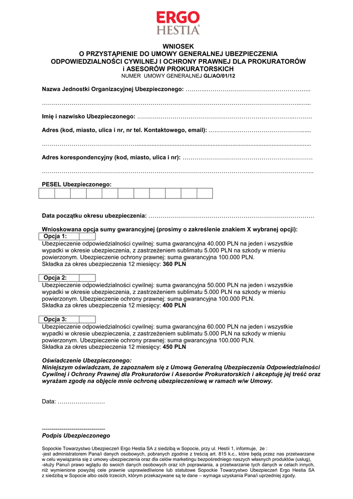 WNIOSEK O PRZYSTĄPIENIE DO UMOWY GENERALNEJ UBEZPIECZENIA ODPOWIEDZIALNOŚCI CYWILNEJ I OCHRONY PRAWNEJ DLA PROKURATORÓW i ASESORÓW PROKURATORSKICH NUMER UMOWY GENERALNEJ GL/AO/01/12 Nazwa Jednostki Organizacyjnej Ubezpieczonego: ………..…………………………………………….. …………………………………………………………………………………………………………………..…... Imię i nazwisko Ubezpieczonego: ……………………………………………………………………..……… Adres (kod, miasto, ulica i nr, nr tel. Kontaktowego, email): .….……………………………………...... ………………………………………….......................................................................................................... Adres korespondencyjny (kod, miasto, ulica i nr): ………………………………………………………… ……………………………………………………………………………………………………………….……….. PESEL Ubezpieczonego: Data początku okresu ubezpieczenia: ………………………………………………………………………… Wnioskowana opcja sumy gwarancyjnej (prosimy o zakreślenie znakiem X wybranej opcji): Opcja 1: Ubezpieczenie odpowiedzialności cywilnej: suma gwarancyjna 40.000 PLN na jeden i wszystkie wypadki w okresie ubezpieczenia, z zastrzeżeniem sublimatu 5.000 PLN na szkody w mieniu powierzonym. Ubezpieczenie ochrony prawnej: suma gwarancyjna 100.000 PLN. Składka za okres ubezpieczenia 12 miesięcy: 360 PLN Opcja 2: Ubezpieczenie odpowiedzialności cywilnej: suma gwarancyjna 50.000 PLN na jeden i wszystkie wypadki w okresie ubezpieczenia, z zastrzeżeniem sublimatu 5.000 PLN na szkody w mieniu powierzonym. Ubezpieczenie ochrony prawnej: suma gwarancyjna 100.000 PLN. Składka za okres ubezpieczenia 12 miesięcy: 400 PLN Opcja 3: Ubezpieczenie odpowiedzialności cywilnej: suma gwarancyjna 60.000 PLN na jeden i wszystkie wypadki w okresie ubezpieczenia, z zastrzeżeniem sublimatu 5.000 PLN na szkody w mieniu powierzonym. Ubezpieczenie ochrony prawnej: suma gwarancyjna 100.000 PLN. Składka za okres ubezpieczenia 12 miesięcy: 450 PLN Oświadczenie Ubezpieczonego: Niniejszym oświadczam, że zapoznałem się z Umową Generalną Ubezpieczenia Odpowiedzialności Cywilnej i Ochrony Prawnej dla Prokuratorów i Asesorów Prokuratorskich i akceptuję jej treść oraz wyrażam zgodę na objęcie mnie ochroną ubezpieczeniową w ramach w/w Umowy. Data: …………………… -------------------------------Podpis Ubezpieczonego Sopockie Towarzystwo Ubezpieczeń Ergo Hestia SA z siedzibą w Sopocie, przy ul. Hestii 1, informuje, że : -jest administratorem Pana/i danych osobowych, pobranych zgodnie z treścią art. 815 k.c., które będą przez nas przetwarzane w celu wywiązania się z umowy ubezpieczenia oraz dla celów marketingu bezpośredniego naszych własnych produktów (usług), -służy Panu/i prawo wglądu do swoich danych osobowych oraz ich poprawiania, a przetwarzanie tych danych w celach innych, niż wymienione powyżej cele prawnie usprawiedliwione lub statutowe Sopockie Towarzystwo Ubezpieczeń Ergo Hestia SA z siedzibą w Sopocie albo osób trzecich, którym przekazywane są te dane – wymaga uzyskania Pana/i uprzedniej zgody.