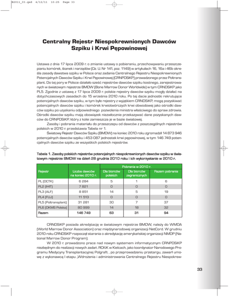 B2011_03.qxd 4/12/11 10:25 Page 33 Centralny Rejestr Niespokrewnionych Dawców Szpiku i Krwi Pêpowinowej Ustawa z dnia 17 lipca 2009 r. o zmianie ustawy o pobieraniu, przechowywaniu przeszczepianiu komórek, tkanek i narz¹dów (Dz. U. Nr 141, poz. 1149) w artyku³ach 16, 16a i 46b okrela zasady dawstwa szpiku w Polsce oraz zadania Centralnego Rejestru Niespokrewnionych Potencjalnych Dawców Szpiku i Krwi Pêpowinowej (CRNPDSiKP) prowadzonego przez Poltransplant. Do tej pory w Polsce dzia³a³o szeæ rejestrów dawców szpiku kostnego, zarejestrowanych w wiatowym rejestrze BMDW (Bone Marrow Donor Worldwide) w tym CRNDSiKP jako PL5. Zgodnie z ustaw¹ z 17 lipca 2009 r. polskie rejestry dawców szpiku mog³y dzia³aæ na dotychczasowych zasadach do 15 wrzenia 2010 roku. Po tej dacie jednostki rekrutuj¹ce potencjalnych dawców szpiku, w tym by³e rejestry z wyj¹tkiem CRNDSiKP, mog¹ pozyskiwaæ potencjalnych dawców szpiku i komórek krwiotwórczych krwi obwodowej jako orodki dawców szpiku po uzyskaniu odpowiedniego pozwolenia ministra w³aciwego do spraw zdrowia. Orodki dawców szpiku maj¹ obowi¹zek niezw³ocznie przekazywaæ dane pozyskanych dawców do CRNPDSiKP, który z kolei zamieszcza je w bazie wiatowej. Zasoby i pobrania materia³u do przeszczepu od dawców z poszczególnych rejestrów polskich w 2010 r. przedstawia Tabela nr 1. wiatowy Rejestr Dawców Szpiku (BMDW) na koniec 2010 roku zgromadzi³ 14 873 946 potencjalnych dawców szpiku i 453 087 jednostek krwi pêpowinowej, w tym 146 749 potencjalnych dawców szpiku ze wszystkich polskich rejestrów. Tabela 1. Zasoby polskich rejestrów potencjalnych niespokrewnionych dawców szpiku w wiatowym rejestrze BMDW na dzieñ 28 grudnia 2010 roku i ich wykorzystanie w 2010 r. Rejestr Pobrania w 2010 r. Dla biorców Razem pobrania zagranicznych Liczba dawców na koniec 2010 r. Dla biorców polskich PL (DCTK) 6 284 5 1 6 PL2 (IHIT) 7 821 0 0 0 PL3 (ALF) 8 851 14 5 19 PL4 (FUJ) 11 513 0 0 0 PL5 (Poltransplant) 31 281 30 7 37 PL6 (DKMS Polska) 80 999 14 18 32 Razem 146 749 63 31 94 CRNDSiKP posiada akredytacjê w wiatowym rejestrze BMDW, nale¿y do WMDA (World Marrow Donor Association) oraz miêdzynarodowej organizacji NetCord. W grudniu 2010 roku CRNDSiKP rozpocz¹³ starania o akredytacjê amerykañskiej organizacji NMDP (National Marrow Donor Program). W 2010 r. prowadzono prace nad nowym systemem informatycznym CRNPDSiKP niezbêdnym do realizacji nowych zadañ. RCKiK w Kielcach, jako koordynator Narodowego Programu Medycyny Transplantacyjnej Polgraft , po przeprowadzeniu przetargu, zawar³ umowê z wykonawc¹ I etapu Wdro¿enia i administrowania Centralnego Rejestru Niespokrew- 33 nionych Potencjalnych Dawców Szpiku i Krwi Pêpowinowej. Nowa baza Centralnego Rejestru, zgodnie z za³o¿eniami I etapu budowy, jest zbiorem danych o wszystkich polskich dawcach z mo¿liwoci¹ przyjmowania danych od orodków dawców szpiku, przeszukiwania bazy, generowania raportu z wynikami przeszukania i list¹ wstêpnie zgodnych dawców oraz przekazywania danych dawców do bazy wiatowej BMDW. Obecnie system jest przygotowany do w³¹czenia do systemu wymiany informacji o dawcach szpiku EMDIS który jest podstaw¹ komunikacji miêdzy najwiêkszymi wiatowymi rejestrami dawców szpiku. W 2011 r. planowane jest przyst¹pienie do II etapu rozbudowy systemu CRNPDSiKP, który zapewni w³¹czenie polskiego rejestru do wiatowego systemu EMDIS. Zasoby i aktywnoæ Rejestru PL5 Obok realizacji zadañ wynikaj¹cych ze zmian ustawowych w zakresie CRNDSiKP w 2010 r Poltransplant nadal prowadzi³ rejestr okrelony symbolem PL5. Rejestr PL5 gromadzi³ dane dawców rekrutowanych i badanych za rodki publiczne. Podczas aktualizacji 28 grudnia 2010 r. PL5 przekaza³ do BMDW dane imunofenotypowe 31 281 potencjalnych niespokrewnionych dawców szpiku, a do koñca 2010 roku zwiêkszy³ liczbê zarejestrowanych dawców do 33 551 (Ryc.1). Ryc.1. Liczba dawców w PL5 w latach 20012010 W wyniku przeprowadzonego konkursu ofert w 2010 r. Poltransplant zawar³ kontrakty z 6 orodkami (Tabela 2) na rekrutacjê, badanie i typowanie antygenów zgodnoci tkankowej 2000 nowych potencjalnych niespokrewnionych dawców szpiku na ³¹czn¹ kwotê 700 000,00 PLN. W wyniku zawarcia aneksu zmniejszaj¹cego do umowy z CSK UM w £odzi ostatecznie 6 wymienionych w Tabeli 2 orodków zrekrutowa³o i przebada³o 1940 nowych dawców. 34 Tabela 2. Realizacja wiadczenia zdrowotnego dotycz¹cego rozwoju PL5 w 2010 r. Lp Orodek Liczba zrekrutowanych NDSz w 2010 r. 1 RCKiK w Katowicach 360 2 RCKiK w Lublinie 360 3 CSK UM w £odzi 300 4 RCKiK w Poznaniu 360 5 RCKiK w Kielcach 200 6 WIM w Warszawie 360 Razem 1940 Niezale¿nie od finansowania za porednictwem Centrum Organizacyjno Koordynacyjnego do Spraw Transplantacji Poltransplant badania potencjalnych dawców szpiku by³y finansowane w latach 2009-2010 ze rodków Narodowego Programu Rozwoju Medycyny Transplantacyjnej Polgraft. W wyniku realizacji umów zawartych z Ministerstwem Zdrowia w 2010 r. orodki przekaza³y wymagane dane 6740 nowych dawców do Centralnego Rejestru. Ryc. 2. Liczba dawców, których dane orodki rekrutuj¹ce przekaza³y do Centralnego Rejestru Niespokrewnionych Dawców Szpiku (PL5) w latach 2001-2010. W 2010 r. wprowadzono do bazy Centralnego Rejestru ³¹cznie 8680 potencjalnych dawców szpiku (Ryc. 2). Dawcy z rejestru PL5 w 99,9% posiadaj¹ oznaczenia antygenów zgodnoci tkankowej uk³adu HLA w obu klasach, tj. serologiczne lub genetyczne w klasie I i genetyczne w klasie II. Zasoby PL5 wyró¿nia wród rejestrów rodkowo-europejskich korzystna proporcja dawców p³ci mêskiej w wieku 26-35 lat, którzy s¹ grup¹ preferowan¹ przez orodki transplantacyjne (Ryc.3). Ryc. 3. Dawcy PL5 wed³ug p³ci i wieku 35 W 2010 roku w ramach doboru niespokrewnionych dawców szpiku do Poltransplantu z orodków poszukuj¹cych krajowych i zagranicznych wp³ynê³y 533 proby o przeszukanie bazy Centralnego Rejestru Dawców Szpiku (ryc. 4). 112 prób wp³y