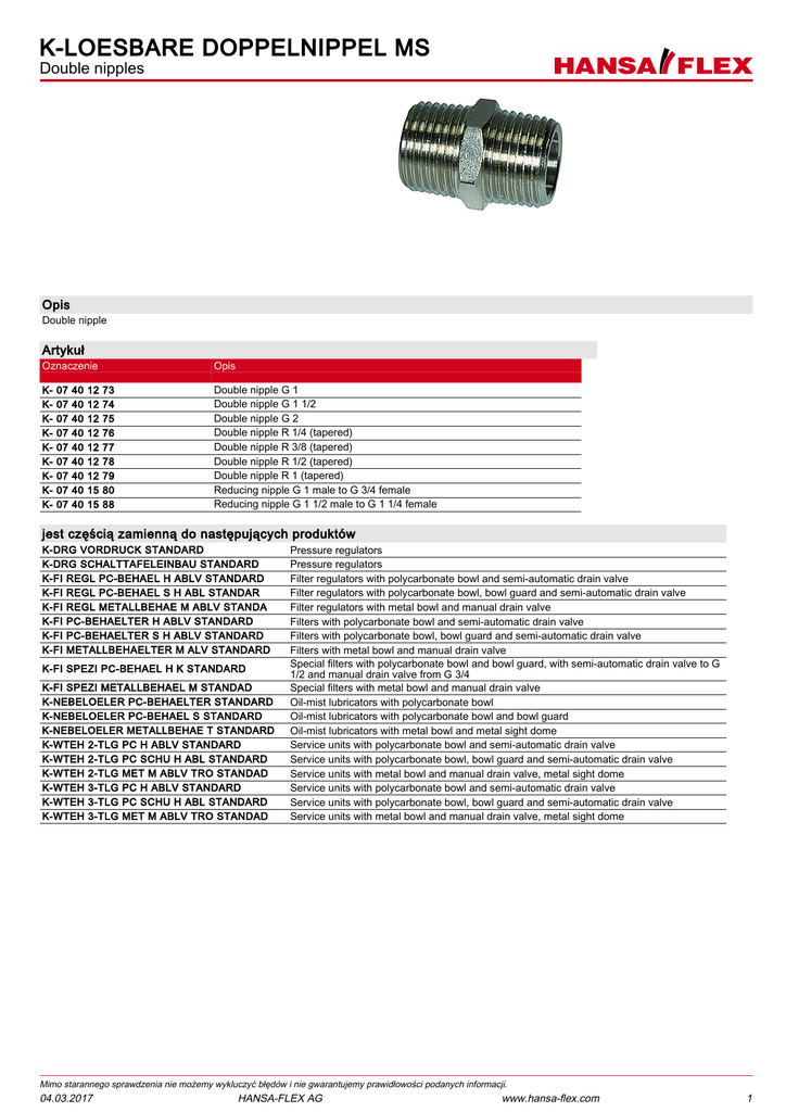 K-LOESBARE DOPPELNIPPEL MS Double nipples Opis Double nipple Artykuł Oznaczenie KKKKKKKKK- 07 07 07 07 07 07 07 07 07 40 40 40 40 40 40 40 40 40 12 12 12 12 12 12 12 15 15 Opis 73 74 75 76 77 78 79 80 88 Double nipple G 1 Double nipple G 1 1/2 Double nipple G 2 Double nipple R 1/4 (tapered) Double nipple R 3/8 (tapered) Double nipple R 1/2 (tapered) Double nipple R 1 (tapered) Reducing nipple G 1 male to G 3/4 female Reducing nipple G 1 1/2 male to G 1 1/4 female jest częścią zamienną do następujących produktów K-DRG VORDRUCK STANDARD K-DRG SCHALTTAFELEINBAU STANDARD K-FI REGL PC-BEHAEL H ABLV STANDARD K-FI REGL PC-BEHAEL S H ABL STANDAR K-FI REGL METALLBEHAE M ABLV STANDA K-FI PC-BEHAELTER H ABLV STANDARD K-FI PC-BEHAELTER S H ABLV STANDARD K-FI METALLBEHAELTER M ALV STANDARD K-FI SPEZI PC-BEHAEL H K STANDARD K-FI SPEZI METALLBEHAEL M STANDAD K-NEBELOELER PC-BEHAELTER STANDARD K-NEBELOELER PC-BEHAEL S STANDARD K-NEBELOELER METALLBEHAE T STANDARD K-WTEH 2-TLG PC H ABLV STANDARD K-WTEH 2-TLG PC SCHU H ABL STANDARD K-WTEH 2-TLG MET M ABLV TRO STANDAD K-WTEH 3-TLG PC H ABLV STANDARD K-WTEH 3-TLG PC SCHU H ABL STANDARD K-WTEH 3-TLG MET M ABLV TRO STANDAD Pressure regulators Pressure regulators Filter regulators with polycarbonate bowl and semi-automatic drain valve Filter regulators with polycarbonate bowl, bowl guard and semi-automatic drain valve Filter regulators with metal bowl and manual drain valve Filters with polycarbonate bowl and semi-automatic drain valve Filters with polycarbonate bowl, bowl guard and semi-automatic drain valve Filters with metal bowl and manual drain valve Special filters with polycarbonate bowl and bowl guard, with semi-automatic drain valve to G 1/2 and manual drain valve from G 3/4 Special filters with metal bowl and manual drain valve Oil-mist lubricators with polycarbonate bowl Oil-mist lubricators with polycarbonate bowl and bowl guard Oil-mist lubricators with metal bowl and metal sight dome Service units with polycarbonate bowl and semi-automatic drain valve Service units with polycarbonate bowl, bowl guard and semi-automatic drain valve Service units with metal bowl and manual drain valve, metal sight dome Service units with polycarbonate bowl and semi-automatic drain valve Service units with polycarbonate bowl, bowl guard and semi-automatic drain valve Service units with metal bowl and manual drain valve, metal sight dome Mimo starannego sprawdzenia nie możemy wykluczyć błędów i nie gwarantujemy prawidłowości podanych informacji. 04.03.2017 HANSA-FLEX AG www.hansa-flex.com 1