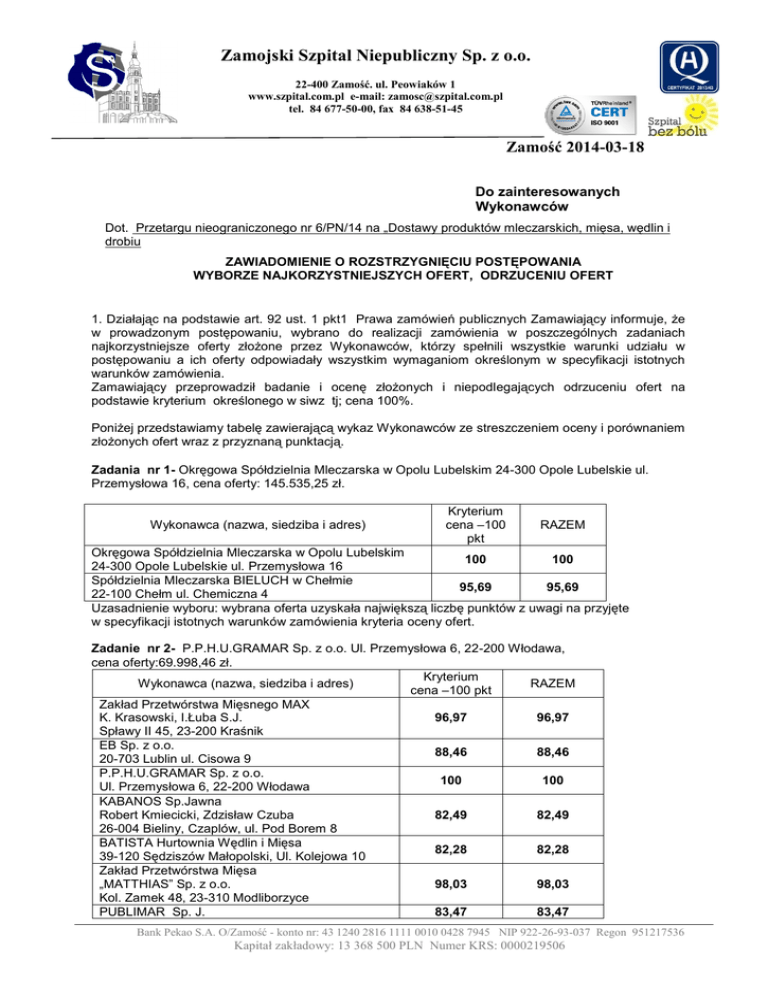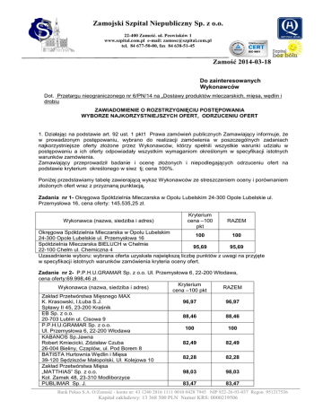 Zamojski Szpital Niepubliczny Sp. z o.o. 22-400 Zamość. ul. Peowiaków 1 www.szpital.com.pl e-mail: [email protected] tel. 84 677-50-00, fax 84 638-51-45 Zamość 2014-03-18 Do zainteresowanych Wykonawców Dot. Przetargu nieograniczonego nr 6/PN/14 na „Dostawy produktów mleczarskich, mięsa, wędlin i drobiu ZAWIADOMIENIE O ROZSTRZYGNIĘCIU POSTĘPOWANIA WYBORZE NAJKORZYSTNIEJSZYCH OFERT, ODRZUCENIU OFERT 1. Działając na podstawie art. 92 ust. 1 pkt1 Prawa zamówień publicznych Zamawiający informuje, że w prowadzonym postępowaniu, wybrano do realizacji zamówienia w poszczególnych zadaniach najkorzystniejsze oferty złożone przez Wykonawców, którzy spełnili wszystkie warunki udziału w postępowaniu a ich oferty odpowiadały wszystkim wymaganiom określonym w specyfikacji istotnych warunków zamówienia. Zamawiający przeprowadził badanie i ocenę złożonych i niepodlegających odrzuceniu ofert na podstawie kryterium określonego w siwz tj; cena 100%. Poniżej przedstawiamy tabelę zawierającą wykaz Wykonawców ze streszczeniem oceny i porównaniem złożonych ofert wraz z przyznaną punktacją. Zadania nr 1- Okręgowa Spółdzielnia Mleczarska w Opolu Lubelskim 24-300 Opole Lubelskie ul. Przemysłowa 16, cena oferty: 145.535,25 zł. Wykonawca (nazwa, siedziba i adres) Kryterium cena –100 pkt RAZEM Okręgowa Spółdzielnia Mleczarska w Opolu Lubelskim 100 100 24-300 Opole Lubelskie ul. Przemysłowa 16 Spółdzielnia Mleczarska BIELUCH w Chełmie 95,69 95,69 22-100 Chełm ul. Chemiczna 4 Uzasadnienie wyboru: wybrana oferta uzyskała największą liczbę punktów z uwagi na przyjęte w specyfikacji istotnych warunków zamówienia kryteria oceny ofert. Zadanie nr 2- P.P.H.U.GRAMAR Sp. z o.o. Ul. Przemysłowa 6, 22-200 Włodawa, cena oferty:69.998,46 zł. Kryterium Wykonawca (nazwa, siedziba i adres) RAZEM cena –100 pkt Zakład Przetwórstwa Mięsnego MAX 96,97 96,97 K. Krasowski, I.Łuba S.J. Spławy II 45, 23-200 Kraśnik EB Sp. z o.o. 88,46 88,46 20-703 Lublin ul. Cisowa 9 P.P.H.U.GRAMAR Sp. z o.o. 100 100 Ul. Przemysłowa 6, 22-200 Włodawa KABANOS Sp.Jawna 82,49 82,49 Robert Kmiecicki, Zdzisław Czuba 26-004 Bieliny, Czaplów, ul. Pod Borem 8 BATISTA Hurtownia Wędlin i Mięsa 82,28 82,28 39-120 Sędziszów Małopolski, Ul. Kolejowa 10 Zakład Przetwórstwa Mięsa 98,03 98,03 „MATTHIAS” Sp. z o.o. Kol. Zamek 48, 23-310 Modliborzyce 83,47 83,47 PUBLIMAR Sp. J. Bank Pekao S.A. O/Zamość - konto nr: 43 1240 2816 1111 0010 0428 7945 NIP 922-26-93-037 Regon 951217536 Kapitał zakładowy: 13 368 500 PLN Numer KRS: 0000219506 Lucjan Staniszewski i Spółka 20-148 Lublin ul. Związkowa 10 O/Zamość ul. Przemysłowa 21 Uzasadnienie wyboru: wybrana oferta uzyskała największą liczbę punktów z uwagi na przyjęte w specyfikacji istotnych warunków zamówienia kryteria oceny ofert. Zadanie nr 3- EB Sp. z o.o. 20-703 Lublin ul. Cisowa 9, cena oferty:47.846,40 zł. Wykonawca (nazwa, siedziba i adres) Kryterium cena –100 pkt RAZEM Zakład Przetwórstwa Mięsnego MAX 95,87 95,87 K. Krasowski, I.Łuba S.J. Spławy II 45, 23-200 Kraśnik EB Sp. z o.o. 100 100 20-703 Lublin ul. Cisowa 9 P.P.H.U.GRAMAR Sp. z o.o. 81,70 81,70 Ul. Przemysłowa 6, 22-200 Włodawa KABANOS Sp.Jawna 80,29 80,29 Robert Kmiecicki, Zdzisław Czuba 26-004 Bieliny, Czaplów, ul. Pod Borem 8 BATISTA Hurtownia Wędlin i Mięsa 81,00 81,00 39-120 Sędziszów Małopolski, Ul. Kolejowa 10 Zakład Przetwórstwa Mięsa 84,99 84,99 „MATTHIAS” Sp. z o.o. Kol. Zamek 48, 23-310 Modliborzyce PUBLIMAR Sp. J. Lucjan Staniszewski i Spółka 73,42 73,42 20-148 Lublin ul. Związkowa 10 O/Zamość ul. Przemysłowa 21 Uzasadnienie wyboru: wybrana oferta uzyskała największą liczbę punktów z uwagi na przyjęte w specyfikacji istotnych warunków zamówienia kryteria oceny ofert. Zadanie nr 4- P.P.H.U.GRAMAR Sp. z o.o. Ul. Przemysłowa 6, 22-200 Włodawa, cena oferty:54.978,00 zł. Wykonawca (nazwa, siedziba i adres) Kryterium cena –100 pkt RAZEM Zakład Przetwórstwa Mięsnego MAX 85,06 85,06 K. Krasowski, I.Łuba S.J. Spławy II 45, 23-200 Kraśnik EB Sp. z o.o. 82,56 82,56 20-703 Lublin ul. Cisowa 9 P.P.H.U.GRAMAR Sp. z o.o. 100 100 Ul. Przemysłowa 6, 22-200 Włodawa KABANOS Sp.Jawna 89,97 89,97 Robert Kmiecicki, Zdzisław Czuba 26-004 Bieliny, Czaplów, ul. Pod Borem 8 BATISTA Hurtownia Wędlin i Mięsa 81,00 81,00 39-120 Sędziszów Małopolski, Ul. Kolejowa 10 Zakład Przetwórstwa Mięsa 75,36 75,36 „MATTHIAS” Sp. z o.o. Kol. Zamek 48, 23-310 Modliborzyce PUBLIMAR Sp. J. Lucjan Staniszewski i Spółka 87,97 87,97 20-148 Lublin ul. Związkowa 10 O/Zamość ul. Przemysłowa 21 Uzasadnienie wyboru: wybrana oferta uzyskała największą liczbę punktów z uwagi na przyjęte w specyfikacji istotnych warunków zamówienia kryteria oceny ofert. 2. Umowy zawarte zostaną w terminie określonym w art. 94 ust.1 pkt. 2 Podstawą prawną dokonanego wyboru jest art. 91 ust. 1 Pzp oraz Kodeks Cywilny Bank Pekao S.A. O/Zamość - konto nr: 43 1240 2816 1111 0010 0428 7945 NIP 922-26-93-037 Regon 951217536 Kapitał zakładowy: 13 368 500 PLN Numer KRS: 0000219506 3. Działając na podstawie art. 92 ust. 1 pkt. 2 Prawa zamówień publicznych Zamawiający informuje, że w prowadzonym postępowaniu została odrzucona oferta: W zadaniu nr 2 i 3 - Zakład Przetwórstwa Mięsnego Wrębiak-Witkowski Sp. z o.o. Ul. Zamojska 46, 22600 Tomaszów Lub. - Oferta jest niezgodna ze siwz. W wyznaczonym terminie Wykonawca nie uzupełnił wymaganych w siwz dokumentów. Podstawa prawna: art.89 ust. 1 pkt. 2 ustawy Prawo zamówień publicznych 4. Działając na podstawie art. 92 ust. 1 pkt. 3 Prawa zamówień publicznych Zamawiający informuje, że w prowadzonym postępowaniu nie zostali wykluczeni żadni wykonawcy. Bank Pekao S.A. O/Zamość - konto nr: 43 1240 2816 1111 0010 0428 7945 NIP 922-26-93-037 Regon 951217536 Kapitał zakładowy: 13 368 500 PLN Numer KRS: 0000219506