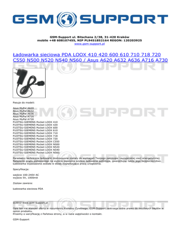 GSM-Support ul. Bitschana 2/38, 31-420 Kraków mobile +48 608107455, NIP PL9451852164 REGON: 120203925 www.gsm-support.pl Ładowarka sieciowa PDA LOOX 410 420 600 610 710 718 720 C550 N500 N520 N540 N560 / Asus A620 A632 A636 A716 A730 Pasuje do modeli: Asus MyPal A620 Asus MyPal A632 Asus MyPal A636 Asus MyPal A716 Asus MyPal A730 FUJITSU-SIEMENS FUJITSU-SIEMENS FUJITSU-SIEMENS FUJITSU-SIEMENS FUJITSU-SIEMENS FUJITSU-SIEMENS FUJITSU-SIEMENS FUJITSU-SIEMENS FUJITSU-SIEMENS FUJITSU-SIEMENS FUJITSU-SIEMENS FUJITSU-SIEMENS Pocket Pocket Pocket Pocket Pocket Pocket Pocket Pocket Pocket Pocket Pocket Pocket LOOX LOOX LOOX LOOX LOOX LOOX LOOX LOOX LOOX LOOX LOOX LOOX 410 420 600 610 710 718 720 C550 N500 N520 N540 N560 Parametry techniczne ładowarki dostosowane zostały do wymagań Twojego palmtopa i europejskiej sieci energetycznej. Natężenie prądu podawanego na wyjściu zapewnia szybkie ładowanie palmtopa, gwarantując także jego bezpieczeństwo. Ładowarka wyposażona została w diodę sygnalizująca pracę urządzenia. Specyfikacja: wejście 100-240V AC wyjście 5V, 1000mA Zestaw zawiera: Ładowarka sieciowa PDA ©2012 www.gsm-support.pl Opis ten nie stanowi oferty w rozumieniu Kodeksu Cywilnego. GSM-Support zastrzega sobie prawo do możliwych błędów w opisie produktu. Prosimy o weryfikację z Państwa strony, a w razie wątpliwości o kontakt. GSM-Support ul. Bitschana 2/38 31-420 Kraków POLSKA tel. 608107455 e-mail: [email protected] Powered by TCPDF (www.tcpdf.org)