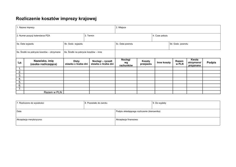 Rozliczenie kosztów imprezy krajowej 1. Nazwa imprezy 2. Miejsce 2. Numer pozycji kalendarza PZA 3. Termin 5a. Data wyjazdu 5b. Godz. wyjazdu 6a. Środki na pokrycie kosztów – otrzymane 6a. Środki na pokrycie kosztów – inne Lp. Nazwisko, imię (osoba rozliczająca) 4. Czas pobytu 5c. Data powrotu Diety stawka x liczba dni Noclegi – ryczałt stawka x liczba dni Noclegi wg rachunków 5d. Godz. powrotu Koszty przejazdu Inne koszty 1. 2. 3. 4. 5. 6. 7. Razem w PLN: 7. Rozliczono do wysokości 8. Pozostało do zwrotu 9. Do wypłaty Data Podpis składającego rozliczenie (kierownika) Akceptacja merytoryczna: Akceptacja finansowa: Razem w PLN Kwota otrzymana/ przyznana Podpis UWAGI: 1. W poz. „Czas pobytu” wpisuje się liczbę pełnych dób od chwili wyjazdu do chwili powrotu. Jedną dodatkową dobę można doliczyć, jeżeli pozostały (po odjęciu pełnych dób) czas przekracza 12 godzin. 2. Maksymalna wysokość diety krajowej wynosi 23 PLN za dobę, ryczałt za nocleg (w przypadku braku rachunku z hotelu): 34,50 PLN. 3. W przypadku posiadania rachunku za hotel, pełną kwotę z rachunku należy wpisać w rubryce „Noclegi wg rachunków” (pozostawiając w takim przypadku pustą rubrykę „Noclegi-ryczałt”). 4. W pozycji „Inne koszty” wpisuje się koszty udokumentowane rachunkami lub fakturami. Musi być na nich umieszczona kwota zapłacona; jeśli jest to rachunek lub faktura bez kwoty (jak to bywa np. w przypadku winiet na autostrady), to ten wydatek należy rozliczyć w dietach lub ryczałtem za hotel ew. kartą drogową. 5. W rubryce „Razem w PLN” – wpisuje się sumę poniesionych kosztów. 6. W rubryce „Kwota otrzymana/dotacja” – wpisuje się kwotę faktycznie przyznaną do rozliczenia lub faktycznie przekazaną zawodnikowi przez kierownika wyjazdu. 7. Poz. 7, 8 i 9 pozostają nie wypełnione. 8. Załączone rachunki (faktury) powinny być opisane na odwrocie wg schematu: 1. impreza + numer pozycji kalendarza PZA, 2. termin, 3. podpis osoby rozliczającej. 9. Jeżeli na zawody jedzie kilka osób to praktyczniej jest rozliczać się na jednym druku i napisać jedno sprawozdanie. W czasie imprezy (na zawodach, zgrupowaniu) można zebrać podpisy, a resztę druku uzupełnić po powrocie. 10. Do rozliczenia należy dołączyć sprawozdanie merytoryczne z imprezy. W razie pytań/wątpliwości prosimy o kontakt z biurem – telefon 022 875 85 05 lub mail [email protected]