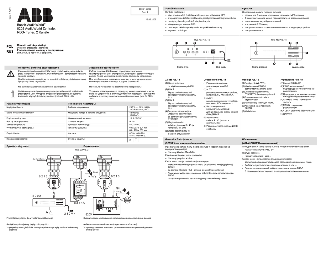 0073-1-7286 0073-1-7286 Rev. 1 19.06.2009 ® Busch-AudioWorld 8202 AudioWorld Zentrale, RDS- Tuner, 2 Kanäle Sposób działania Функция Centrala zasilająca z – złączem do dwóch źródeł zewnętrznych, np. odtwarzacz MP3 – z tego pierwsze źródło z możliwością przełączenia na zintegrowany tuner – pamięcią dla maksymalnie 8 stacji radiowych – zintegrowanym tunerem RDS – centralnym układem przełączania wszystkich odtwarzaczy – zegarem centralnym Центральный модуль питания, включая – разъем для 2 внешних источников, например, MP3-плееров – 1 из двух источников можно перенастроить на встроенный тюнер – память на максимум 8 радиостанций – встроенный RDS-тюнер – централизованное подключение всех воспроизводящих устройств – центральные часы Rys. 1a; Рис. 1a 1 Pos: 1 /35x28/35 Mehrsprachig/Art und Sprache der Doku/Montage_und_Betriebsanleitung/Montage_und_Betriebsanleitung pol-rus @ 8\mod_1245393173416_1.doc @ 44271 POL Montaż i instrukcja obsługi RUS Руководство по монтажу и эксплуатации Dokładnie przeczytać i zachować 2 3 L R L R Rys. 1b; Рис. 1b 2 PROG 1 4 Strona tylna Wskazówki odnośnie bezpieczeństwa Указания по безопасности Prace w sieci pod napięciem 230V mogą zostać wykonywane jedynie przez fachowców - elektryków. Przed montażem i demontażem odłączyć napięcie sieciowe! Skutkiem niedostosowania się do instrukcji instalacyjnych i obsługi mogą być pożary i inne zagrożenia! Работа с сетями 230 В может осуществляться только квалифицированными электриками, имеющими соответствующий допуск. Перед монтажом и демонтажом отключить напряжение! При несоблюдении указаний по монтажу и эксплуатации может возникнуть опасность пожара и другие опасности! Pos: 3 /35x28/35 Mehrsprachig/Inhalt/xx_Audio/8202/8202_pol-rus @ 8\mod_1245396549605_1.doc @ 44299 Nie stawiać urządzenia na uziemionej powierzchni! Не ставьте устройство на заземленную поверхность! Krótkie wyłączenie i ponowne włączenie pozwala usunąć krótkotrwałe przeciążenie. Jeśli występuje długotrwałe przeciążenie, do systemu koniecznie włączyć dodatkowy zasilacz (nr katal. 8209-101). Устранить кратковременную перегрузку можно, выключив и затем включив устройство. В случае длительной перегрузки необходимо добавить в систему дополнительный блок питания (арт. № 8209101). Parametry techniczne Технические параметры Napięcie robocze: Рабочее напряжение: 230 V ~ ± 10%, 50 Hz 230 В ~ ± 10%, 50Гц Strata mocy w trybie standby: Мощность потерь в режиме ожидания: Prąd nominalny max: Rodzaj zabezpieczenia: Zakres temperatury: Wymiary (wys.x szer.x głęb.): Номинальный ток макс.: Степень защиты: Диапазон температур: Габариты (ВхШхГ): < 500 mW < 500 мВт 1,2 A / SELV IP 20 5°C – 40°C Częstotliwość: Частота: 87,5 –108,0 MHz 87,5 –108,0 МГц Klasa zabezpieczenia: Степень защиты: 2 Sposób podłączenia 60 x 203 x 201 mm 60 x 203 x 201 мм Подключение Rys. 2; Рис. 2 R1 R1 L1 R1 L1 R2 L1 R2 L2 R2 L2 A L2 A D A D D 8 765 43 21 Stereo 0213 2 x 16 + -D MHz PROG opt. + 2 x 16 8 * A L1 R1 L2 R2 MEMO A 0213 -+ -+ WDR 2 - 8 765 43 21 LS LS LS LS - 10.05 PROG Standby + CLEAR STANDBY 8214U 230V~ 8205 Prezentacja systemu dla wywołania selektywnego Схематическое изображение подключения для селективного вызова A= styk bezpotencjałowy (wyłącznik/przycisk) *= po podłączeniu głośników zewnętrznych nastąpi wyłączenie wbudowanego głośnika A= беспотенциальный контакт (переключатель/кнопка) *= при подключении внешнего громкоговорителя встроенный динамик отключается + MEMO 5 6 7 Pos: 2 /35x28/35 Mehrsprachig/Sicherheitshinweise/Sicherheitshinweise 230V/Sicherheitshinweise 230V pol-rus @ 0\mod495_1.doc @ 967 8202 3 - Внимательно прочесть и сохранить 4 x 2 x 0,8 mm 2 2 1 Вид сзади Strona przednia 5 4 CLEAR 6 Вид спереди Złącza rys. 1a Соединения Рис. 1а Obsługa rys. 1b Управление Рис. 1b (1) Złącze antenowe: do wtyków antenowych IEC (2) AUX 2: Złącze cinch do urządzeń zewnętrznych (odtwarzacz CD itd.) (3) AUX 1: Złącze cinch do urządzeń zewnętrznych (odtwarzacz CD itd.) (4) Bezpotencjałowe wejście urządzenia dodatkowego: do centralnego włączania trybu STANDBY (5) Magistrala audio: kabel przyłączowy RJ 45 (w komplecie, ok. 3m) (6) Złącze zasilania 230 V: z kablem przyłączowym (1) Разъем для антенны: для штекера типа IEC (2) AUX 2: разъем для внешних устройств, например, CD-плеера и т.п. (3) AUX 1: разъем для внешних устройств, например, CD-плеера и т.п. (4) Беспотенциальный вспомогательный вход: для центральной схемы режима ОЖИДАНИЯ (5) Аудио-шина: кабель RJ 45 (входит в комплект, 3 м) (6) Разъем сетевого п