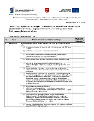 Warmia i Mazury regionem zjednoczonej Europy Projekt dofinansowany ze środków Europejskiego Funduszu Rozwoju Regionalnego w ramach Regionalnego Programu Operacyjnego Warmia i Mazury na lata 2007-2013 oraz z budżetu państwa Załącznik nr 1.10 do SIWZ „Deklaracja spełnienia wymagań i oczekiwanych parametrów technicznych przedmiotu zamówienia - Opis parametrów oferowanego urządzenia Opis przedmiotu zamówienia Część 10 Schody samojezdne - szt.1 Lp. 1. Opis Wymagania Minimalne wymagania zamawiającego Urządzenie fabrycznie nowe, rok produkcji nie wcześniej niż 2015 rok: a) urządzenie zdolne do pracy w zakresie temperatur od -30°C do +45ºC, b) wykonane w całości w systemie metrycznym c) umieszczone na podwoziu czterokołowym (przednie koła skrętne, tylne koła o niezależnym napędzie), d) obsługiwane przez jednego operatora, kabina jednoosobowa, e) centralnie umiejscowiona zamknięta kabina kierowcy o doskonałym polu widzenia w każdym kierunku (przód, tył, boki, góra), f) szyba dachowa o pełnym wymiarze dachu z wycieraczką zapewniająca możliwie jak najlepsze ustawianie schodów do samolotu, a) zabezpieczenie antykorozyjne konstrukcji schodów / podwozia, g) oświetlenie biegu schodowego, diodowe (minimum 20lx), odporne na przypadkowe uszkodzenia przez użytkowników. Przewody zasilające ukryte w konstrukcji burt. Czujnik na najniższym stopniu automatycznie załączający światło i wyłączający je także automatycznie po pewnym czasie bez użytkowania (czujniki wraz z czasomierzem), h) amortyzowane siedzenie kierowcy, i) układ podnoszenia podestu – hydrauliczny, opuszczanie grawitacyjne z hamowaniem hydraulicznym. Sterowanie i napęd układu hydraulicznego ręczny, j) maksymalna stabilizacja schodów na bazie siłowników hydraulicznych. Układ hydrauliczny siłowników, bezpieczny, odporny na możliwość rozszczelnienia instalacji. Sterowanie i napęd układu hydraulicznego z pulpitu kontrolnego w kabinie kierowcy. Ilość stabilizatorów: 4 sztuk, k) blokada bezpieczeństwa, uniemożliwiające ruch pojazdu, podczas gdy stabilizatory są wysunięte, Deklaracja wykonawcy (TAK/NIE)* Warmia i Mazury regionem zjednoczonej Europy Projekt dofinansowany ze środków Europejskiego Funduszu Rozwoju Regionalnego w ramach Regionalnego Programu Operacyjnego Warmia i Mazury na lata 2007-2013 oraz z budżetu państwa l) wszystkie koła tego samego rozmiaru, pneumatyczne, pełnowymiarowe koło zapasowe, m) burty pomostu górnego o wysokości minimum 1100 mm, rozsuwane ręcznie, n) w przedniej części pomostu ruchomy element dostosowujący usytuowanie schodów względem samolotu, o) wszystkie elementy pomostu mające możliwość styku z konstrukcją samolotu zabezpieczone odbojnicami. Odbojnie o odpowiedniej twardości, niebrudzące, p) oświetlenie obrysowe: odblaskowe zgodne z normami, q) system wsparcia operatora (tzw. guiding system), pomagający ustawić z wnętrza kabiny dokładną wysokość schodów dostosowaną do konkretnego typu samolotu, stopnice aluminiowe, perforowane, antypoślizgowe, wykonane w sposób zapewniający, że nie będzie się na nich zbierała woda czy śnieg, s) schody z funkcją pochylenia sterowaną z panelu kontrolnego na górnej platformie, r) t) panel kontrolny na platformie służący wertykalnemu ustawieniu platformy tak by osiągnąć pozycję platformy 10 cm poniżej drzwi samolotu – w celu ochrony samolotu przed uszkodzeniami spowodowanymi wertykalnym ruchem schodów/samolotu, u) platforma umożliwiająca otwarcie drzwi samolotu tak by znajdowały się na platformie, v) automatyczna skrzynia biegów – uruchomienie silnika ma być możliwe tylko w przypadku ustawienia pozycji neutralnej – zabezpieczenie przeciw kolizji, w) zdjęcie nogi z pedału gazu ma powodować łagodne zwalnianie pojazdu, x) sygnał biegu cofania y) Zamawiający dostarczy wzór logo i napisy identyfikujące użytkownika które zostaną naniesione w sposób trwały z) Wyrób będzie przystosowany do montażu systemu łączności radiowej obowiązującej u zamawiającego aa) Producent uzgodni z zamawiającym miejsce na montaż wyposażenia radiowego, sposób okablowania, miejsce montażu anteny oraz systemu zasilania bb) Producent gwarantuje że wyrób nie generuje zakłóceń radiowych i spełnia odpowiednie normy dot. środowiska naturalnego cc) Gaśnica proszkowa z zawartością środka gaśniczego min. 3 kg. dd) Komplet kluczy i narzędzi serwisowych Warmia i Mazury regionem zjednoczonej Europy Projekt dofinansowany ze środków Europejskiego Funduszu Rozwoju Regionalnego w ramach Regionalnego Programu Operacyjnego Warmia i Mazury na lata 2007-2013 oraz z budżetu państwa 2. Wymagane normy i certyfikaty ee) uchwyty umożliwiające odholowanie schodów w przypadku awarii – przedni i tylny. a) certyfikat CE, b) zgodne z IATA AHM 904, AHM 910, AHM 913, AHM 914 i AHM 915 (aktualne wydanie), c) zgodne z normami: PN-EN 1915-1:2001+A1:2009 PN-EN 1915-2:2001+A1:2009 PN-EN 1915-3:2004+A1:2009 PN-EN 1915-4:2004+A1:2009 PN-EN 12312-1:2002+A1:2009 PN-EN 60204-1:2006+A1:2009 PN-EN ISO 13850:2008, d) zgodnie z dyrektywami: 2006/42/EC, 95/16/EC, 97/23/EC, 89/336/EEC, e) właściwa deklaracja producenta w powyższym zakresie b), c) i d) powinna być dostarczona na etapie dostawy. Producent gwarantuje spełnienie wymagań homologacyjnych i/lub przepisów dozoru technicznego (jeżeli jest to wymagane) Przeznaczenie Obsługa samolotów: B 727-B747 f) 3. A319 do A340 4. Parametry a) wysokość robocza maksymalna, schody o zasięgu do 5800mm, b) wysokość robocza minimalna, schody o zasięgu od 2200mm, c) szerokość całkowita schodów od 2200mm do 2500mm, d) minimalne dopuszczalne obciążenie stopnia: ~240 kg (odpowiednik 3 dorosłych osób), e) platforma górna zaprojektowana do szybkiej ewakuacji pasażerów z samolotu – minimalne dopuszczalne obciążenie platformy górnej 1600 kg (odpowiednik ok. 20 osób), f) pojazd łatwy w manewrowaniu o promieniu 