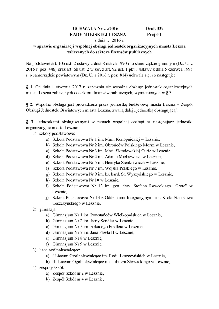 UCHWAŁA Nr …/2016 Druk 339 RADY MIEJSKIEJ LESZNA Projekt z dnia … 2016 r. w sprawie organizacji wspólnej obsługi jednostek organizacyjnych miasta Leszna zaliczanych do sektora finansów publicznych Na podstawie art. 10b ust. 2 ustawy z dnia 8 marca 1990 r. o samorządzie gminnym (Dz. U. z 2016 r. poz. 446) oraz art. 6b ust. 2 w zw. z art. 92 ust. 1 pkt 1 ustawy z dnia 5 czerwca 1998 r. o samorządzie powiatowym (Dz. U. z 2016 r. poz. 814) uchwala się, co następuje: § 1. Od dnia 1 stycznia 2017 r. zapewnia się wspólną obsługę jednostek organizacyjnych miasta Leszna zaliczanych do sektora finansów publicznych, wymienionych w § 3. § 2. Wspólna obsługa jest prowadzona przez jednostkę budżetową miasta Leszna – Zespół Obsługi Jednostek Oświatowych miasta Leszna, zwaną dalej „jednostką obsługującą”. § 3. Jednostkami obsługiwanymi w ramach wspólnej obsługi są następujące jednostki organizacyjne miasta Leszna: 1) szkoły podstawowe: a) Szkoła Podstawowa Nr 1 im. Marii Konopnickiej w Lesznie, b) Szkoła Podstawowa Nr 2 im. Obrońców Polskiego Morza w Lesznie, c) Szkoła Podstawowa Nr 3 im. Marii Skłodowskiej-Curie w Lesznie, d) Szkoła Podstawowa Nr 4 im. Adama Mickiewicza w Lesznie, e) Szkoła Podstawowa Nr 5 im. Henryka Sienkiewicza w Lesznie, f) Szkoła Podstawowa Nr 7 im. Wojska Polskiego w Lesznie, g) Szkoła Podstawowa Nr 9 im. ks. kard. St. Wyszyńskiego w Lesznie, h) Szkoła Podstawowa Nr 10 w Lesznie, i) Szkoła Podstawowa Nr 12 im. gen. dyw. Stefana Roweckiego „Grota” w Lesznie, j) Szkoła Podstawowa Nr 13 z Oddziałami Integracyjnymi im. Króla Stanisława Leszczyńskiego w Lesznie, 2) gimnazja: a) Gimnazjum Nr 1 im. Powstańców Wielkopolskich w Lesznie, b) Gimnazjum Nr 2 im. Ireny Sendler w Lesznie, c) Gimnazjum Nr 5 im. Arkadego Fiedlera w Lesznie, d) Gimnazjum Nr 7 im. Jana Pawła II w Lesznie, e) Gimnazjum Nr 8 w Lesznie, f) Gimnazjum Nr 9 w Lesznie, 3) licea ogólnokształcące: a) I Liceum Ogólnokształcące im. Rodu Leszczyńskich w Lesznie, b) III Liceum Ogólnokształcące im. Juliusza Słowackiego w Lesznie, 4) zespoły szkół: a) Zespół Szkół nr 2 w Lesznie, b) Zespół Szkół nr 4 w Lesznie, c) Zespół Szkół Ekonomicznych im. Jana Amosa Komeńskiego w Lesznie, d) Zespół Szkół Technicznych im. 55. Poznańskiego Pułku Piechoty w Lesznie, e) Zespół Szkół Rolniczo-Budowlanych im. Synów Pułku w Lesznie, f) Zespół Szkół Elektroniczno-Telekomunikacyjnych w Lesznie, 5) Zespół Szkół Specjalnych im. Janusza Korczaka w Lesznie; 6) przedszkola: a) Przedszkole Miejskie Nr 3 im. Bolka i Lolka w Lesznie, b) Przedszkole Miejskie Nr 4 w Lesznie, c) Przedszkole Miejskie Nr 5 w Lesznie, d) Przedszkole Miejskie Nr 6 w Lesznie, e) Przedszkole Miejskie Nr 7 im Misia Uszatka w Lesznie, f) Przedszkole Miejskie Nr 8 im. Czerwonego Kapturka w Lesznie, g) Przedszkole Miejskie Nr 10 im. Zielony Świat w Lesznie, h) Przedszkole Miejskie Nr 11 im. Marii Konopnickiej w Lesznie, i) Przedszkole Miejskie Nr 12 w Lesznie, j) Przedszkole Miejskie Nr 13 im. Zdobywców Świata w Lesznie, k) Przedszkole Miejskie Nr 15 w Lesznie, l) Przedszkole Miejskie Nr 18 im. Sportowa Kraina w Lesznie m) Przedszkole Miejskie Nr 19 w Lesznie, n) Przedszkole Miejskie Nr 20 im. Baśniowa Kraina w Lesznie, o) Przedszkole Miejskie Nr 21 z Oddziałami Integracyjnymi i Oddziałami Specjalnymi im. Kubusia Puchatka w Lesznie, 7) pozostałe jednostki organizacyjne: a) Bursa Międzyszkolna Nr 1 w Lesznie, b) Centrum Kształcenia Praktycznego w Lesznie, c) Poradnia Psychologiczno-Pedagogiczna w Lesznie, d) Międzyszkolny Ośrodek Sportu w Lesznie. § 4. Jednostce obsługującej, w ramach wspólnej obsługi jednostek, o których mowa w § 3, powierza się obowiązki określone w załączniku do uchwały. § 5. Wykonanie uchwały powierza się Prezydentowi Miasta Leszna. § 6. Uchwała wchodzi w życie z dniem podjęcia. Przewodniczący Rady Miejskiej Leszna Sławomir Szczot Załącznik do Uchwały Nr …/2016 Rady Miejskiej Leszna z dnia … 2016 r. w sprawie organizacji wspólnej obsługi jednostek organizacyjnych miasta Leszna zaliczanych do sektora finansów publicznych Obowiązki jednostki obsługującej Jednostce obsługującej powierza się obowiązki w zakresie: 1) rachunkowości (w całości), obejmującej w szczególności: a) przyjęte zasady (politykę) rachunkowości, b) prowadzenie, na podstawie dowodów księgowych, ksiąg rachunkowych, ujmujących zapisy zdarzeń w porządku chronologicznym i systematycznym, c) okresowe ustalanie lub sprawdzanie drogą inwentaryzacji rzeczywistego stanu aktywów i pasywów, d) wycenę aktywów i pasywów oraz ustalanie wyniku finansowego, e) gromadzenie i przechowywanie dowodów księgowych oraz pozostałej dokumentacji przewidzianej ustawą, f) poddanie badaniu, składanie do właściwego rejestru sądowego, udostępnianie i ogłaszanie sprawozdań finansowych w przypadkach przewidzianych ustawą, 2) sprawozdawczości (w całości), obejmującej w szczególności wykonanie procesów związanych z gromadzeniem środków publicznych oraz ich rozdysponowanie, w tym: a) gromadzenie dochodów i przychodów publicznych, b) wydatkowanie środków publicznych, c) zaciąganie zobowiązań angażujących środki publiczne, d) zarządzanie środkami publicznymi, 3) kompletowania oraz archiwizacji akt; 4) obsługi kasowej; 5) prowadzenia ewidencji oraz sprawozdawczości z zakresu zatrudnienia i funduszu płac; 6) sporządzanie list i dokonywanie wypłat wynagrodzeń pracowników jednostek obsługiwanych. 7) prowadzenia kart wynagrodzeń pracowników; 8) ubezpieczeń społecznych w zakresie: a) zgłaszania do ubezpieczeń społecznych, b) obliczania, potrącania i opłacania składek, c) ustalania uprawnień do świadczeń z ubezpieczeń społecznych i wypłacanie tych świadczeń oraz dokonywanie rozliczeń z tego tytułu, d) opracowywania wniosków o świadczenia emerytalne i rentowe, e) wystawiania zaświadczeń lub zg