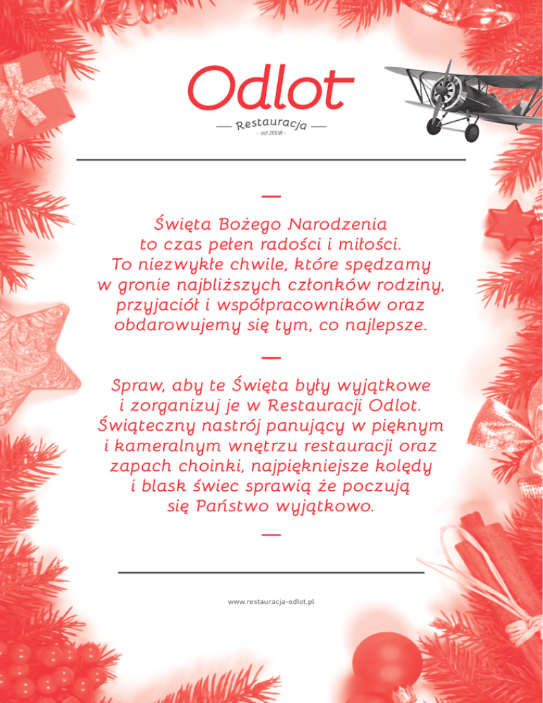 Święta Bożego Narodzenia to czas pełen radości i miłości. To niezwykłe chwile, które spędzamy w gronie najbliższych członków rodziny, przyjaciół i współpracowników oraz obdarowujemy się tym, co najlepsze. Spraw, aby te Święta były wyjątkowe i zorganizuj je w Restauracji Odlot. Świąteczny nastrój panujący w pięknym i kameralnym wnętrzu restauracji oraz zapach choinki, najpiękniejsze kolędy i blask świec sprawią że poczują się Państwo wyjątkowo. www.restauracja-odlot.pl Zestaw I 45 zł / osoba Zupa Wigilijny barszcz z chrupiącym pierożkiem grzybowym lub krem z grzybów leśnych z grzankami maślanymi i chmurką śmietanową Danie główne Smażony dzwonek z karpia w panierce migdałowej Ziemniaki pure, wigilijna kapusta z grzybami i grochem pachnąca masłem i majerankiem Deser Piernik lub strudel makowy Kawa, herbata b/o www.restauracja-odlot.pl Zestaw II 65 zł / osoba Zupa Wigilijny barszcz z chrupiącym pierożkiem grzybowym lub krem z grzybów leśnych z grzankami maślanymi i chmurką śmietanową Danie główne Smażony dzwonek z karpia w panierce migdałowej Ziemniaki pure, wigilijna kapusta z grzybami i grochem pachnąca masłem i majerankiem Obsmażane pierogi z kapustą i grzybami 3 szt./osoba Kompot z suszonych owoców / woda niegazowana b/o Deser Piernik z konfiturą różaną, makówki, drobne pierniczki Kawa, herbata b/o www.restauracja-odlot.pl Zestaw III 75 zł / osoba Przystawka Tatar z marynowanego śledzia z cebulką i kawiorem jabłkowym Zupa Wigilijny barszcz z chrupiącym pierożkiem grzybowym lub krem z grzybów leśnych z grzankami maślanymi i chmurką śmietanową Danie główne Filet z łososia lub smażony dzwonek z karpia Ziemniaki pure księżniczki, kapusta zasmażana z grzybami Pierogi z kapustą i grzybami 3 szt./osoba Kompot z suszonych owoców Deser Napoje Piernik z konfiturą różaną, makówki, drobne pierniczki Kawa, herbata b/o Woda mineralna, sok 0,25l / osoba www.restauracja-odlot.pl Zestaw IV 85 zł / osoba Przystawka Awanturka z łososia z dipem miodowo-koperkowym Zupa Wigilijny barszcz z chrupiącym pierożkiem grzybowym lub krem z grzybów leśnych z grzankami maślanymi i chmurką śmietanową Danie główne (podane na półmiskach) Smażony dzwonek z karpia w migdałowej panierce, sandacz w sosie polskim, parowany filet z łososia w sosie koperkowym Pierogi z kapustą i grzybami 3 szt./osoba Ziemniaki pure, kapusta zasmażana z grzybami Kompot z suszonych owoców Deser Napoje Piernik z konfiturą różaną, makówki, drobne pierniczki Kawa, herbata b/o Woda mineralna, sok 0,25l, napoje gazowane 0,2l / osoba www.restauracja-odlot.pl Przedstawiliśmy Państwu jedynie kilka przykładów menu, jednak nasza oferta jest bogatsza W cenie menu - świąteczny wystrój sali - opłatek wigilijny - świąteczne tło muzyczne Pytania prosimy kierować na adres: [email protected] Telefon: 501 423 443 www.restauracja-odlot.pl