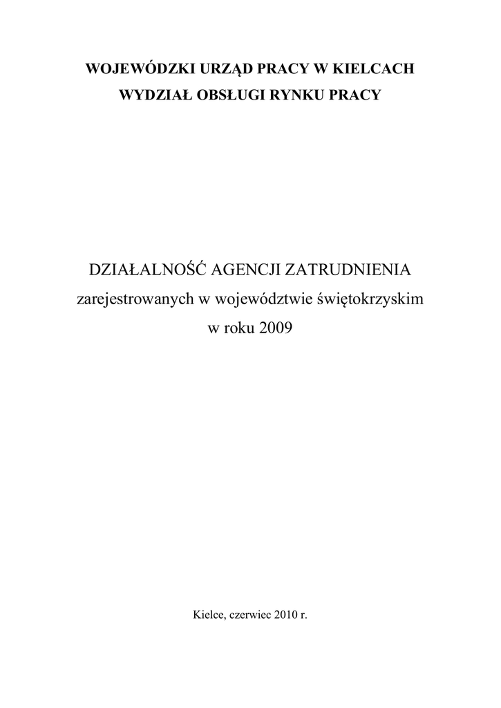WOJEWÓDZKI URZĄD PRACY W KIELCACH WYDZIAŁ OBSŁUGI RYNKU PRACY DZIAŁALNOŚĆ AGENCJI ZATRUDNIENIA zarejestrowanych w województwie świętokrzyskim w roku 2009 Kielce, czerwiec 2010 r. Działalność agencji zatrudnienia jest regulowana przepisami ustawy z dnia 2 lipca 2004 r. o swobodzie działalności gospodarczej (Dz. U. 173, poz. 1807 z późn. zm.) i podlega wpisowi do rejestru. Wojewódzki Urząd Pracy, działając w imieniu Marszałka Województwa Świętokrzyskiego, na mocy art. 8 ust.1 pkt 17, art. 18, art. 18a i art. 19 ustawy z dnia 20 kwietnia 2004 r. o promocji zatrudnienia i instytucjach rynku pracy (t.j. Dz. U. z 2008r. Nr 69, poz. 415 z późn. zm.), przepisów rozporządzenia Ministra Gospodarki i Pracy z dnia 13 października 2005 r. w sprawie wpisu do rejestru podmiotów prowadzących agencje zatrudnienia oraz informacji składanych przez agencje zatrudnienia (Dz. U. Nr 212, poz. 1770) prowadzi od dnia 1 listopada 2005 r. rejestr agencji zatrudnienia. Wpisowi do rejestru podlega działalność gospodarcza polegająca na świadczeniu usług w zakresie: 1) pośrednictwa pracy na terenie Rzeczypospolitej Polskiej; 2) pośrednictwa pracy za granicą u pracodawców zagranicznych obywateli polskich; 3) doradztwa personalnego; 4) poradnictwa zawodowego; 5) pracy tymczasowej. Wpis do rejestru agencji zatrudnienia jest potwierdzany certyfikatem, który od 1 lutego 2009 r. uprawnia do świadczenia jednej, kilku lub nawet wszystkich ww. usług. Rejestr podmiotów, które prowadzą agencje zatrudnienia jest jawny i osoby zainteresowane mogą się z nim zapoznać na stronie internetowej: www.kraz.praca.gov.pl. Rodzaje agencji zatrudnienia i zakres ich działania • Agencje pośrednictwa pracy: – zajmują się pośrednictwem pracy na terenie Polski oraz pośrednictwem do pracy za granicą u pracodawców zagranicznych, – udzielają pomocy bezrobotnym i poszukującym pracy, w tym również nie zarejestrowanym w urzędzie pracy, w uzyskaniu odpowiedniego zatrudnienia a pracodawcom w znalezieniu pracowników o odpowiednich kwalifikacjach. • Agencje doradztwa personalnego świadczą dla pracodawców usługi w zakresie: – prowadzenia analizy zatrudnienia; 2 określania kwalifikacji pracowników i ich predyspozycji zawodowych oraz – innych cech niezbędnych do wykonywania określonej pracy; wskazywania źródeł i metod pozyskania kandydatów na określone stanowiska – pracy; weryfikacji – kandydatów pod względem oczekiwanych kwalifikacji i predyspozycji. • Agencje poradnictwa zawodowego świadczą usługi polegające w szczególności na: – udzielaniu pomocy w wyborze odpowiedniego zawodu i miejsca zatrudnienia; – udzielaniu informacji zawodowych; – udzielaniu pracodawcom pomocy w doborze kandydatów do pracy na stanowiska wymagające szczególnych predyspozycji psychofizycznych. • Agencje pracy tymczasowej kierują pracowników do pracodawcy użytkownika w celu wykonywania pracy tymczasowej. Według stanu na dzień 31 grudnia 2009 r. w Polsce funkcjonowało 2 941 podmiotów posiadających wpis do rejestru agencji zatrudnienia, tj. o 870 podmiotów mniej niż na koniec 2008 r. W województwie świętokrzyskim w opisywanym okresie było 38 agencji zatrudnienia (stan ten nie zmienił się od 31 grudnia 2008 r.) Spośród tych agencji: • 34 świadczyły usługi w zakresie pośrednictwa na terenie Rzeczypospolitej Polskiej • 18 w zakresie pośrednictwa do pracy za granicą u pracodawców zagranicznych dla obywateli polskich, • 15 w zakresie doradztwa personalnego, • 14 w zakresie poradnictwa zawodowego oraz • 16 w zakresie pracy tymczasowej. Agencje zatrudnienia prowadziły działalność polegającą na świadczeniu kilku lub wszystkich ww. usług. Blisko połowa agencji (18) swoje siedziby posiada na terenie miasta Kielce. 3 Tabela I. Liczba czynnych agencji zatrudnienia wg stanu na dzień 31.12.2009 r. w podziale na województwa Ogółem Lp. 1 Województwo mazowieckie 691 2 śląskie 300 3 pomorskie 275 4 wielkopolskie 271 5 dolnośląskie 251 6 małopolskie 224 7 zachodnio-pomorskie 162 8 łódzkie 156 9 opolskie 137 10 kujawsko-pomorskie 103 11 lubelskie 90 12 podkarpackie 87 13 lubuskie 73 14 warmińsko-mazurskie 50 15 świętokrzyskie 38 16 podlaskie 33 Polska 2 941 Tabela II. Liczba agencji zatrudnienia wg typów agencji w województwie świętokrzyskim w latach 2006 - 2009 2006 2007 2008 2009 Agencje świadczące usługi pośrednictwa pracy na terenie RP Agencje świadczące usługi kierowania osób do pracy za granicą u pracodawców zagranicznych 23 26 27 34 20 21 19 18 Agencje świadczące usługi doradztwa personalnego Agencje świadczące usługi pracy tymczasowej 13 13 14 15 11 12 14 14 Agencje świadczące zawodowego 16 16 15 16 usługi poradnictwa 4 Działalność agencji zatrudnienia w woj. świętokrzyskim w 2009 r. I. Działalność agencji zatrudnienia w zakresie pośrednictwa pracy na terenie Rzeczypospolitej Polskiej. Liczba osób, które w 2009 r. skorzystały z usług agencji wyniosła 8 483, w tym 3 944 kobiet (46,5 %). W porównaniu z rokiem 2008 liczba ta zwiększyła się o 1309 osób. Ogólna liczba osób, które podjęły zatrudnienie lub inną prace zarobkową w 2009 r. za pośrednictwem agencji zatrudnienia wyniosła 668. Kobiety stanowiły 51,1 % wszystkich osób zatrudnionych. W porównaniu z danymi za rok 2008 (800 osób) liczba ta zmniejszyła się o 132 osoby, tj. o 16,5 %. Ponad połowę (51,9 %) ogólnej liczby osób zatrudnionych stanowiły osoby w przedziale wiekowym między 25 a 50 rokiem życia. Osoby młode – do 25 roku życia stanowiły 40,8 % ogółu zatrudnionych, zaś osoby starsze, po 50 roku życia – tylko 7,1 % ogółu osób zatrudnionych. Osoby, które podjęły pracę na podstawie stosunku pracy, tj. 396 osób (w tym 192 kobiety) stanowiły 59,2 % ogólnej liczby osób zatrudnionych. Tabela III. Informacja o działalności agencji zatrudnienia w zakresie pośrednictwa pracy na terenie Rzeczpospo