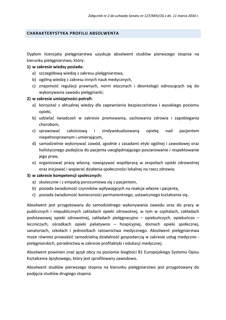 Załącznik nr 2 do uchwały Senatu nr 127/XXIV/16 z dn. 11 marca 2016 r. CHARAKTERYSTYKA PROFILU ABSOLWENTA Dyplom licencjata pielęgniarstwa uzyskuje absolwent studiów pierwszego stopnia na kierunku pielęgniarstwo, który: 1) w zakresie wiedzy posiada: a) szczegółową wiedzę z zakresu pielęgniarstwa, b) ogólną wiedzę z zakresu innych nauk medycznych, c) znajomość regulacji prawnych, norm etycznych i deontologii odnoszących się do wykonywania zawodu pielęgniarki; 2) w zakresie umiejętności potrafi: a) korzystać z aktualnej wiedzy dla zapewnienia bezpieczeństwa i wysokiego poziomu opieki, b) udzielać świadczeń w zakresie promowania, zachowania zdrowia i zapobiegania chorobom, c) sprawować całościową i zindywidualizowaną opiekę nad pacjentem niepełnosprawnym i umierającym, d) samodzielnie wykonywać zawód, zgodnie z zasadami etyki ogólnej i zawodowej oraz holistycznego podejścia do pacjenta uwzględniającego poszanowanie i respektowanie jego praw, e) organizować pracę własną: nawiązywać współpracę w zespołach opieki zdrowotnej oraz inicjować i wspierać działania społeczności lokalnej na rzecz zdrowia; 3) w zakresie kompetencji społecznych: a) skutecznie i z empatią porozumiewa się z pacjentem, b) posiada świadomość czynników wpływających na reakcje własne i pacjenta, c) posiada świadomość konieczności permanentnego, ustawicznego kształcenia się. Absolwent jest przygotowany do samodzielnego wykonywania zawodu oraz do pracy w publicznych i niepublicznych zakładach opieki zdrowotnej, w tym w szpitalach, zakładach podstawowej opieki zdrowotnej, zakładach pielęgnacyjno – opiekuńczych, opiekuńczo – leczniczych, ośrodkach opieki paliatywno – hospicyjnej, domach opieki społecznej, sanatoriach, szkołach i jednostkach ratownictwa medycznego. Absolwent pielęgniarstwa może również prowadzić samodzielną działalność gospodarczą w zakresie usług medyczno pielęgniarskich, poradnictwa w zakresie profilaktyki i edukacji medycznej. Absolwent powinien znać język obcy na poziomie biegłości B1 Europejskiego Systemu Opisu Kształcenia Językowego, który jest sprofilowany zawodowo. Absolwent studiów pierwszego stopnia na kierunku pielęgniarstwo jest przygotowany do podjęcia studiów drugiego stopnia.