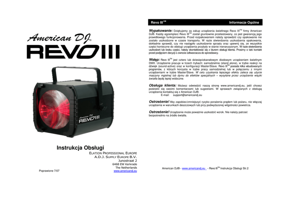 PoprawioneTM 5/07 Revo III www.americanaudio.eu Informacje Ogólne Wypakowanie: Dziękujemy za zakup urządzenia świetlnego Revo IIITM firmy American DJ®. KaŜdy egzemplarz Revo IIITM został gruntownie przetestowany, co jest gwarancją jego prawidłowego funkcjonowania. Przed rozpakowaniem naleŜy sprawdzić czy opakowanie nie zostało uszkodzone w czasie transportu. W razie stwierdzenia uszkodzenia opakowania, dokładnie sprawdź, czy nie nastąpiło uszkodzenie sprzętu oraz upewnij się, ze wszystkie części konieczne do obsługi urządzenia przybyły w stanie nienaruszonym. W razie stwierdzenia uszkodzeń lub braku części, naleŜy skontaktować się z biurem obsługi klienta. Prosimy o taki kontakt przed podjęciem decyzji o zwrocie odtwarzacza do sprzedawcy. Wstęp: Revo IIITM jest cztero lub dziesięciokanałowym diodowym urządzeniem świetlnym DMX. Urządzenie pracuje w trzech trybach: samodzielnie (stand alone), w trybie reakcji na dźwięk (sound-active) oraz w konfiguracji Master/Slave. Revo IIITM posiada kilka wbudowanych programów, z których korzysta w trybie pracy samodzielnej lub w połączeniu z innymi urządzeniami w trybie Master/Slave. W celu uzyskania lepszego efektu zaleca się uŜycie maszyny mgielnej lub dymu do efektów specjalnych – wysyłane przez urządzenie wiązki światła będą lepiej widoczne. Obsługa klienta: MoŜesz odwiedzić naszą stronę www.americandj.eu, jeśli chcesz podzielić się swoimi komentarzami lub sugestiami. W sprawach związanych z obsługą urządzenia kontaktuj się z American DJ®. E-mail: [email protected] OstrzeŜenie! Aby zapobiec/zmniejszyć ryzyko poraŜenia prądem lub poŜaru, nie włączaj urządzenia w warunkach deszczowych lub przy podwyŜszonej wilgotności powietrza. OstrzeŜenie! Urządzenie moŜe powaŜnie uszkodzić wzrok. Nie naleŜy patrzeć bezpośrednio na źródło światła. Instrukcja Obsługi ELATION PROFESSIONAL EUROPE A.D.J. SUPPLY EUROPE B.V. Junostraat 2 Poprawione 7/07 6468 EW Kerkrade The Netherlands www.americandj.eu American DJ® - www.americandj.eu - Revo IIITM Instrukcja Obsługi Str.2 TM Revo III Aby w pełni wykorzystać moŜliwości Revo IIITM, prosimy o przeczytanie instrukcji obsługi i zapoznanie z podstawowymi funkcjami urządzenia. Instrukcja zawiera waŜne informacje dotyczące bezpieczeństwa obsługi oraz sposobu konserwacji urządzenia. Prosimy o zachowanie instrukcji obsługi. TM Revo III • • • • • • • Cechy charakterystyczne Kompatybilny ze standardem DMX-512 (4 lub 10 Kanałów DMX) RGB + White (czerwony, zielony, niebieski + biały) 3 tryby pracy – Master/Slave, Stand Alone, Sound Active, Wbudowany mikrofon wewnętrzny Cyfrowy Wyświetlacz Adresów i Ustawiania Funkcji Kompatybilny z Konsolą UC3 (sprzedawana osobno) 12 pokazów w trybie Sound Active TM Revo III TM Ogólne wskazówki Bezpieczna Obsługa Uwaga! Urządzenie nie zawiera Ŝadnych elementów przeznaczonych do serwisowania przez uŜytkownika. Gwarancja na urządzenie traci waŜność, jeśli uŜytkownik zdecyduje się na samowolną naprawę którejkolwiek z części. JeŜeli jakaś część wymaga naprawy to naleŜy się skontaktować z American DJ. Revo III • • • • • • • • • • • • • • W czasie pracy, obudowa urządzenia nagrzewa się. Nie naleŜy jej dotykać gołymi rękami. • American DJ® nie ponosi Ŝadnej odpowiedzialności za usterki wynikające z nie zapoznania się przez uŜytkownika z instrukcją obsługi lub powstałe w wyniku nieautoryzowanych modyfikacji urządzenia. • American DJ® - www.americandj.eu - Revo IIITM Instrukcja Obsługi Str.3 Środki Bezpieczeństwa Aby zmniejszyć ryzyko poraŜenia prądem lub poŜaru, nie włączaj urządzenia w warunkach deszczowych lub przy podwyŜszonej wilgotności powietrza. Trzymaj urządzenie z dala od wody lub innych płynów. Upewnij się, Ŝe napięcie pobierane przez urządzenie jest takie samo jak napięcie w sieci. Nie uruchamiaj urządzenia, jeśli przewód zasilający jest uszkodzony. Nie próbuj usunąć lub wyłamać bolca uziemienia z wtyczki. Jego zadaniem jest zabezpieczenie przed poraŜeniem prądem i poŜarem w wypadku zwarcia wewnątrz urządzenia. Wyciągnij wtyczkę z kontaktu zanim włączysz Revo IIITM do obwodu zawierającego inne urządzenia elektryczne. Pod Ŝadnym pozorem nie ściągaj wierzchniej obudowy. Urządzenie nie zawiera Ŝadnych elementów przeznaczonych do serwisowania przez uŜytkownika. Nie uruchamiaj urządzenia, jeśli pokrywa obudowy jest zdjęta. Instaluj urządzenie tylko w miejscach zapewniających dobrą wentylację. Odstęp pomiędzy urządzeniem i ścianą nie powinien być mniejszy niŜ 15cm. Nie uŜywaj urządzenia, jeśli jakikolwiek jego element uległ uszkodzeniu. Urządzenie jest przeznaczone tylko do uŜytku wewnątrz budynku. Gwarancja na urządzenie straci waŜność, jeśli zostanie ono uŜyte na dworze. Instaluj urządzenie tak, aby było ono stabilne i bezpieczne. Przewód zasilania ułóŜ tak, aby nikt po nim nie chodził ani teŜ niczego na nim nie stawiał. Zwróć szczególną uwagę na miejsca, w których przewody wchodzą do wtyczek oraz wychodzą z urządzenia. Konserwacja – Sprzęt powinien być czyszczony zgodnie z zaleceniami wytwórcy. Szczegóły dotyczące czyszczenia – patrz str.14. Ciepło – Urządzenie powinno być umieszczone z dala od źródeł ciepła takich jak kaloryfery, rejestratory ciepła, piece oraz innych urządzeń wytwarzających ciepło (włącznie ze wzmacniaczami). Urządzenie powinno być serwisowane przez wykwalifikowany personel w przypadku, gdy: A. Coś spadło na urządzenie lub zostało ono zalane wodą lub innym płynem. B. Urządzenie nie zostało schowane przed deszczem. C. Urządzenie nie działa normalnie. American DJ® - www.americandj.eu - Revo IIITM Instrukcja Obsługi Str.4 TM Revo III Ustawienia Zasilanie: Przed podłączeniem urządzenia do sieci naleŜy upewnić się, Ŝe napięcie w sieci TM odpowia