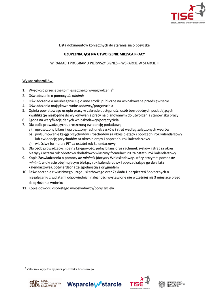 Lista dokumentów koniecznych do starania się o pożyczkę UZUPEŁNIAJĄCĄ NA UTWORZENIE MIEJSCA PRACY W RAMACH PROGRAMU PIERWSZY BIZNES – WSPARCIE W STARCIE II Wykaz załączników: 1. 2. 3. 4. 5. 6. 7. 8. 9. 10. 11. 1 Wysokość przeciętnego miesięcznego wynagrodzenia1 Oświadczenie o pomocy de minimis Oświadczenie o nieubieganiu się o inne środki publiczne na wnioskowane przedsięwzięcie Oświadczenia majątkowe wnioskodawcy/poręczyciela Opinia powiatowego urzędu pracy w zakresie dostępności osób bezrobotnych posiadających kwalifikacje niezbędne do wykonywania pracy na planowanym do utworzenia stanowisku pracy Zgoda na weryfikację danych wnioskodawcy/poręczyciela Dla osób prowadzących uproszczoną ewidencję podatkową: a) uproszczony bilans i uproszczony rachunek zysków i strat według załączonych wzorów b) podsumowanie księgi przychodów i rozchodów za okres bieżący i poprzedni rok kalendarzowy lub ewidencję przychodów za okres bieżący i poprzedni rok kalendarzowy c) właściwy formularz PIT za ostatni rok kalendarzowy Dla osób prowadzących pełną księgowość: pełny bilans oraz rachunek zysków i strat za okres bieżący i ostatni rok obrotowy dodatkowo właściwy formularz PIT za ostatni rok kalendarzowy Kopia Zaświadczenia o pomocy de minimis (dotyczy Wnioskodawcy, który otrzymał pomoc de minimis w okresie obejmującym bieżący rok kalendarzowy i poprzedzające go dwa lata kalendarzowe), potwierdzona ze zgodnością z oryginałem Zaświadczenie z właściwego urzędu skarbowego oraz Zakładu Ubezpieczeń Społecznych o niezaleganiu z wpłatami odpowiednich należności wystawione nie wcześniej niż 3 miesiące przed datą złożenia wniosku Kopia dowodu osobistego wnioskodawcy/poręczyciela Załącznik wypełniany przez pośrednika finansowego