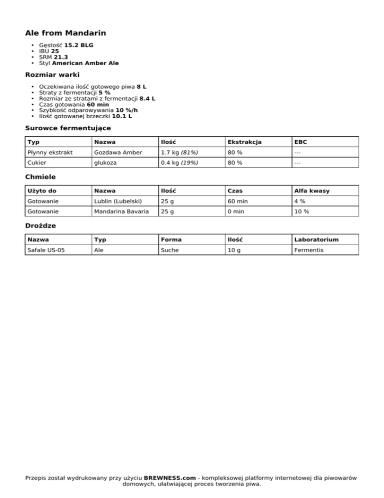 Ale from Mandarin • • • • Gęstość 15.2 BLG IBU 25 SRM 21.3 Styl American Amber Ale Rozmiar warki • • • • • • Oczekiwana ilość gotowego piwa 8 L Straty z fermentacji 5 % Rozmiar ze stratami z fermentacji 8.4 L Czas gotowania 60 min Szybkość odparowywania 10 %/h Ilość gotowanej brzeczki 10.1 L Surowce fermentujące Typ Nazwa Ilość Ekstrakcja EBC Płynny ekstrakt Gozdawa Amber 1.7 kg (81%) 80 % --- Cukier glukoza 0.4 kg (19%) 80 % --- Użyto do Nazwa Ilość Czas Alfa kwasy Gotowanie Lublin (Lubelski) 25 g 60 min 4% Gotowanie Mandarina Bavaria 25 g 0 min 10 % Nazwa Typ Forma Ilość Laboratorium Safale US-05 Ale Suche 10 g Fermentis Chmiele Drożdze Przepis został wydrukowany przy użyciu BREWNESS.com - kompleksowej platformy internetowej dla piwowarów domowych, ułatwiającej proces tworzenia piwa.