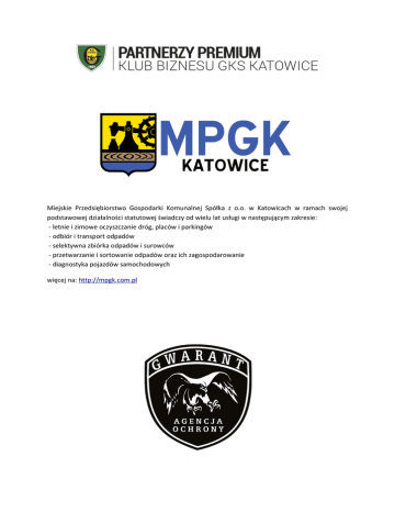 Miejskie Przedsiębiorstwo Gospodarki Komunalnej Spółka z o.o. w Katowicach w ramach swojej podstawowej działalności statutowej świadczy od wielu lat usługi w następującym zakresie: - letnie i zimowe oczyszczanie dróg, placów i parkingów - odbiór i transport odpadów - selektywna zbiórka odpadów i surowców - przetwarzanie i sortowanie odpadów oraz ich zagospodarowanie - diagnostyka pojazdów samochodowych więcej na: http://mpgk.com.pl Agencja Ochrony Gwarant z siedzibą w Katowicach, która prowadzi działalność od 2008 roku na podstawie Koncesji Ministra Spraw Wewnętrznych i Administracji. Firma działa na terenie całego kraju specjalizując się w zabezpieczaniu imprez masowych, w tym głównie sportowych oraz plenerowych. Pracownicy Agencji GWARANT zabezpieczają oprócz meczy na stadionie GKS Katowice także stadiony takich drużyn jak Górnik Zabrze, Ruch Chorzów, Piast Gliwice, Legia Warszawa, Zagłębie Sosnowiec, ROW Rybnik oraz innych klubów a także od wielu lat uczestniczą w ochronie meczy reprezentacji Polski, jak i również ochraniają największe koncerty i imprezy plenerowe na terenie całego kraju. Agencja Ochrony GWARANT specjalizuje się również w ochronie fizycznej osób i mienia, osobistej VIP, dyskotek, klubów, a także zajmuje się windykacją należności i obrotem wierzytelnościami. Nord Partner Sp. z o.o. to czołowy polski broker ubezpieczeniowy posiadający ogólnopolską sieć przedstawicielstw oraz potwierdzone wieloletnim doświadczeniem metody transferu ryzyka. Profesjonalizm oraz godne reprezentowanie mocodawców zaowocowały zaufaniem ponad 3 000 podmiotów gospodarczych. Klientami Nord Partner są wielki i średni przemysł - w tym spółki giełdowe, przedsiębiorstwa państwowe, firmy leasingowe, transportowe i spedycyjne, producenci i dystrybutorzy energii, samorządy, średni business. Reprezentując Klientów Nord Partner stawia na długofalowe relacje i opiera się na stabilnej kadrze brokerów posiadających wysokie kwalifikacje, wiedzę oraz legitymujących się wieloletnim doświadczeniem w obsłudze podmiotów gospodarczych, często mającym swój początek w 1993 roku. Zbudowana na tej bazie wyspecjalizowana firma brokerska na bieżąco dostosowuje się do wymogów dynamicznie rozwijającego się otoczenia. Nord Partner jest dziś jedną z największych niezależnych firm brokerskich na polskim rynku. Głównym celem działalności spółki Górnośląskie Towarzystwo Lotnicze jest zarządzanie portem lotniczym w Katowicach w sposób bezpieczny, efektywny oraz dający komfort użytkownikom lotniska. Spółka realizuje powyższe cele poprzez wypełnianie prawnych standardów operacyjnych i organizacyjnych, w tym utrzymanie i rozbudowę infrastruktury Katowice Airport. Zapraszamy do odwiedzenia strony internetowej pod adresem: www.gtl.com.pl Firma Payment Solution od prawie 10 lat tworzy i wdraża zaawansowane technologie informatyczne dla obiektów sportowych, parków rozrywki, torów wyścigowych, hal koncertowych oraz uniwersytetów. Systemy Payment Solution wykorzystywane są również podczas imprez masowych typu koncerty Open Air i festiwale. Firma w ostatnich latach wdrożyła zintegrowane systemy płatności bezgotówkowych na stadionach najlepszych klubów w Europie, na terenie Niemiec, Holandii, Szwajcarii, Węgier, a ostatnio również w Brazylii.