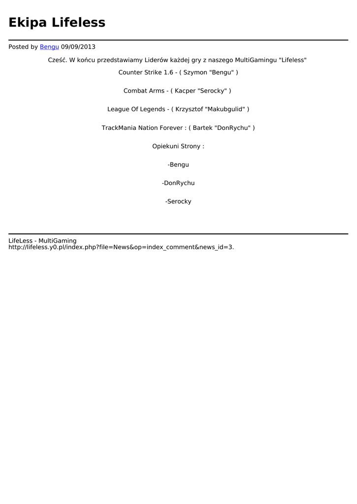 Ekipa Lifeless Posted by Bengu 09/09/2013 Cześć. W końcu przedstawiamy Liderów każdej gry z naszego MultiGamingu "Lifeless" Counter Strike 1.6 - ( Szymon "Bengu" ) Combat Arms - ( Kacper "Serocky" ) League Of Legends - ( Krzysztof "Makubgulid" ) TrackMania Nation Forever : ( Bartek "DonRychu" ) Opiekuni Strony : -Bengu -DonRychu -Serocky LifeLess - MultiGaming http://lifeless.y0.pl/index.php?file=News&op=index_comment&news_id=3.