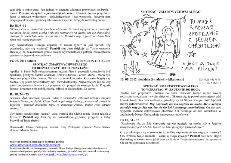 czas daje o sobie znać. Pan jednak w nocnym widzeniu przychodzi do Pawła i mówi: Przestań się lękać, a przemawiaj nie milcz. Również do nas przychodzi Jezus w naszych widzeniach i doświadczeniach i nas wzmacnia. Przysyła nam drugiego człowieka z pomocą lub słowem wsparcia. Przysyła konkretną pomoc. SPOTKAĆ ZMARTWYCHWSTAŁEGO Dz 18, 9 -11 "W nocy Pan przemówił do Pawła w widzeniu: Przestań się lękać, a przemawiaj i nie milcz, bo Ja jestem z tobą i nikt nie targnie się na ciebie, aby cię skrzywdzić, dlatego, że wielu ludu mam w tym mieście. Pozostał więc i głosił im słowo Boże przez rok i sześć miesięcy." Czy doświadczasz Bożego wsparcia w swoim życiu? W jaki sposób Bóg przychodzi, aby cię wspierać? Pomódl się: Jezu dziękuję za Twoje wsparcie. Dziękuję, że doświadczam granic swojej wytrzymałości i potrafię zaakceptować granice swojego człowieczeństwa. 19. 05. 2012 sobota Dz 18,23-28; Ps 47; J 16,23-28 SPOTKAĆ ZMARTWYCHWSTAŁEGO TO DOŚWIADCZYĆ JEGO PRZYJAŹNI Apollos i Paweł byli wykształconymi ludźmi. Piotr i pozostali Apostołowie byli rybakami, prostymi ludźmi oddanymi sprawie Jezusa. Łazarz, Marta i Maria byli bogatymi przyjaciółmi Jezusa. Nie ma znaczenia kim jesteś. Czy jesteś bogaty czy biedny. Czy jesteś wykształcony czy niewykształcony. Najważniejsze jest to, czy jesteś przyjacielem Jezusa i czy pragniesz Go przyjąć do swojego życia. Przyjaźń Jezusa i kroczące z nią pokój, radość, miłość są dla każdego. Za darmo. Dz 18, 24 - 25 "Pewien Żyd, imieniem Apollos, rodem z Aleksandrii, człowiek uczony i znający świetnie Pisma, przybył do Efezu. Znał on już drogę Pańską, przemawiał z wielkim zapałem i nauczał dokładnie tego, co dotyczyło Jezusa, znając tylko chrzest Janowy." Czy jesteś przyjacielem Jezusa? Jaką wartość dla Ciebie niesie Twoja relacja z Jezusem? Pomódl się: Jezu daj mi doświadczyć głębokiej przyjaźni z Tobą. Pozwól mi Tobie służyć. Opracowała: Jolanta Prokopiuk, korekta: Jerzy Prokopiuk, rysunek: Marta Stańco, złożenie: Mariusz Stańco. Teksty do medytacji znajdują się na stronie parafii: www.strachocin.archidiecezja.wroc.pl. Istnieje możliwość codziennego otrzymywania Słowa Bożego (liturgia na każdy dzień) wraz z rozważaniami poprzez pocztę elektroniczną; wystarczy przesłać swój adres e-mail ze stosowną prośbą (zakładka Kontakt na www.gajkow.archidiecezja.wroc.pl) 13. 05. 2012 niedziela (6 tydzień wielkanocny) Dz 10,25-48; Ps 98 1 J 4,7-10; J 15,9-17 SPOTKAĆ ZMARTWYCHWSTAŁEGO TO WZRASTAĆ W ZAUFANIU DO BOGA Trudno nam przychodzi zaufanie do ludzi. Dzieciom trudno zaufać swoim rodzicom, a rodzicom - swoim dzieciom. Okazuje się, że powoli przestajemy ufać komukolwiek. Ten brak zaufania często dotyczy też Słowa Bożego. Piotr Apostoł mówi jednoznacznie, Bóg naprawdę nie ma względu na osoby. Ale w każdym narodzie miły jet Mu ten, kto się Go boi i postępuje sprawiedliwie. On ma moc wypełnić złożone człowiekowi obietnice. On oczekuje od nas wzrastania w zaufaniu do Niego. On oczekuje naszego posłuszeństwa. Dz 10, 34 - 35 "Przekonuję się, że Bóg naprawdę nie ma względu na osoby. Ale w każdym narodzie miły jest Mu ten, kto się Go boi i postępuje sprawiedliwie." Czy przekonujesz się w swoim życiu, że Bóg naprawdę nie ma względu na osoby? Czy wzrasta twoje zaufanie i wiara w Boga żywego? Pomódl się: Jezu ciągle demaskuję w swoim sercu jakiś brak zaufania w Twoje prowadzenie. Przepraszam Cię za moją postawę nieufności. 14. 05. 2012 poniedziałek Dz 1,15-26; Ps 113; J 15,9-17 SPOTKAĆ ZMARTWYCHWSTAŁEGO TO WSPÓŁPRACOWAĆ Z ŁASKĄ BOŻĄ Zaliczanie się do nas i udział w naszym posługiwaniu, nie uchroniło Judasza przed zdradą. Chodzenie w na Eucharystię niedzielną, uczęszczanie do sakramentu pojednania, a nawet uczestnictwo w jakiejkolwiek wspólnocie Kościoła, nie działa automatycznie. Potrzebne są nasze ciągle odnawiane decyzje pójścia za Jezusem i współpraca z łaską Bożą. Dz 1, 16- 17 "Bracia, musiało wypełnić się słowo Pisma, które Duch Święty zapowiedział przez usta Dawida o Judaszu. On to wskazał drogę tym, którzy pojmali Jezusa, bo on zaliczał się do nas i miał udział w naszym posługiwaniu." Czy podejmujesz konkretne decyzje, aby wzrastać duchowo np. planuję codzienną modlitwę osobistą ze Słowem Bożym, planuję raz w miesiącu sakrament pojednania, rekolekcje? Pomódl się: Jezu proszę o łaskę współpracy z Tobą przez codzienną modlitwę osobistą i czytanie Słowa Bożego. Pozwól mi odkryć sakramenty Kościoła. 15. 05. 2012 wtorek Dz 16,22-34; Ps 138; J 16,5-11 SPOTKAĆ ZMARTWYCHWSTAŁEGO TO ROZPOZNAĆ SWOJE WIĘZIENIE Więzienie dla Pawła i Sylasa nie było miejscem sympatycznym. To doświadczenie traumatyczne. My wielokrotnie znajdujemy się w naszym wewnętrznym więzieniu, nie wybieranym dobrowolnie. Naszym więzieniem może być wychowanie, konkretne nawyki, sposób myślenia czy konkretne zniewolenia np. od jedzenia, komputera, pracy czy słodyczy. Paweł z Sylasem ukazują nam drogę wyjścia z więzienia przez uwielbienie. Trudno powiedzieć jak długo to będzie trwało w naszym przypadku, ale jest pewne, że ta droga prowadzi ku wolności. Dz 16, 25 -26 "O północy Paweł i Sylas modlili się, śpiewając hymny Bogu. A więźniowie im się przysłuchiwali. Nagle powstało silne trzęsienie ziemi, tak że zachwiały się fundamenty więzienia. Natychmiast otwarły się wszystkie drzwi i ze wszystkich opadły kajdany." Co jest twoim wewnętrznym więzieniem? Ile czasu poświęcasz na uwielbianie Boga? Pomódl się: Jezu ukaż mi moje wewnętrzne więzienie. Uzdolnij mnie do trwania w uwielbieniu. 16. 05. 2012 środa Ap 12,10-12 lub 1Kor 1,10-18; Ps 34; J 17,20-26 SPOTKAĆ ZMARTWYCHWSTAŁEGO TO DOŚWIADCZAĆ ZWYCIĘSTWA JEZUSA Chrześcijanin jest człowiekiem zwycięstwa, choć nie zawsze to zwycięstwo dokładnie taki