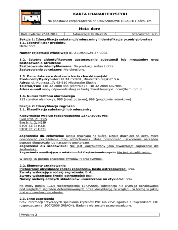 KARTA CHARAKTERYSTYKI Na podstawie rozporządzenia nr 1907/2006/WE (REACH) z późn. zm. Metal dore Data wydania: 27.04.2012 Aktualizacja: 09.06.2015 Strona/stron: 1/11 Sekcja 1: Identyfikacja substancji/mieszaniny i identyfikacja przedsiębiorstwa 1.1. Identyfikator produktu Metal dore Numer rejestracji właściwej: 01-2119543724-37-0008. 1.2. Istotne zidentyfikowane zastosowania substancji zastosowania odradzane Zastosowania zidentyfikowane: Do produkcji srebra i złota. Zastosowania odradzane: Nie określono. lub mieszaniny oraz 1.3. Dane dotyczące dostawcy karty charakterystyki Producent/Dystrybutor: HUTA CYNKU „Miasteczko Śląskie” S.A. Adres: ul. Hutnicza 17; 42-610 Miasteczko Śląskie Telefon/Fax: +48 32 2888 444 (centrala) / +48 32 2888 687/885 Adres e-mail osoby odpowiedzialnej za kartę charakterystyki: [email protected] 1.4. Numer telefonu alarmowego 112 (telefon alarmowy), 998 (straż pożarna), 999 (pogotowie ratunkowe) Sekcja 2: Identyfikacja zagrożeń 2.1. Klasyfikacja substancji lub mieszaniny Klasyfikacja według rozporządzenia 1272/2008/WE: Skin Irrit. 2; H315 Eye Irrit. 2; H319 STOT SE 3; H335 STOT RE 2; H373 Zagrożenia dla człowieka: Działa drażniąco na skórę. Działa drażniąco na oczy. Może powodować podrażnienie dróg oddechowych. Może powodować uszkodzenie narządów poprzez długotrwałe lub narażenie powtarzane. Zagrożenia dla środowiska: Nie jest klasyfikowany jako stwarzający zagrożenie dla środowiska. Zagrożenia wynikające z właściwości fizykochemicznych: Nie jest klasyfikowany. W sekcji 16 podano znaczenie zwrotów H oraz symboli. 2.2. Elementy oznakowania Piktogramy określające rodzaj zagrożenia, hasło ostrzegawcze: Brak. Zwroty wskazujące rodzaj zagrożenia: Brak. Zwroty wskazujące środki ostrożności: Brak. Nazwy niebezpiecznych składników umieszczone na etykiecie: Brak. Na mocy punktu 1.3.4 rozporządzenia 1272/2008, substancja nie wymaga oznakowania pod względem zagrożeń determinowanych przez klasyfikację ze względu na formę w jakiej jest wprowadzana do obrotu. 2.3. Inne zagrożenia Brak informacji dotyczących spełniania kryteriów PBT lub vPvB zgodnie z załącznikiem XIII rozporządzenia 1907/2006 (REACH). Badania nie zostały przeprowadzone. Wydanie 2 KARTA CHARAKTERYSTYKI Na podstawie rozporządzenia nr 1907/2006/WE (REACH) z późn. zm. Metal dore Data wydania: 27.04.2012 Aktualizacja: 09.06.2015 Strona/stron: 2/11 Sekcja 3: Skład/informacja o składnikach 3.1. Substancje Nazwa substancji niebezpiecznej: Zakres stężeń [%]: Numer CAS: Numer WE: Numer indeksowy: Klasyfikacja 1272/2008/WE: Srebro* 98,5 7440-22-4 231-131-3 Eye Irrit. 2; H319 STOT SE 3; H335 Skin Irrit. 2; H315 STOT RE 2; H373 Nazwa substancji niebezpiecznej: Zakres stężeń [%]: Numer CAS: Numer WE: Numer indeksowy: Klasyfikacja 1272/2008/WE: Miedź 1-3 7440-50-8 231-159-6 - Zawartość innych zanieczyszczeń nie przekracza ogółem 1%. W sekcji 16 podano znaczenie zwrotów H oraz symboli. *Substancja nieklasyfikowana w Załączniku VI, Tabeli 3.1 rozporządzenia 1272/2008. Klasyfikacja producenta. 3.2. Mieszaniny Nie dotyczy. Sekcja 4: Środki pierwszej pomocy 4.1. Opis środków pierwszej pomocy W temperaturze pokojowej, metal dore w postaci metalicznej nie stwarza bezpośredniego zagrożenia dla zdrowia pracowników. Kontakt z produktem w postaci ciekłej powoduje poważne oparzenia termiczne. Postępowanie jak w przypadku poparzeń termicznych. Opisane poniżej zalecenia dotyczą pracy w warunkach narażenia na pary, dymy i pyły wytwarzające się podczas obróbki mechanicznej i termicznej metalu dore. Narażenie drogą oddechową: Przenieść na świeże powietrze i zapewnić warunki do odpoczynku. W przypadku wystąpienia niepokojących objawów zasięgnąć porady lekarskiej. Kontakt ze skórą: Natychmiast zdjąć całą zanieczyszczoną odzież i buty. Zanieczyszczone miejsce przemywać obficie wodą z mydłem a następnie starannie spłukać wodą. W przypadku wystąpienia niepokojących objawów (np. cech podrażnienia skóry itp.) zasięgnąć porady lekarskiej. Zanieczyszczoną odzież wyprać przed ponownym użyciem. Kontakt z oczami: Usunąć szkła kontaktowe. Przemywać zanieczyszczone oczy wodą przynajmniej przez 15 minut, przy wywiniętych powiekach. Co pewien czas nakładać powiekę górną na dolną. W przypadku wystąpienia niepokojących objawów zasięgnąć porady lekarskiej. Po spożyciu: Przepłukać usta wodą. Osobie przytomnej podać dużą ilość wody do wypicia. Nie wywoływać wymiotów bez wyraźnych zaleceń lekarza. Zasięgnąć porady lekarza pokazać niniejszą kartę charakterystyki. Uwzględniając postać produktu, ciało stałe, narażenie drogą pokarmową jest mało prawdopodobne. Pobranie srebra drogą pokarmową Wydanie 2 KARTA CHARAKTERYSTYKI Na podstawie rozporządzenia nr 1907/2006/WE (REACH) z późn. zm. Metal dore Data wydania: 27.04.2012 Aktualizacja: 09.06.2015 Strona/stron: 3/11 może być następstwem nieprzestrzegania podstawowych zasad higieny podczas pracy z tym produktem, np. nie mycia rąk po pracy z produktem; narażenia na duże stężenie pyłów i dymów metalu dore. 4.2. Najważniejsze ostre i opóźnione objawy oraz skutki narażenia Narażenie drogą oddechową: Może powodować podrażnienie dróg oddechowych. W następstwie narażenia na dymy srebra może powodować tzw. gorączkę odlewników z metalicznym smakiem w ustach, objawami grypopodobnymi - gorączką, dreszczami, kaszlem, osłabieniem, bólami mięśniowymi, zwiększoną liczbą białych ciałek krwi. Kontakt ze skórą: Może powodować podrażnienie i przebarwienie skóry. Kontakt z oczami: Może powodować podrażnienie w warunkach narażenia na dymy, pyły i opary. Po spożyciu: Może powodować podrażnienie przewodu pokarmowego. Może ulegać kumulacji w organizmie. Związki srebra mogą powodować bóle brzucha, sztywność, drgawki i szok. W następstwie przewlekłego narażenia na sole sr