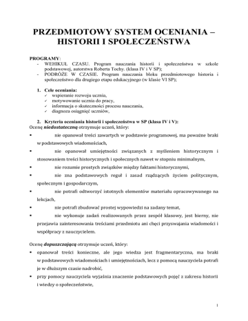 PRZEDMIOTOWY SYSTEM OCENIANIA – HISTORII I SPOŁECZEŃSTWA PROGRAMY: - WEHIKUŁ CZASU. Program nauczania historii i społeczeństwa w szkole podstawowej, autorstwa Roberta Tochy. (klasa IV i V SP); - PODRÓŻE W CZASIE. Program nauczania bloku przedmiotowego historia i społeczeństwo dla drugiego etapu edukacyjnego (w klasie VI SP); 1. Cele oceniania: wspieranie rozwoju ucznia, motywowanie ucznia do pracy, informacja o skuteczności procesu nauczania, diagnoza osiągnięć uczniów, 2. Kryteria oceniania historii i społeczeństwa w SP (klasa IV i V): Ocenę niedostateczną otrzymuje uczeń, który: nie opanował treści zawartych w podstawie programowej, ma poważne braki w podstawowych wiadomościach, nie opanował umiejętności związanych z myśleniem historycznym i stosowaniem treści historycznych i społecznych nawet w stopniu minimalnym, nie rozumie prostych związków między faktami historycznymi, nie zna podstawowych reguł i zasad rządzących życiem politycznym, społecznym i gospodarczym, nie potrafi odtworzyć istotnych elementów materiału opracowywanego na lekcjach, nie potrafi zbudować prostej wypowiedzi na zadany temat, nie wykonuje zadań realizowanych przez zespół klasowy, jest bierny, nie przejawia zainteresowania treściami przedmiotu ani chęci przyswajania wiadomości i współpracy z nauczycielem. Ocenę dopuszczającą otrzymuje uczeń, który: opanował treści konieczne, ale jego wiedza jest fragmentaryczna, ma braki w podstawowych wiadomościach i umiejętnościach, lecz z pomocą nauczyciela potrafi je w dłuższym czasie nadrobić, przy pomocy nauczyciela wyjaśnia znaczenie podstawowych pojęć z zakresu historii i wiedzy o społeczeństwie, 1 zna główne postacie historyczne, zna prosty podział źródeł historycznych, rozumie prosty tekst źródłowy, ma ogólną orientację w posługiwaniu się osią czasu, przyporządkowuje datę wiekowi, zna daty roczne przełomowych wydarzeń, odczytuje podstawowe dane kartograficzne, wskazuje na mapie wybrane państwa i regiony, umie nazwać poznane epoki oraz przedstawić ich ramy chronologiczne, okazuje szacunek symbolom państwowym, zachowuje się godnie w czasie obchodów świąt i uroczystości państwowych, zna podstawowe dokumenty prawne regulujące życie społeczeństwa i państwa, dostrzega i rozpoznaje podstawowe reguły i procedury demokratyczne w państwie, zna rodzaje potrzeb człowieka, wymienia poznane grupy społeczne, posługuje się podręcznikiem, wykonuje typowe zadania teoretyczne i praktyczne o niewielkim stopniu trudności, ma trudności ze zbudowaniem poprawnej wypowiedzi, zachowuje na lekcji bierną postawę, ale wykazuje chęć współpracy i, odpowiednio motywowany, jest w stanie przy pomocy nauczyciela wykonać proste polecenia. Ocenę dostateczną otrzymuje uczeń, który: posiada kompetencje określone na ocenę dopuszczającą, opanował minimum wiadomości i umiejętności przewidzianych w podstawie programowej, z niewielkimi trudnościami posługuje się terminologią poznaną na lekcjach, dostrzega podstawowe związki przyczynowo-skutkowe pomiędzy faktami historycznymi, wyciąga proste wnioski z otrzymanych informacji, dostrzega rolę głównych postaci historycznych w ważnych wydarzeniach, rozróżnia podstawowe typy źródeł informacji historycznej, pod kierunkiem nauczyciela gromadzi, porządkuje i wykorzystuje informacje z różnych źródeł, podejmuje próby analizy i interpretacji tekstu źródłowego, 2 z niewielką pomocą nauczyciela umiejscawia wydarzenia w czasie (taśma chronologiczna), szereguje poznane wydarzenia w czasie, z niewielką pomocą nauczyciela umiejscawia wydarzenia w przestrzeni (mapa), podaje podstawowe cechy odróżniające epoki: starożytną, średniowieczną i nowożytną, wskazuje główne elementy tradycji starożytnej w życiu współczesnym, rozpoznaje własne prawa i obowiązki w życiu rodzinnym, dokonuje prostej charakterystyki regionu, w którym mieszka, podaje podstawowe informacje na temat państwa i sposobu jego funkcjonowania, przedstawia najważniejsze informacje dotyczące życia politycznego i społecznego w Polsce, zna i potrafi zastosować podstawowe procedury demokratyczne w klasie i szkole, wymienia poznane prawa człowieka, obywatela i dziecka, samodzielnie pracuje z podręcznikiem, wykonuje proste zadania pisemne, poprawia popełnione błędy merytoryczne, formułuje krótkie i proste wypowiedzi na zadany temat, formułuje ogólne opinie, wykazuje niewielką aktywność na lekcjach, ale współpracuje z grupą podczas realizacji zadań, wykazuje postawę tolerancji oraz poszanowania dla cudzych poglądów, posługuje się mediami elektronicznymi. Ocenę dobrą otrzymuje uczeń, który: posiada kompetencje określone na oceny dopuszczającą i dostateczną, opanował w niepełnym stopniu wiadomości i umiejętności ujęte w podstawie programowej, prawidłowo posługuje się terminologią historyczną, porównuje wydarzenia z przeszłości, dostrzega złożoność związków przyczynowo-skutkowych między wydarzeniami, samodzielnie wyciąga ogólne wnioski, charakteryzuje dokonania ważnych postaci historycznych, 3 samodzielnie gromadzi, porządkuje i wykorzystuje informacje z różnych źródeł, analizuje i interpretuje teksty źródłowe z niewielką pomocą nauczyciela, wykonuje wszystkie rodzaje ćwiczeń związane z orientacją w czasie, dobrze posługuje się mapą historyczną i planem, poprawnie odczytuje zawarte w nich informacje, umie krótko scharakteryzować poznane epoki, wskazuje elementy tradycji wszystkich epok w życiu współczesnym, zna różne systemy organizacji społeczeństw i państw, charakteryzuje główne problemy życia politycznego i społecznego małej ojczyzny i państwa, wie, co należy robić, gdy jego prawa jako człowieka, dziecka lub ucznia są łamane, rozwiązuje typowe problemy z wykorzystaniem informacji z różnych źródeł, inspirowany przez nauczyciela potrafi rozwiąza