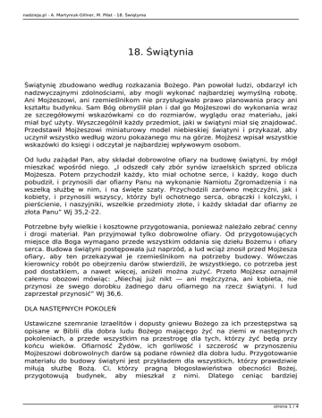 nadzieja.pl - A. Martyniuk-Gillner, M. Piłat - 18. Świątynia 18. Świątynia Świątynię zbudowano według rozkazania Bożego. Pan powołał ludzi, obdarzył ich nadzwyczajnymi zdolnościami, aby mogli wykonać najbardziej wymyślną robotę. Ani Mojżeszowi, ani rzemieślnikom nie przysługiwało prawo planowania pracy ani kształtu budynku. Sam Bóg obmyślił plan i dał go Mojżeszowi do wykonania wraz ze szczegółowymi wskazówkami co do rozmiarów, wyglądu oraz materiału, jaki miał być użyty. Wyszczególnił każdy przedmiot, jaki w świątyni miał się znajdować. Przedstawił Mojżeszowi miniaturowy model niebieskiej świątyni i przykazał, aby uczynił wszystko według wzoru pokazanego mu na górze. Mojżesz wpisał wszystkie wskazówki do księgi i odczytał je najbardziej wpływowym osobom. Od ludu zażądał Pan, aby składał dobrowolne ofiary na budowę świątyni, by mógł mieszkać wpośród niego. „I odszedł cały zbór synów izraelskich sprzed oblicza Mojżesza. Potem przychodził każdy, kto miał ochotne serce, i każdy, kogo duch pobudził, i przynosili dar ofiarny Panu na wykonanie Namiotu Zgromadzenia i na wszelką służbę w nim, i na święte szaty. Przychodzili zarówno mężczyźni, jak i kobiety, i przynosili wszyscy, którzy byli ochotnego serca, obrączki i kolczyki, i pierścienie, i naszyjniki, wszelkie przedmioty złote, i każdy składał dar ofiarny ze złota Panu” Wj 35,2-22. Potrzebne były wielkie i kosztowne przygotowania, ponieważ należało zebrać cenny i drogi materiał. Pan przyjmował tylko dobrowolne ofiary. Od przygotowujących miejsce dla Boga wymagano przede wszystkim oddania się dziełu Bożemu i ofiary serca. Budowa świątyni postępowała już naprzód, a lud wciąż znosił przed Mojżesza ofiary, aby ten przekazywał je rzemieślnikom na potrzeby budowy. Wówczas kierownicy robót po obejrzeniu darów stwierdzili, że wszystkiego, co potrzeba jest pod dostatkiem, a nawet więcej, aniżeli można zużyć. Przeto Mojżesz oznajmił całemu obozowi mówiąc: „Niechaj już nikt — ani mężczyzna, ani kobieta, nie przynosi ze swego dorobku żadnego daru ofiarnego na rzecz świątyni. I lud zaprzestał przynosić” Wj 36,6. DLA NASTĘPNYCH POKOLEŃ Ustawiczne szemranie Izraelitów i dopusty gniewu Bożego za ich przestępstwa są opisane w Biblii dla dobra ludu Bożego mającego żyć na ziemi w następnych pokoleniach, a przede wszystkim na przestrogę dla tych, którzy żyć będą przy końcu wieków. Ofiarność Żydów, ich gorliwość i szczerość w przynoszeniu Mojżeszowi dobrowolnych darów są podane również dla dobra ludu. Przygotowanie materiału do budowy świątyni jest przykładem dla wszystkich, którzy prawdziwie miłują służbę Bożą. Ci, którzy pragną błogosławieństwa obecności Bożej, przygotowują budynek, aby mieszkał z nimi. Dlatego ceniąc bardziej strona 1 / 4 nadzieja.pl - A. Martyniuk-Gillner, M. Piłat - 18. Świątynia błogosławieństwo nieba niż ziemskie korzyści, większą powinni okazać gorliwość i większe zainteresowanie dziełem świętym. Powinni rozumieć, że dom przygotowany na spotkanie się Boga ze Swoim ludem należy urządzić starannie, aby był wygodny, schludny i porządny, gdyż ma być poświęcony Najwyższemu i Jemu ofiarowany. On ma być zaproszony do przebywania w tym domu, i poświęcenia go Swoją świętą obecnością. Chętnie powinno się ofiarować wszystko, co potrzebne jest do wykonania takiej pracy, aby pracujący mogli powiedzieć: „Nie przynoście więcej darów”. WEDŁUG WZORU Gdy przybytek Pański został ukończony, Mojżesz skontrolował robotę i porównał ją ze wzorem i wskazówkami otrzymanymi od Boga. Stwierdził, że każdy szczegół odpowiada wzorowi. Błogosławił, więc ludowi. Bóg dał Mojżeszowi wzór Skrzyni Przymierza z dokładnymi wskazówkami, jak należy ją wykonać. W skrzyni tej miały się znaleźć tablice kamienne, na których Bóg Swoim własnym palcem wypisał dziesięć przykazań. Była ona powleczona z zewnątrz i wewnątrz szczerym złotem, dookoła wierzch ozdabiał wieniec złotych koron. Wieko tej świętej skrzyni stanowiło ubłagalnię i zrobione było ze szczerego złota. Na obydwu końcach ubłagalni przymocowane były postacie cherubów wykonane również ze szczerego złota. Zwróceni twarzami ku sobie spoglądali w dół na ubłagalnię, co miało wskazywać na aniołów niebieskich spoglądających z zaciekawieniem i czcią na prawo Boże złożone w świątyni w arce. Każdy anioł miał jedno skrzydło uniesione w górę, drugim nakrywał swoją postać. Skrzynia Przymierza w ziemskiej świątyni była podobieństwem prawdziwej skrzyni przymierza znajdującej się w niebie. Tam z obydwu stron skrzyni stoją żywi aniołowie, każdy jednym podniesionym skrzydłem zasłania ubłagalnię, drugim — swoją postać na znak czci i pokory. W Skrzyni umieścił Mojżesz tablice kamienne. Nazywały się one tablicami świadectwa, skrzynia zwała się Skrzynią Świadectwa, ponieważ zawierała świadectwo Boże zawarte w dziesięciu przykazaniach. DWA POMIESZCZENIA Świątynia składała się z dwóch pomieszczeń oddzielonych od przedsionka zasłoną. Wszystek sprzęt świątyni wykonany był ze szczerego złota lub powleczony złotem. Na niezwykle pięknej różnobarwnej zasłonie wyhaftowane były srebrnymi i złotymi nićmi postacie cherubinów, mające wyobrażać zastępy anielskie służące w niebieskiej świątyni. Symbolizowali oni jednocześnie aniołów usługujących świętym na ziemi. Za drugą zasłoną dzielącą pomieszczenie święte od najświętszego umieszczona była skrzynia świadectwa. Zasłona ta, również pięknie ozdobiona, nie sięgając do sufitu, zasłaniała świętą skrzynię. Chwałę Bożą, która znajdowała się nad ubłagalnią, można było widzieć w obu pomieszczeniach, chociaż w pierwszym znacznie mniej. Na wprost przed skrzynią stał z