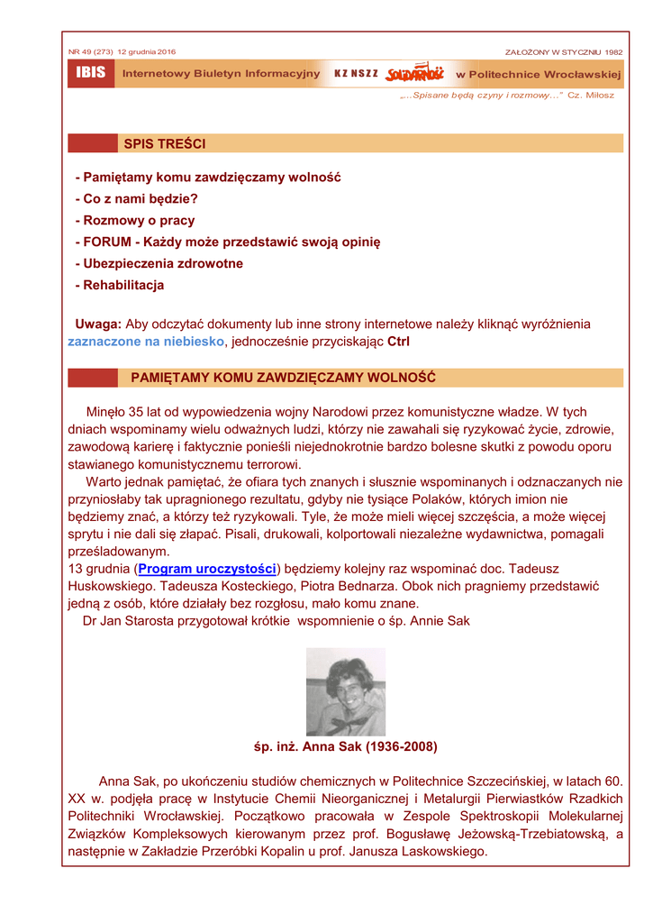 ZAŁOŻONY W STYCZNIU 1982 NR 49 (273) 12 grudnia 2016 IBIS Internetowy Biuletyn Informacyjny K Z NSZ Z w Politechnice Wrocławskiej „...Spisane będą czyny i rozmowy…” Cz. Miłosz SPIS TREŚCI - Pamiętamy komu zawdzięczamy wolność - Co z nami będzie? - Rozmowy o pracy - FORUM - Każdy może przedstawić swoją opinię - Ubezpieczenia zdrowotne - Rehabilitacja Uwaga: Aby odczytać dokumenty lub inne strony internetowe należy kliknąć wyróżnienia zaznaczone na niebiesko, jednocześnie przyciskając Ctrl PAMIĘTAMY KOMU ZAWDZIĘCZAMY WOLNOŚĆ Minęło 35 lat od wypowiedzenia wojny Narodowi przez komunistyczne władze. W tych dniach wspominamy wielu odważnych ludzi, którzy nie zawahali się ryzykować życie, zdrowie, zawodową karierę i faktycznie ponieśli niejednokrotnie bardzo bolesne skutki z powodu oporu stawianego komunistycznemu terrorowi. Warto jednak pamiętać, że ofiara tych znanych i słusznie wspominanych i odznaczanych nie przyniosłaby tak upragnionego rezultatu, gdyby nie tysiące Polaków, których imion nie będziemy znać, a którzy też ryzykowali. Tyle, że może mieli więcej szczęścia, a może więcej sprytu i nie dali się złapać. Pisali, drukowali, kolportowali niezależne wydawnictwa, pomagali prześladowanym. 13 grudnia (Program uroczystości) będziemy kolejny raz wspominać doc. Tadeusz Huskowskiego. Tadeusza Kosteckiego, Piotra Bednarza. Obok nich pragniemy przedstawić jedną z osób, które działały bez rozgłosu, mało komu znane. Dr Jan Starosta przygotował krótkie wspomnienie o śp. Annie Sak śp. inż. Anna Sak (1936-2008) Anna Sak, po ukończeniu studiów chemicznych w Politechnice Szczecińskiej, w latach 60. XX w. podjęła pracę w Instytucie Chemii Nieorganicznej i Metalurgii Pierwiastków Rzadkich Politechniki Wrocławskiej. Początkowo pracowała w Zespole Spektroskopii Molekularnej Związków Kompleksowych kierowanym przez prof. Bogusławę Jeżowską-Trzebiatowską, a następnie w Zakładzie Przeróbki Kopalin u prof. Janusza Laskowskiego. Od samego początku powstania uczelnianych struktur NSZZ „Solidarność” stała się członkiem nowego związku zawodowego angażując się w sprawę poprawy warunków BHP na Wydziale Chemicznym, a w szczególności dotyczyło to pracowników technicznych. W maju 1981 roku, po uzyskaniu bezpłatnego urlopu w Politechnice Wrocławskiej, pojechała na zaproszenie do swojej Bratanicy do Paryża. W czasie pobytu we Francji zastał ją stan wojenny ogłoszony w Polsce. Anna Sak nawiązała kontakt z Paryskim Komitetem „Solidarności”, gdzie oprócz prac dorywczych gwarantujących Jej utrzymanie – włączyła się w wielokierunkową działalność charytatywną na rzecz Polaków w kraju. Rodzina sławnego rodu Platerów od lat osiadła na Emigracji udostępniła swój dom na ul. Poitiers w centrum Paryża jako punkt przyjmowania darów, które z wielką ofiarnością przynosili Francuzi, jako jedną z form pomocy dla Polaków. Dary te sortowano, pakowano i przesyłano specjalnym transportem do kraju. Uczestniczyło w tym z wielkim poświęceniem wielu Polaków, którzy aktualnie przebywali w Paryżu. Anna Sak współpracowała także z Kościołem Polskim pw. Wniebowzięcia NMP przy ul. Saint-Honnore, gdzie również zgłaszali się Rodacy o pomoc. Organizowała i przesyłała do kraju paczki z żywnością, odzieżą, lekami i odżywkami dla chorych dzieci w szczególności dla potrzebujących we Wrocławiu. Wykazała się inicjatywą zarabiania pieniędzy na cele charytatywne organizując kiermasze pisanek i palm wielkanocnych sprowadzanych specjalnie z kraju, a także wykonywanych osobiście, sprzedawanych przy kościele polskim, gdzie gromadziła się miejscowa Polonia i Emigranci z Polski. Anna Sak współpracowała w Paryżu z Mirosławem Chojeckim – wydawcą i działaczem społeczno-związkowym, a w kraju pozostawała w kontakcie z niezwykle szlachetną osobą Mariolą Korowiec (zmarłą w br.) Uczestniczyła w spotkaniach organizowanych przez Centre du Dialogue o.o. Pallotynów, gdzie wybitni przedstawiciele inteligencji z kraju i emigracji wygłaszali prelekcje i dyskutowali na bieżące tematy interesujące Polaków. Od lat 90. XX w. Anna Sak dzieliła swój czas na okresy paryski i wrocławski. Wówczas wśród Jej bliskich znajomych narodziła się myśl, aby nadchodzący przełom wieków XX/XXI uczcić wydaniem tomiku pt. „Pater noster” dla uczczenia roku 2000 ogłoszonego przez Jana Pawła II rokiem Boga Ojca. W skład zespołu redakcyjnego tego przedsięwzięcia wchodzili: Mirosław Chojecki, Maria Maciejewska – architekt i projektant szaty graficznej, Anna Sak i Jan Starosta. Dzięki staraniom i poświęceniu Anny Sak zarówno w Paryżu jak i w Polsce udało się w roku 2000 wydać nakładem własnym zespołu redakcyjnego książeczkę zawierającą modlitwę pańską w 91 językach z przedmową wybitnego biblisty franciszkanina o. Hugolina Langkamera profesora KUL-u. Książeczka została dedykowana papieżowi Janowi Pawłowi II i ukazała się nakładem Dolnośląskiego Wydawnictwa Edukacyjnego. Anna Sak zmarła – po krótkiej i ciężkiej chorobie – 24 marca 2008 roku w Paryżu, a Jej prochy złożone zostały w grobie rodzinnym na cmentarzu centralnym w Szczecinie. Zachowajmy Ją we wdzięcznej pamięci. CO Z NAMI BĘDZIE? Jak powszechnie wiadomo Minister Gowin powierzył trzem zespołom, które wygrały konkurs, opracowanie założeń do nowej ustawy o szkolnictwie wyższym. Krajowa Sekcja Nauki NSZZ Solidarność przysłała Projekt założeń do tej ustawy autorstwa zespołu prof. Marka Kwieka. Projekt ten dostępny jest na naszej stronie (Projekt…). Zachęcamy do lektury i podzielenia się uwagami dotyczącymi tego projektu z Komisją Zakładową. Wszystkie uwagi prześlemy do Krajowej Sekcji Nauki. Opinie i uwagi prosimy wysyłać na adres [email protected] z dopiskiem Ustawa-założenia. Osoby, które chciałyby podzielić się swoją opi