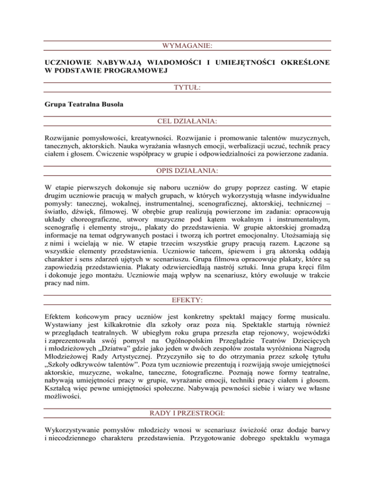 WYMAGANIE: UCZNIOWIE NABYWAJĄ WIADOMOŚCI I UMIEJĘTNOŚCI OKREŚLONE W PODSTAWIE PROGRAMOWEJ TYTUŁ: Grupa Teatralna Busola CEL DZIAŁANIA: Rozwijanie pomysłowości, kreatywności. Rozwijanie i promowanie talentów muzycznych, tanecznych, aktorskich. Nauka wyrażania własnych emocji, werbalizacji uczuć, technik pracy ciałem i głosem. Ćwiczenie współpracy w grupie i odpowiedzialności za powierzone zadania. OPIS DZIAŁANIA: W etapie pierwszych dokonuje się naboru uczniów do grupy poprzez casting. W etapie drugim uczniowie pracują w małych grupach, w których wykorzystują własne indywidualne pomysły: tanecznej, wokalnej, instrumentalnej, scenograficznej, aktorskiej, technicznej – światło, dźwięk, filmowej. W obrębie grup realizują powierzone im zadania: opracowują układy choreograficzne, utwory muzyczne pod kątem wokalnym i instrumentalnym, scenografię i elementy stroju,, plakaty do przedstawienia. W grupie aktorskiej gromadzą informacje na temat odgrywanych postaci i tworzą ich portret emocjonalny. Utożsamiają się z nimi i wcielają w nie. W etapie trzecim wszystkie grupy pracują razem. Łączone są wszystkie elementy przedstawienia. Uczniowie tańcem, śpiewem i grą aktorską oddają charakter i sens zdarzeń ujętych w scenariuszu. Grupa filmowa opracowuje plakaty, które są zapowiedzią przedstawienia. Plakaty odzwierciedlają nastrój sztuki. Inna grupa kręci film i dokonuje jego montażu. Uczniowie mają wpływ na scenariusz, który ewoluuje w trakcie pracy nad nim. EFEKTY: Efektem końcowym pracy uczniów jest konkretny spektakl mający formę musicalu. Wystawiany jest kilkakrotnie dla szkoły oraz poza nią. Spektakle startują również w przeglądach teatralnych. W ubiegłym roku grupa przeszła etap rejonowy, wojewódzki i zaprezentowała swój pomysł na Ogólnopolskim Przeglądzie Teatrów Dziecięcych i młodzieżowych „Dziatwa” gdzie jako jeden w dwóch zespołów została wyróżniona Nagrodą Młodzieżowej Rady Artystycznej. Przyczyniło się to do otrzymania przez szkołę tytułu „Szkoły odkrywców talentów”. Poza tym uczniowie prezentują i rozwijają swoje umiejętności aktorskie, muzyczne, wokalne, taneczne, fotograficzne. Poznają nowe formy teatralne, nabywają umiejętności pracy w grupie, wyrażanie emocji, techniki pracy ciałem i głosem. Kształcą więc pewne umiejętności społeczne. Nabywają pewności siebie i wiary we własne możliwości. RADY I PRZESTROGI: Wykorzystywanie pomysłów młodzieży wnosi w scenariusz świeżość oraz dodaje barwy i niecodziennego charakteru przedstawienia. Przygotowanie dobrego spektaklu wymaga ścisłej współpracy z innymi nauczycielami i uczniami. Najlepsze efekty daje swobodna wymiana myśli i pomysłów uczniów i nauczycieli. Im więcej pomysłów uczniowskich tym większe ich zaangażowanie. Przedstawienie staje się ich projektem. Podczas tworzenia postaci warto pytać innych uczniów o radę i opinię. Dobry efekt wymaga poświęcenia dużej ilości czasu. Praca nad jednym projektem to codzienne próby przez okres nawet od 3 miesięcy do pół roku. SPOSOBY UPOWSZECHNIENIA: Prezentacja spektakli przed społecznością szkoły oraz miasta, rodzicami. Prezentacja spektakli w przeglądach teatralnych: regionalnych, wojewódzkich, ogólnopolskich. Publikacje w lokalnej prasie („Nowy Łowiczanin”). Publikacja w Internecie (oficjalna strona szkoły: www.gim2.lowicz.pl, strona grupy teatralnej: www.busola.c0.pl, strona Ogólnopolskiego Przeglądu Teatrów Dziecięcych i Młodzieżowych „Dziatwa”). Prezentacja wyników w Regionalnej Telewizji „Łódź”.