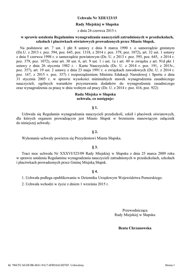 Uchwała Nr XIII/123/15 Rady Miejskiej w Słupsku z dnia 24 czerwca 2015 r. w sprawie ustalenia Regulaminu wynagradzania nauczycieli zatrudnionych w przedszkolach, szkołach i placówkach oświatowych prowadzonych przez Miasto Słupsk. Na podstawie art. 7 ust. 1 pkt 8 ustawy z dnia 8 marca 1990 r. o samorządzie gminnym (Dz.U. z 2013 r. poz. 594, poz. 645, poz. 1318, z 2014 r. poz. 379, poz. 1072), art. 32 ust. 1 ustawy z dnia 5 czerwca 1998 r. o samorządzie powiatowym (Dz. U. z 2013 r. poz. 595, poz. 645, z 2014 r. poz. 379, poz. 1072), oraz art. 30 ust. 6, art. 9 ust. 1 i ust. 1a i art. 49 w związku z art. 91d pkt 1 ustawy z dnia 26 stycznia 1982 r. - Karta Nauczyciela (Dz. U. z 2014 r. poz. 191, z 2015r., poz. 357), art. 19 ust. 2 ustawy z dnia 23 maja 1991 r. o związkach zawodowych (Dz. U. z 2014 r. poz. 167, z 2015 r. poz. 357) i rozporządzeniem Ministra Edukacji Narodowej i Sportu z dnia 31 stycznia 2005 r. w sprawie wysokości minimalnych stawek wynagrodzenia zasadniczego nauczycieli, ogólnych warunków przyznawania dodatków do wynagrodzenia zasadniczego oraz wynagrodzenia za pracę w dniu wolnym od pracy (Dz. U. z 2014 r. poz. 416, poz. 922) Rada Miejska w Słupsku uchwala, co następuje: § 1. Uchwala się Regulamin wynagradzania nauczycieli przedszkoli, szkół i placówek oświatowych, dla których organem prowadzącym jest Miasto Słupsk w brzmieniu stanowiącym załącznik do niniejszej uchwały. § 2. Wykonanie uchwały powierza się Prezydentowi Miasta Słupska. § 3. Traci moc uchwała Nr XXXVI/525/09 Rady Miejskiej w Słupsku z dnia 25 marca 2009 roku w sprawie ustalenia Regulaminu wynagradzania nauczycieli zatrudnionych w przedszkolach, szkołach i placówkach prowadzonych przez Gminę Miejską Słupsk. § 4. 1. Uchwała podlega opublikowaniu w Dzienniku Urzędowym Województwa Pomorskiego. 2. Uchwała wchodzi w życie z dniem 1 września 2015 r. Przewodnicząca Rady Miejskiej w Słupsku Beata Chrzanowska Id: 786CFCA0-DC0B-4E61-9A17-6FB54AC6D7EF. Uchwalony Strona 1 Załącznik do Uchwały Nr XIII/123/15 Rady Miejskiej w Słupsku z dnia 24 czerwca 2015 r. REGULAMIN WYNAGRADZANIA NAUCZYCIELI ZATRUDNIONYCH W PRZEDSZKOLACH, SZKOŁACH I PLACÓWKACH OŚWIATOWYCH PROWADZONYCH PRZEZ MIASTO SŁUPSK I. POSTANOWIENIA WSTĘPNE § 1. Ilekroć w regulaminie jest mowa bez bliższego określenia o: 1) Karcie Nauczyciela – należy przez to rozumieć ustawę z dnia 26 stycznia 1982 r. - Karta Nauczyciela (Dz. U. z 2014 r. poz. 191, z 2015 r. poz. 357); 2) rozporządzeniu – należy przez to rozumieć rozporządzenie Ministra Edukacji Narodowej i Sportu z dnia 31 stycznia 2005 r. w sprawie wysokości minimalnych stawek wynagrodzenia zasadniczego nauczycieli, ogólnych warunków przyznawania dodatków do wynagrodzenia zasadniczego oraz wynagrodzenia za pracę w dniu wolnym od pracy (Dz. U. z 2014 r. poz. 416, z 2014 r. poz. 922); 3) prezydencie - należy przez to rozumieć Prezydenta Miasta Słupska; 4) radzie - należy przez to rozumieć Radę Miejską w Słupsku; 5) szkole – należy przez to rozumieć przedszkole, szkołę lub placówkę oświatową, albo zespół szkół i placówek, dla których organem prowadzącym jest Miasto Słupsk; 6) dyrektorze lub wicedyrektorze – należy przez to rozumieć dyrektora lub wicedyrektora jednostki, o której mowa w pkt 5; 7) klasie – należy przez to rozumieć oddział lub grupę w przedszkolu, szkole, internacie lub placówce opiekuńczo-wychowawczej; 8) uczniu – należy przez to rozumieć także wychowanka, słuchacza. § 2. 1. Do ustalenia średniego wynagrodzenia na poszczególnych stopniach awansu zawodowego przyjmuje się liczbę nauczycieli zatrudnionych w pełnym wymiarze czasu pracy oraz niepełnozatrudnionych w przeliczeniu na pełne etaty. 2. Wynagrodzenie nauczycieli zatrudnionych w niepełnym wymiarze czasu pracy oblicza się proporcjonalnie do godzin ich pracy według właściwego zaszeregowania. II. WYNAGRODZENIE ZASADNICZE § 3. 1. Stawki wynagrodzenia zasadniczego nauczycieli ustala się w zależności od stopnia awansu zawodowego, posiadanych kwalifikacji oraz wymiaru zajęć obowiązkowych, na poziomie minimalnych stawek zapisanych w § l rozporządzenia. 2. Minimalne stawki wynagrodzenia zasadniczego ulegają zmianie w przypadku zmiany przepisów ustawy i aktów wykonawczych i nie wymagają zmiany niniejszego regulaminu. Id: 786CFCA0-DC0B-4E61-9A17-6FB54AC6D7EF. Uchwalony Strona 1 III. DODATEK ZA WYSŁUGĘ LAT § 4. 1. Nauczycielowi przysługuje dodatek za wysługę lat w wysokości określonej w art. 33 ust. 1 Karty Nauczyciela. 2. Okresy zatrudnienia oraz inne okresy uprawniające do dodatku określa § 7 rozporządzenia. 3. Dodatek przysługuje: 1) począwszy od pierwszego dnia miesiąca kalendarzowego następującego po miesiącu, w którym nauczyciel nabył prawo do dodatku lub do wyższej stawki dodatku, jeżeli nabycie prawa nastąpiło w ciągu miesiąca; 2) za dany miesiąc, jeżeli nabycie prawa do dodatku lub wyższej jego stawki nastąpiło od pierwszego dnia miesiąca. 4. Dodatek przysługuje za dni, za które nauczyciel otrzymuje wynagrodzenie oraz za dni nieobecności w pracy z powodu niezdolności do pracy wskutek choroby lub konieczności osobistego sprawowania opieki nad dzieckiem lub chorym członkiem rodziny, za które nauczyciel otrzymuje z tego tytułu zasiłek z ubezpieczenia społecznego. IV. DODATEK MOTYWACYJNY § 5. 1. Przy ustalaniu wysokości dodatku motywacyjnego dla nauczyciela bierze się pod uwagę: 1) osiągnięcia w realizowanym procesie dydaktycznym: a) uzyskiwanie przez uczniów, z uwzględnieniem ich możliwości oraz warunków pracy nauczyciela, osiągnięć dydaktycznych potwierdzanych wynikami klasyfikacji, efektami egzaminów i sprawdzianów albo sukcesami w konkursach, zawodach, olimpiadach (szkolnych, międzyszkolnych, wojewódzkich, ogólnopolskich), przeglądach i festiwalach, b) kierowanie rozwojem ucznia, c) podnoszenie umiejętności zawodowych poprzez studia podyp