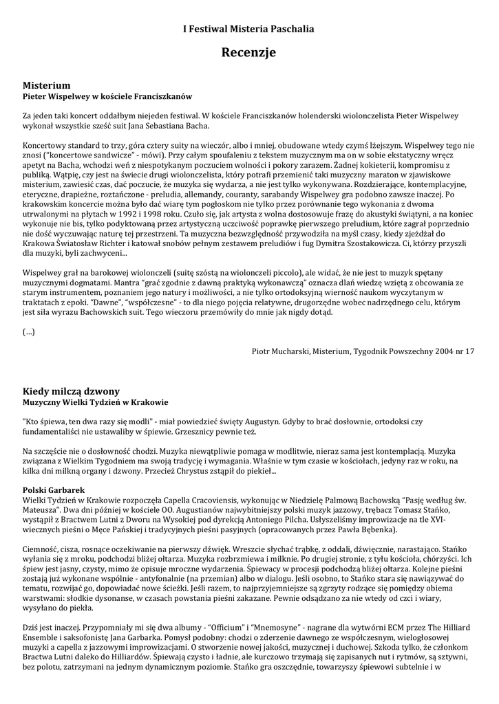 I Festiwal Misteria Paschalia Recenzje Misterium Pieter Wispelwey w kościele Franciszkanów Za jeden taki koncert oddałbym niejeden festiwal. W kościele Franciszkanów holenderski wiolonczelista Pieter Wispelwey wykonał wszystkie sześć suit Jana Sebastiana Bacha. Koncertowy standard to trzy, góra cztery suity na wieczór, albo i mniej, obudowane wtedy czymś lżejszym. Wispelwey tego nie znosi (“koncertowe sandwicze” - mówi). Przy całym spoufaleniu z tekstem muzycznym ma on w sobie ekstatyczny wręcz apetyt na Bacha, wchodzi weń z niespotykanym poczuciem wolności i pokory zarazem. Żadnej kokieterii, kompromisu z publiką. Wątpię, czy jest na świecie drugi wiolonczelista, który potrafi przemienić taki muzyczny maraton w zjawiskowe misterium, zawiesić czas, dać poczucie, że muzyka się wydarza, a nie jest tylko wykonywana. Rozdzierające, kontemplacyjne, eteryczne, drapieżne, roztańczone - preludia, allemandy, couranty, sarabandy Wispelwey gra podobno zawsze inaczej. Po krakowskim koncercie można było dać wiarę tym pogłoskom nie tylko przez porównanie tego wykonania z dwoma utrwalonymi na płytach w 1992 i 1998 roku. Czuło się, jak artysta z wolna dostosowuje frazę do akustyki świątyni, a na koniec wykonuje nie bis, tylko podyktowaną przez artystyczną uczciwość poprawkę pierwszego preludium, które zagrał poprzednio nie dość wyczuwając naturę tej przestrzeni. Ta muzyczna bezwzględność przywodziła na myśl czasy, kiedy zjeżdżał do Krakowa Światosław Richter i katował snobów pełnym zestawem preludiów i fug Dymitra Szostakowicza. Ci, którzy przyszli dla muzyki, byli zachwyceni... Wispelwey grał na barokowej wiolonczeli (suitę szóstą na wiolonczeli piccolo), ale widać, że nie jest to muzyk spętany muzycznymi dogmatami. Mantra “grać zgodnie z dawną praktyką wykonawczą” oznacza dlań wiedzę wziętą z obcowania ze starym instrumentem, poznaniem jego natury i możliwości, a nie tylko ortodoksyjną wierność naukom wyczytanym w traktatach z epoki. “Dawne”, “współczesne” - to dla niego pojęcia relatywne, drugorzędne wobec nadrzędnego celu, którym jest siła wyrazu Bachowskich suit. Tego wieczoru przemówiły do mnie jak nigdy dotąd. (…) Piotr Mucharski, Misterium, Tygodnik Powszechny 2004 nr 17 Kiedy milczą dzwony Muzyczny Wielki Tydzień w Krakowie "Kto śpiewa, ten dwa razy się modli" - miał powiedzieć święty Augustyn. Gdyby to brać dosłownie, ortodoksi czy fundamentaliści nie ustawaliby w śpiewie. Grzesznicy pewnie też. Na szczęście nie o dosłowność chodzi. Muzyka niewątpliwie pomaga w modlitwie, nieraz sama jest kontemplacją. Muzyka związana z Wielkim Tygodniem ma swoją tradycję i wymagania. Właśnie w tym czasie w kościołach, jedyny raz w roku, na kilka dni milkną organy i dzwony. Przecież Chrystus zstąpił do piekieł... Polski Garbarek Wielki Tydzień w Krakowie rozpoczęła Capella Cracoviensis, wykonując w Niedzielę Palmową Bachowską “Pasję według św. Mateusza”. Dwa dni później w kościele OO. Augustianów najwybitniejszy polski muzyk jazzowy, trębacz Tomasz Stańko, wystąpił z Bractwem Lutni z Dworu na Wysokiej pod dyrekcją Antoniego Pilcha. Usłyszeliśmy improwizacje na tle XVIwiecznych pieśni o Męce Pańskiej i tradycyjnych pieśni pasyjnych (opracowanych przez Pawła Bębenka). Ciemność, cisza, rosnące oczekiwanie na pierwszy dźwięk. Wreszcie słychać trąbkę, z oddali, dźwięcznie, narastająco. Stańko wyłania się z mroku, podchodzi bliżej ołtarza. Muzyka rozbrzmiewa i milknie. Po drugiej stronie, z tyłu kościoła, chórzyści. Ich śpiew jest jasny, czysty, mimo że opisuje mroczne wydarzenia. Śpiewacy w procesji podchodzą bliżej ołtarza. Kolejne pieśni zostają już wykonane wspólnie - antyfonalnie (na przemian) albo w dialogu. Jeśli osobno, to Stańko stara się nawiązywać do tematu, rozwijać go, dopowiadać nowe ścieżki. Jeśli razem, to najprzyjemniejsze są zgrzyty rodzące się pomiędzy obiema warstwami: słodkie dysonanse, w czasach powstania pieśni zakazane. Pewnie odsądzano za nie wtedy od czci i wiary, wysyłano do piekła. Dziś jest inaczej. Przypomniały mi się dwa albumy - “Officium” i “Mnemosyne” - nagrane dla wytwórni ECM przez The Hilliard Ensemble i saksofonistę Jana Garbarka. Pomysł podobny: chodzi o zderzenie dawnego ze współczesnym, wielogłosowej muzyki a capella z jazzowymi improwizacjami. O stworzenie nowej jakości, muzycznej i duchowej. Szkoda tylko, że członkom Bractwa Lutni daleko do Hilliardów. Śpiewają czysto i ładnie, ale kurczowo trzymają się zapisanych nut i rytmów, są sztywni, bez polotu, zatrzymani na jednym dynamicznym poziomie. Stańko gra oszczędnie, towarzyszy śpiewowi subtelnie i w skupieniu. Ale na zakończenie modlitewnego spotkania na kilka minut zostaje sam. Dźwięki przecinają przestrzeń świątyni, jakby smagały Chrystusowe ciało. Jak krzyk. Szkoda, że tylko na chwilę. Misteria Paschalia Festiwal Beethovenowski wyjechał do Warszawy, ale kultura nie znosi próżni. Nowe pojawia się natychmiast, wypełnia puste miejsce. W Krakowie powstał Festiwal Misteria Paschalia: mądrze zaprogramowany, skupiony wokół wyraźnej idei (towarzyszenie uroczystościom Wielkiego Tygodnia), określonego repertuaru (muzyka dawna). Może tylko organizatorzy Biuro Kraków 2000 - niepotrzebnie chcą zadowolić masową publiczność (“Dialog o Męce i Zmartwychwstaniu Pańskim” na Rynku w opracowaniu Stanisława Jastrzębskiego oraz Adolfa Weltschka i w reżyserii tego ostatniego) i sięgają po dzieła z innej muzycznej półki (tradycyjne polskie pieśni wielkopostne w interpretacji Stanisława Sojki) - obie imprezy w Wielką Sobotę. Ale po kolei. Wielki Piątek to dla wierzących czas skupienia i wyciszenia. Czas adoratio crucis. W krakowskiej filharmonii (szkoda, że nie w którymś z kościołów, ale w ten piątek to chyba niemożliwe...) mogliśm