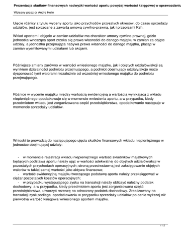 Prezentacja skutków finansowych nadwyżki wartości aportu powyżej wartości księgowej w sprawozdaniu Wpisany przez dr Andre Helin Ujęcie różnicy z tytułu wyceny aportu jako przychodów przyszłych okresów, do czasu sprzedaży udziałów, jest sprzeczne z zawartą umową cywilno-prawną, jak i przepisami Ksh. Wkład aportem i objęcie w zamian udziałów ma charakter umowy cywilno-prawnej, gdzie jednostka wnosząca aport zrzeka się prawa własności do danego majątku w zamian za objęte udziały, a jednostka przejmująca nabywa prawa własności do danego majątku, płacąc w zamian wyemitowanymi udziałami lub akcjami. Późniejsze zmiany zarówno w wartości wniesionego majątku, jak i objętych udziałów/akcji są wynikiem działalności podmiotu przejmującego, a podmiot obejmujący udziały/akcje może dysponować tymi walorami niezależnie od wcześniej wniesionego majątku do podmiotu przejmującego. Różnice w wycenie majątku między wartością ewidencyjną a wartością wynikającą z wkładu niepieniężnego opodatkowuje się w momencie wniesienia aportu, a w przypadku, kiedy przedmiotem wkładu jest zorganizowana część przedsiębiorstwa, opodatkowanie następuje w momencie sprzedaży udziałów. Wnioski te prowadzą do następującego ujęcia skutków finansowych wkładu niepieniężnego w jednostce obejmującej udziały: - w momencie rejestracji wkładu niepieniężnego wartość składników majątkowych będących podstawą aportu należy ująć w wartości adekwatnej do objętych udziałów/akcji w pozostałych przychodach operacyjnych; stroną przeciwstawną jest zaksięgowanie objętych walorów w takiej samej wartości jako aktywa finansowe; - wartość ewidencyjną majątku tworzącego podstawę aportu należy przeksięgować w ciężar pozostałych kosztów operacyjnych; - w przypadku występującego zysku na transakcji należy obliczyć należny podatek dochodowy, a w przypadku, kiedy przedmiotem aportu jest zorganizowana część przedsiębiorstwa, utworzyć rezerwę na odroczony podatek dochodowy. Zrealizowany na transakcji zysk podlega opodatkowaniu w przypadku sprzedaży udziałów po cenie wyższej niż pierwotna wartość księgowa wniesionego aportem majątku. 1/2 Prezentacja skutków finansowych nadwyżki wartości aportu powyżej wartości księgowej w sprawozdaniu Wpisany przez dr Andre Helin Zarówno w praktyce, jak i w literaturze fachowej dają się zaobserwować tendencje do ujęcia różnicy z tytułu wyceny aportu jako przychodów przyszłych okresów, do czasu sprzedaży udziałów. Takie podejście jest sprzeczne z zawartą umową cywilno-prawną, jak i przepisami Kodeksu spółek handlowych. Ujęcie nadwyżki z tytułu wyceny aportu sugeruje bowiem niepewność jednostki sprawozdawczej co do okresu realizacji przychodów lub - co gorzej - kwestionuje realność wyceny aportu. Jak wspomniano, transakcja związana z wniesieniem aportu jest zrealizowana od momentu zarejestrowania objęcia udziałów/akcji. W tym momencie następuje bowiem ostateczna cesja praw własności związanych z aktywami tworzącymi podstawę wkładu niepieniężnego. Nie występuje zatem niepewność co do momentu realizacji przychodów ani też co do okresu ich powstania. Pozostaje więc niepewność co do wyceny wartości aportu, a ta - jak wiadomo - jest sprzeczna z postanowieniem Kodeksu spółek handlowych. 2/2