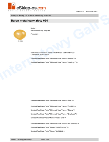 Utworzono : 04 marzec 2017 S li Balony > Balony 12" > Balon metaliczny złoty 060 Balon metaliczny złoty 060 a G y w o t e n r Model : - Balon metaliczny złoty 060 Producent : - DefSemiHidden="true" DefQFormat="false" DefPriority="99" LatentStyleCount="267"> UnhideWhenUsed="false" QFormat="true" Name="Normal" /> e t in UnhideWhenUsed="false" QFormat="true" Name="heading 1" /> UnhideWhenUsed="false" QFormat="true" Name="Title" /> UnhideWhenUsed="false" QFormat="true" Name="Subtitle" /> UnhideWhenUsed="false" QFormat="true" Name="Strong" /> UnhideWhenUsed="false" QFormat="true" Name="Emphasis" /> UnhideWhenUsed="false" Name="Table Grid" /> UnhideWhenUsed="false" QFormat="true" Name="No Spacing" /> UnhideWhenUsed="false" Name="Light Shading" /> UnhideWhenUsed="false" Name="Light List" /> kontakt : - [email protected] Strona 1/{nb} Utworzono : 04 marzec 2017 S li Balony > Balony 12" > Balon metaliczny złoty 060 Balon metaliczny złoty 060 a G y w o t e n r UnhideWhenUsed="false" Name="Light Grid" /> UnhideWhenUsed="false" Name="Medium Shading 1" /> UnhideWhenUsed="false" Name="Medium Shading 2" /> UnhideWhenUsed="false" Name="Medium List 1" /> UnhideWhenUsed="false" Name="Medium List 2" /> UnhideWhenUsed="false" Name="Medium Grid 1" /> UnhideWhenUsed="false" Name="Medium Grid 2" /> UnhideWhenUsed="false" Name="Medium Grid 3" /> e t in UnhideWhenUsed="false" Name="Dark List" /> UnhideWhenUsed="false" Name="Colorful Shading" /> UnhideWhenUsed="false" Name="Colorful List" /> UnhideWhenUsed="false" Name="Colorful Grid" /> UnhideWhenUsed="false" Name="Light Shading Accent 1" /> UnhideWhenUsed="false" Name="Light List Accent 1" /> UnhideWhenUsed="false" Name="Light Grid Accent 1" /> UnhideWhenUsed="false" Name="Medium Shading 1 Accent 1" /> UnhideWhenUsed="false" Name="Medium Shading 2 Accent 1" /> UnhideWhenUsed="false" Name="Medium List 1 Accent 1" /> UnhideWhenUsed="false" QFormat="true" Name="List Paragraph" /> UnhideWhenUsed="false" QFormat="true" Name="Quote" /> UnhideWhenUsed="false" QFormat="true" Name="Intense Quote" /> UnhideWhenUsed="false" Name="Medium List 2 Accent 1" /> UnhideWhenUsed="false" Name="Medium Grid 1 Accent 1" /> UnhideWhenUsed="false" Name="Medium Grid 2 Accent 1" /> UnhideWhenUsed="false" Name="Medium Grid 3 Accent 1" /> UnhideWhenUsed="false" Name="Dark List Accent 1" /> UnhideWhenUsed="false" Name="Colorful Shading Accent 1" /> kontakt : - [email protected] Strona 2/{nb} Utworzono : 04 marzec 2017 S li Balony > Balony 12" > Balon metaliczny złoty 060 Balon metaliczny złoty 060 a G y w o t e n r UnhideWhenUsed="false" Name="Colorful List Accent 1" /> UnhideWhenUsed="false" Name="Colorful Grid Accent 1" /> UnhideWhenUsed="false" Name="Light Shading Accent 2" /> UnhideWhenUsed="false" Name="Light List Accent 2" /> UnhideWhenUsed="false" Name="Light Grid Accent 2" /> UnhideWhenUsed="false" Name="Medium Shading 1 Accent 2" /> UnhideWhenUsed="false" Name="Medium Shading 2 Accent 2" /> UnhideWhenUsed="false" Name="Medium List 1 Accent 2" /> e t in UnhideWhenUsed="false" Name="Medium List 2 Accent 2" /> UnhideWhenUsed="false" Name="Medium Grid 1 Accent 2" /> UnhideWhenUsed="false" Name="Medium Grid 2 Accent 2" /> UnhideWhenUsed="false" Name="Medium Grid 3 Accent 2" /> UnhideWhenUsed="false" Name="Dark List Accent 2" /> UnhideWhenUsed="false" Name="Colorful Shading Accent 2" /> UnhideWhenUsed="false" Name="Colorful List Accent 2" /> UnhideWhenUsed="false" Name="Colorful Grid Accent 2" /> UnhideWhenUsed="false" Name="Light Shading Accent 3" /> UnhideWhenUsed="false" Name="Light List Accent 3" /> UnhideWhenUsed="false" Name="Light Grid Accent 3" /> UnhideWhenUsed="false" Name="Medium Shading 1 Accent 3" /> UnhideWhenUsed="false" Name="Medium Shading 2 Accent 3" /> UnhideWhenUsed="false" Name="Medium List 1 Accent 3" /> UnhideWhenUsed="false" Name="Medium List 2 Accent 3" /> UnhideWhenUsed="false" Name="Medium Grid 1 Accent 3" /> UnhideWhenUsed="false" Name="Medium Grid 2 Accent 3" /> UnhideWhenUsed="false" Name="Medium Grid 3 Accent 3" /> UnhideWhenUsed="false" Name="Dark List Accent 3" /> kontakt : - [email protected] Strona 3/{nb} Utworzono : 04 marzec 2017 S li Balony > Balony 12" > Balon metaliczny złoty 060 Balon metaliczny złoty 060 a G y w o t e n r UnhideWhenUsed="false" Name="Colorful Shading Accent 3" /> UnhideWhenUsed="false" Name="Colorful List Accent 3" /> UnhideWhenUsed="false" Name="Colorful Grid Accent 3" /> UnhideWhenUsed="false" Name="Light Shading Accent 4" /> UnhideWhenUsed="false" Name="Light List Accent 4" /> UnhideWhenUsed="false" Name="Light Grid Accent 4" /> UnhideWhenUsed="false" Name="Medium Shading 1 Accent 4" /> UnhideWhenUsed="false" Name="Medium Shading 2 Accent 4" /> UnhideWhenUsed="false" Name="Medium List 1 Accent 4" /> i e t n UnhideWhenUsed="false" Name="Medium List 2 Accent 4" /> UnhideWhenUsed="false" Name="Medium Grid 1 Accent 4" /> UnhideWhenUsed="false" Name="Medium Grid 2 Accent 4" /> UnhideWhenUsed="false" Name="Medium Grid 3 Accent 4" /> UnhideWhenUsed="false" Name="Dark List Accent 4" /> UnhideWhenUsed="false" Name="Colorful Shading Accent 4" /> UnhideWhenUsed="false" Name="Colorful List Accent 4" /> UnhideWhenUsed="false" Name="Colorful Grid Accent 4" /> UnhideWhenUsed="false" Name="Light Shading Accent 5" /> UnhideWhenUsed="false" Name="Light List Accent 5" /> UnhideWhenUsed="false" Name="Light Grid Accent 5" /> UnhideWhenUsed="false" Name="Medium Shading 1 Accent 5" /> UnhideWhenUsed="false" Name="Medium Shading 2 Accent 5" /> UnhideWhenUsed="false" Name="Medium List 1 Accent 5" /> UnhideWhenUsed="false" Name="Medium List 2 Accent 5" /> UnhideWhenUsed="false" Name="Medium Grid 1 Accent 5" /> UnhideWhenUsed="false" Name="Medium Grid 2 Accent 5" /> UnhideWhenUsed="false" Name="Medium Grid 3 Accent 5" /> UnhideWhenUsed="false" Name="Dark List Accent 5" /> kontakt : - [email protected] Strona 4/{nb} Utworzono : 04 marzec 2017 S li Balony > Balony 12" > Balon metaliczny złoty 060 Balon metaliczny złoty 060 a G y w o t e n r Unh