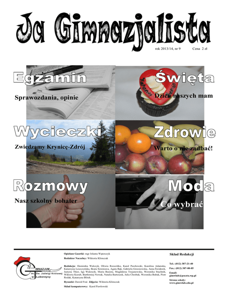 rok 2013/14, nr 9 Cena 2 zł Sprawozdania, opinie Dzień naszych mam Zwiedzamy Krynicę-Zdrój Warto o nie zadbać! Nasz szkolny bohater Co wybrać? Opiekun Gazetki: mgr Jolanta Wątorczyk Skład Redakcji Redaktor Naczelny: Wiktoria Klimczak Tel.: (012) 387-21-40 Redakcja: Dominika Walczyk, Oliwia Rzeszótko, Karol Pawłowski, Karolina Adamska, Katarzyna Leszczyńska, Beata Szreniawa, Agata Bąk, Gabriela Grzesiowska, Anna Świderek, Justyna Thier, Iga Walencik, Maria Basista, Magdalena Trojanowska, Weronika Stachnik, Wiktoria Kozub, Bartłomiej Nowak, Natalia Bartoszek, Julia Chrobak, Weronika Bubak, Piotr Rodak, Katarzyna Blitek. Rysunki: Dawid Fraś Zdjęcia: Wiktoria Klimczak Skład komputerowy: Karol Pawłowski Fax.: (012) 387-00-85 Email: [email protected] Strona szkoły: www.gimwlub.edu.pl WSTĘPNIAK Maj to oczekiwana końcówka roku szkolnego. Zaczęły się poprawy testów, błaganie nauczycieli o lepsze stopnie - czyli coroczne, nieodmienne zjawisko. Na ocenach zależy głównie trzecioklasistom, którzy zdają sobie sprawę, że każdy punkt jest ważny przy rekrutacji. A egzamin gimnazjalny już za nami. Jak Ci poszło? Zdania są bardzo podzielone - jedni uważają, że było łatwo, drudzy wręcz przeciwnie. Tak naprawdę dużo zależało od szczęścia - czy trafiły się tematy, które akurat powtórzyłeś. O tym czytaj w dalszej części gazetki. Konkursy, wyjazdy — ostatnio ciągle o tym mowa. Zacznijmy od tego, co było. Tuż po egzaminach klasy trzecie, aby trochę się odprężyć oraz nabrać sił, wyruszyły do Krynicy! Wiele się działo, każdy z nas wspomina wyjazd miło. Chcesz dowiedzieć się szczegółów? Czytaj na stronie ósmej. A co nas czeka? Wyjazd dla setki uczniów nad morze. To nagroda za solidne uczęszczanie na zajęcia unijne. Wyjeżdżamy 26 maja do Jastrzębiej Góry. Naszemu redakcyjnemu koledze Karolowi Pawłowskiemu oraz mnie udało się zdobyć trzecie Tak trzecioklasiści wypoczywali w Krynicy! miejsce w XX Sesji Sejmu Dzieci i Młodzieży. W związku z tym 31 maja z Jastrzębiej Góry jedziemy do Gdańska, wyruszamy do Warszawy, aby dzień później zwiedzić Sejm oraz wziąć udział w ogólnopolskich obradach. Skoro o Karolu mowa, to należą mu się wielkie gratulacje za zwycięstwo w konkursie „Znajomość języków - paszportem do Europy”. Konkurs składał się z trzech etapów, które dla Karola zakończyły się ogromnym sukcesem. Nagrodą jest wyjazd do Brukseli. Wielkie brawa! Jak dobrze wiecie w naszej szkole działa Stowarzyszenie Wspierające Rozwój Dzieci i Młodzieży „Szansa”, które ostatnio obchodziło Jubileusz dziesięciolecia. Uroczyste spotkanie odbyło się 15 maja. Serdecznie gratulujemy oraz życzymy kolejnych jubileuszy. Miesiąc jakim jest maj, kojarzy się wszystkim ze świętem naszych kochanych mam. W związku z tym w majowym wydaniu zamieszczamy dodatek specjalny poświęcony temu świętu. Coraz częściej kładzie się nacisk na propagowanie sportu i zdrowego odżywiania, dlatego postanowiliśmy porozmawiać o tym z naszą nauczycielką wychowania fizycznego - panią Sylwią Kuźniar. Nasza redakcja postanowiła zebrać wasze opinie na temat wychowania fizycznego - o tym na stronie 20 i 21. Oprócz tego jak zawsze Plotki, Na językach - tym razem klasa III e oraz zdrowa dawka humoru. Życzę wszystkim miłego czytania! Wiktoria Str. 2 rok 2013/14, nr 9 Z ŻYCIA SZKOŁY Koncert chóru Majówka bawarska Wycieczka do Krynicy Ja Gimnazjalista Str. 3 AKTUALNOŚCI Zapominamy o tej bardzo ważnej dacie dla naszej ojczyzny. Często odbieramy tę datę jako kolejną nudną akademię bądź przerwę w lekcjach. Dzięki akademiom poświęconym ważnym wydarzeniom dla Polski, poszerzamy wiedzę na historyczne tematy. Podobnie jest ze świętem przypadającym w dniu 3 maja. W szkole, obchodach państwowych upamiętniamy Święto Konstytucji poprzez organizowanie akademii, prelekcji, a nawet festynów. Wymaga to od nas - młodzieży szczerych chęci, by włączyć się w te działania. W tym roku akademia odbyła się w dniu 30 kwietnia. Przed uczniami i nauczycielami wystąpili uczniowie klasy pierwszej i zespół VaBank, który zadbał o odpowiedni dobór repertuaru. Przedstawienie przygotowała wraz z uczniami pani Agnieszka Frączek-Prusak. ` Występ możemy zaliczyć do udanych. Uczniowie klasy pierwszej po męczących próbach pokazali na co ich stać. Publiczność jak zwykle nie była zbyt zainteresowana akademią, ale mam nadzieje, że wsłuchali się choć trochę i wynieśli nieco wiedzy z tego przedstawienia. W końcu nie dla wszystkich historia naszego kraju jest tylko i wyłącznie nudną lekcją. Magdalena Trojanowska Kanonizacja naszego rodaka Jana Pawła II, która odbyła się 27 kwietnia br., była dla całej Polski wielkim wydarzeniem. Wszyscy obywatele musieli zmierzyć się z faktem, iż człowiek którego szanowali, kochali, a często też znali… został Świętym. Człowiek który urodził się ściele p.w. Podwyższenia Krzyża Koncert okazał się strzałem na ziemi polskiej, w niedalekich od Świętego w Luborzycy o godzinie w dziesiątkę! Zachwyceni uczestnicy Krakowa Wadowicach, został wy- 18.00 mogliśmy oglądnąć i posłu- mszy św. nie chcieli wychodzić z kobrany przez Boga. ścioła. Prosili o liczne Choć dla wielu z bisy, a na sam koniec nas wydarzenie nie wszyscy razem cały było zaskoczeniem, zaśpiewaliśmy to wzruszenie dla „Barkę” - ulubiony mądrości Papieża utwór Jana Pawła II. Polaka było ogromUważam, że ne. to wydarzenie było Dla uczniów naszego gimnazjum było to również wielkie ś więt o, zwłaszcza iż Karol Wojtyła powszechnie na z ywa ny „Papieżem młodzieży”, jest bliski sercom naszych rodziców, a przez to i nam. Datego chór szkolny pod kierunkiem dr Lucyny Rotter przygotował piękny koncert, opowiadający o życiu Jana Pawła II. Dzień przed wielkim dniem kanonizacji w KoStr. 4 chać wzruszających piosenek poświęconych 