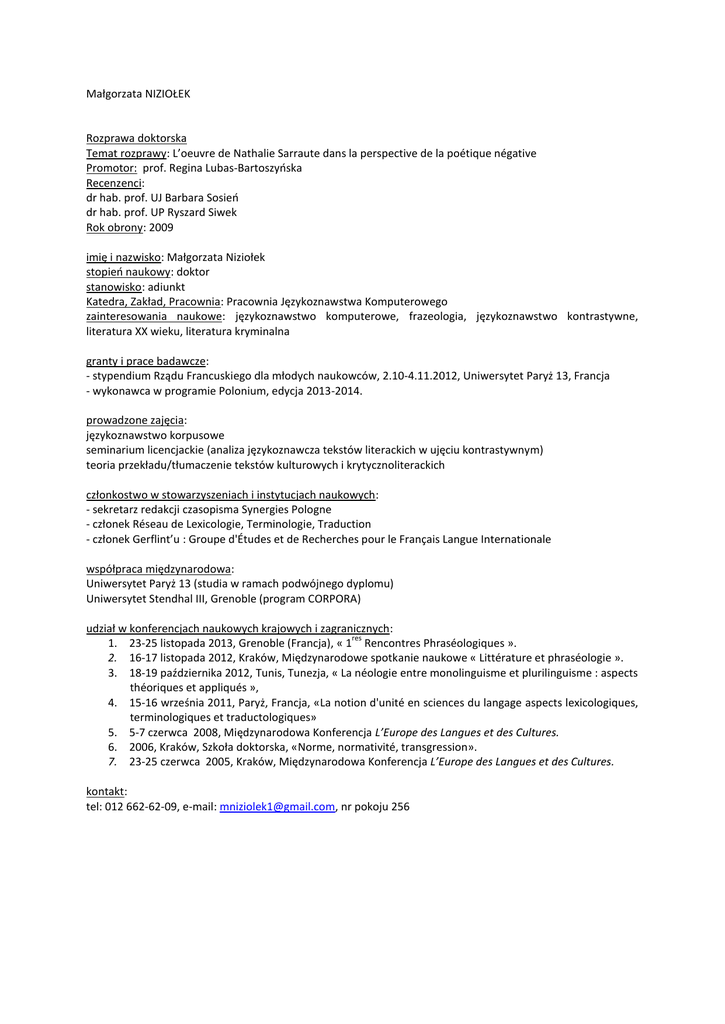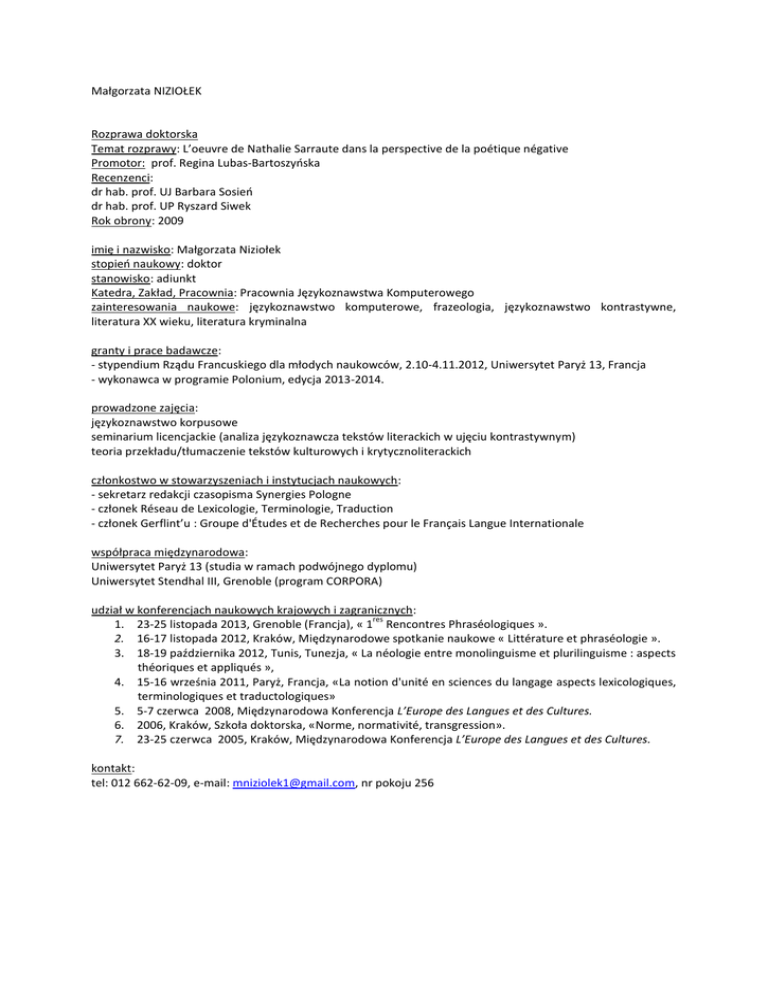 Małgorzata NIZIOŁEK Rozprawa doktorska Temat rozprawy: L