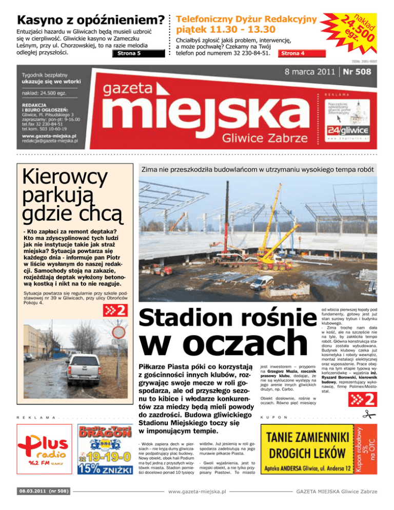 Entuzjaści hazardu w Gliwicach będą musieli uzbroić się w cierpliwość. Gliwickie kasyno w Zameczku Leśnym, przy ul. Chorzowskiej, to na razie melodia odległej przyszłości. Strona 5 ............... Kasyno z opóźnieniem? piątek 11.30 - 13.30 Chciałbyś zgłosić jakiś problem, interwencję, a może pochwałę? Czekamy na Twój telefon pod numerem 32 230-84-51. Strona 4 ........................................................................................................................... Kierowcy parkują gdzie chcą Zima nie przeszkodziła budowlańcom w utrzymaniu wysokiego tempa robót - Kto zapłaci za remont deptaka? Kto ma zdyscyplinować tych ludzi jak nie instytucje takie jak straż miejska? Sytuacja powtarza się każdego dnia - informuje pan Piotr w liście wysłanym do naszej redakcji. Samochody stoją na zakazie, rozjeżdżają deptak wyłożony betonową kostką i nikt na to nie reaguje. Sytuacja powtarza się regularnie przy szkole podstawowej nr 39 w Gliwicach, przy ulicy Obrońców Pokoju 4. Stadion rośnie w oczach R E K L A M A . . . . . . . . . . . . . . . . . Piłkarze Piasta póki co korzystają z gościnności innych klubów, rozgrywając swoje mecze w roli gospodarza, ale od przyszłego sezonu to kibice i włodarze konkurentów zza miedzy będą mieli powody do zazdrości. Budowa gliwickiego Stadionu Miejskiego toczy się w imponującym tempie. - Widok zapiera dech w piersiach – nie kryją dumy gliwiczanie podpatrujący plac budowy. Nowy obiekt, obok hali Podium ma być jedną z przyszłych wizytówek miasta. Stadion pomieści docelowo ponad 10 tysięcy widzów. Już jesienią w roli gospodarza zadebiutują na jego murawie piłkarze Piasta. - Gwoli wyjaśnienia, jest to miejski obiekt, a nie tylko przypisany Piastowi. To miasto jest inwestorem – przypomina Grzegorz Muzia, rzecznik prasowy klubu, dodając, że nie są wykluczone występy na jego arenie innych gliwickich drużyn, np. Carbo. od wbicia pierwszej łopaty pod fundamenty, gotowy jest już stan surowy trybun i budynku klubowego. - Zima trochę nam dała w kość, ale na szczęście nie na tyle, by zakłóciła tempo robót. Główna konstrukcja stadionu została wybudowana. Budynek klubowy czeka już kosmetyka i roboty wewnątrz, montaż instalacji elektrycznej oraz wyposażenie. Prace obejmą na tym etapie typową wykończeniówkę – wyjaśnia inż. Ryszard Borowski, kierownik budowy, reprezentujący wykonawcę, firmę Polimex-Mostostal. Obiekt dosłownie, rośnie w oczach. Równo pięć miesięcy K U P O N . . . . . . . . . . . . . . . . # Kolejna edycja imprezy odbędzie się w Zabrzu 21 maja Strona 11 Nie taka słaba płeć Rozmowa z Lidią Fidurą, mistrzynią Polski w boksie Strona 12 lista gazetników: www.gazeta-miejska.pl/lista.php Strona 11 Święto Rodziny po raz czwarty ............... Postać wybitnego kardiochirurga w obrazie Haliny Szymury ............... Premiera filmu o prof. Relidze W Y D A N I E Z A B R Z A Ń S K I E ..................................................................................................................................... Jeszcze meble i można mieszkać Kolejne rodziny wprowadziły się do nowiutkich mieszkań w Zaborzu Mirosław, Sandra i Agnieszka Staszewscy Czekaliśmy prawie dwa lata, ale warto było. Mamy tu prawie dwukrotnie większy metraż niż w poprzednim mieszkaniu. Więcej przestrzeni, więcej swobody. Tu naprawdę czujemy, że jesteśmy u siebie. Spełniły się nasze marzenia. Klucze do mieszkań nowym lokatorom „spod trzydziestki“ przy Janika wręczyła prezydent miasta Małgorzata Mańka - Szulik. Po południu mogli już przywozić pierwsze meble i urządzać wyczekane metry kwadratowe według swojego uznania. Niczego poprawiać nie muszą. Trzypokojowe, mierzące ponad 61 m. kw. mieszkania są w pełni wykończone: wanny w łazienkach zostały obudowane, podłoga i ściany wypłytkowane, w kuchniach można już gotować na podłączonych kuchenkach elektrycznych. Podłogi w pokojach wyłożono panelami. W każdym mieszkaniu zamontowano indywidualne wymienniki ciepła. Wykonawca zadbał także o „okienko na świat“ - w mieszkaniach znajdują się instalacje sieci telewizji satelitarnej oraz sieć internetowa. Budowa rozpoczęła się w listopadzie 2009 roku. Prace mogły skończyć się wcześniej, ale w międzyczasie zmieniły się przepisy dotyczą- Małgorzata Mańka-Szulik, prezydent Zabrza Mieszkań w Zabrzu przybywa, co jest dobrym prognostykiem zwłaszcza dla młodych ludzi zamierzających w niedalekiej przyszłości założyć rodzinę. Chcemy wyjść im naprzeciw, ułatwić start w dorosłe życie. Nie każdego bowiem stać na zakup własnego mieszkania. Cały czas szukamy w Zabrzu terenów, które ewentualnie moglibyśmy zaadaptować pod budownictwo wielorodzinne. - Miło patrzeć, jak osiedle się rozrasta, a nam przybywa nowych parafian - cieszy się ks. Jerzy Pająk, proboszcz miejscowej parafii Kościoła św. Jadwigi w Zaborzu, który poświęcił nowo oddany blok. - Niech się wam dobrze mieszka - życzyła nowym lokatorom prezydent miasta. (mar) Przebudowa sieci w Pawłowie to największy element II etapu poprawy gospodarki wodno-ściekowej w Zabrzu Są przestrzenne, funkcjonalne i eleganckie. Rodziny, które właśnie otrzymały do nich klucze, mogą mówić, że nareszcie są na swoim. Budynek TBS-u z 24 nowymi mieszkaniami został oddany do użytku przy ulicy ks. Janika w Zaborzu. - Wśród nowych lokatorów, którzy przychodzili do nas jeszcze przed odbiorem budynku, byli i tacy, którym popłynęły łzy wzruszenia. W takim razie, dla nas to podwójny powód do satysfakcji. Przede wszystkim z tego, że daliśmy im tyle radości - uśmiecha się Czesław Krysiak, prezes Międzygminnego Towarzystwa Budownictwa Społecznego w Tarnowskich Górach, spółki pilotującej budowę mieszkań. Budownictwo to priorytet ce finansowania tego typu inwestycji. - Konieczne było wsparcie gminy - mówi Małg